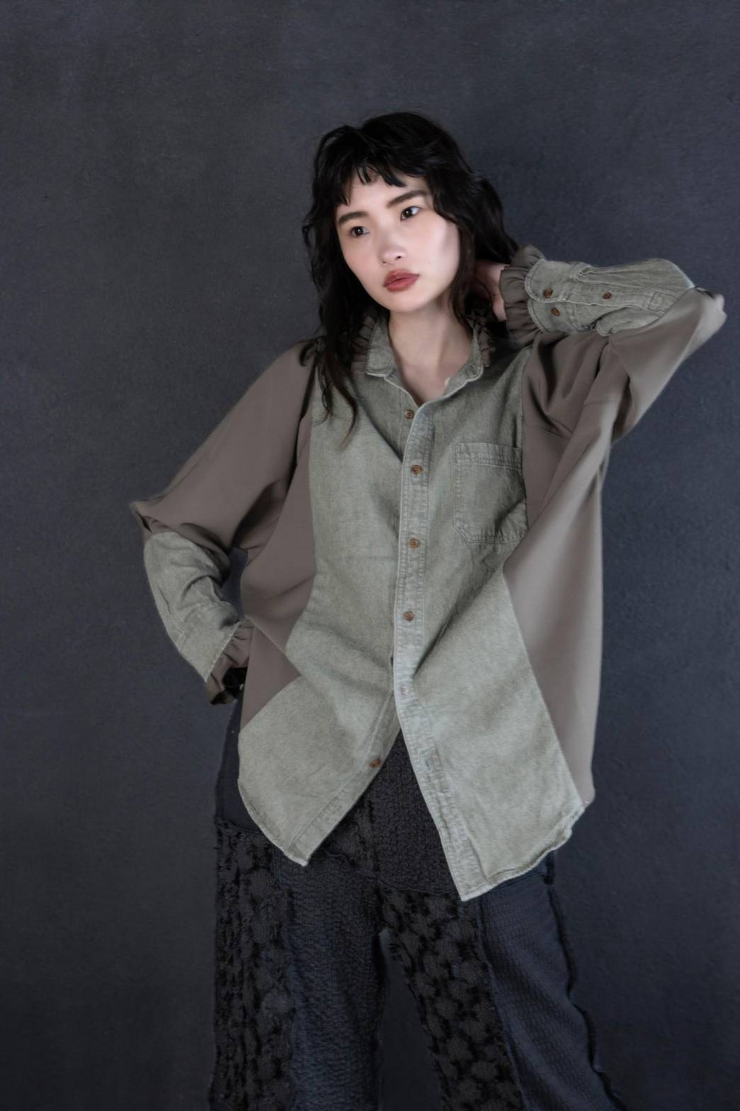 »デザインー古着のシャツを解体し、パターンで構築したサイドパネルを挟み込んで作ったシャツです。