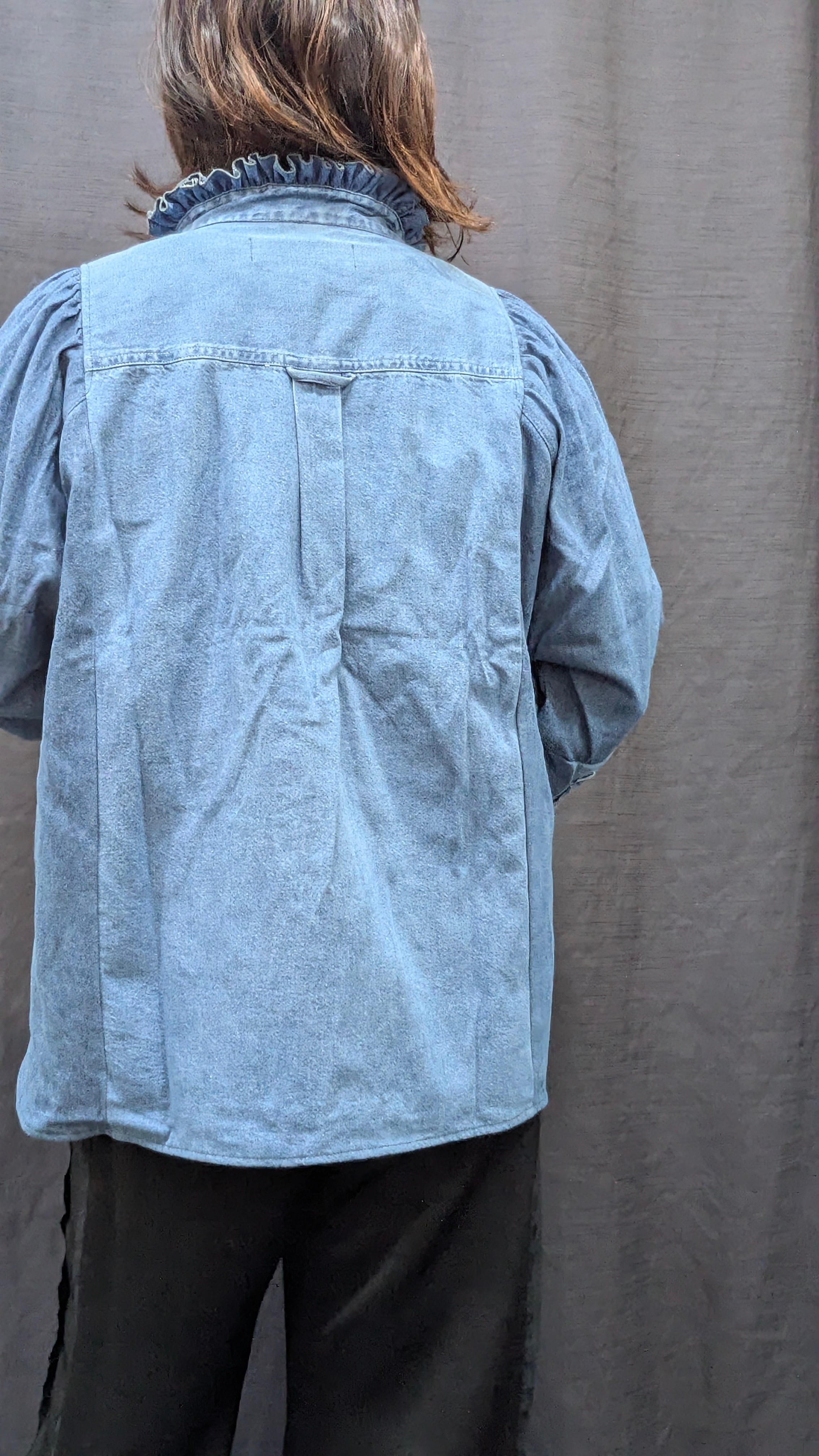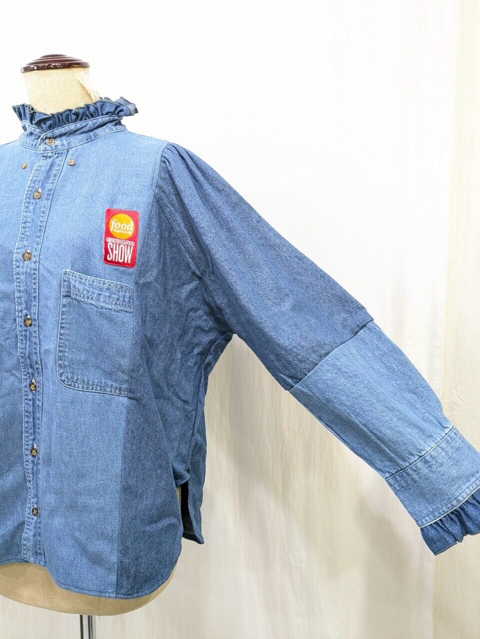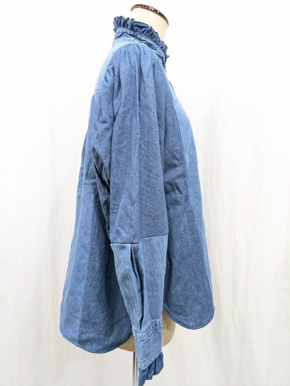 襟と袖口にフリルを施し、ショルダー部分には程よいギャザーが入っているパフショルダーなので、デニムでもレディースらしい一着です。