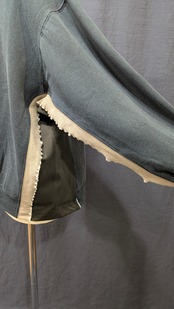 厳選したプリントスウェットの脇に生地を足しFINーヒレの様に見える異素材のリボンを挟み込んでいます。