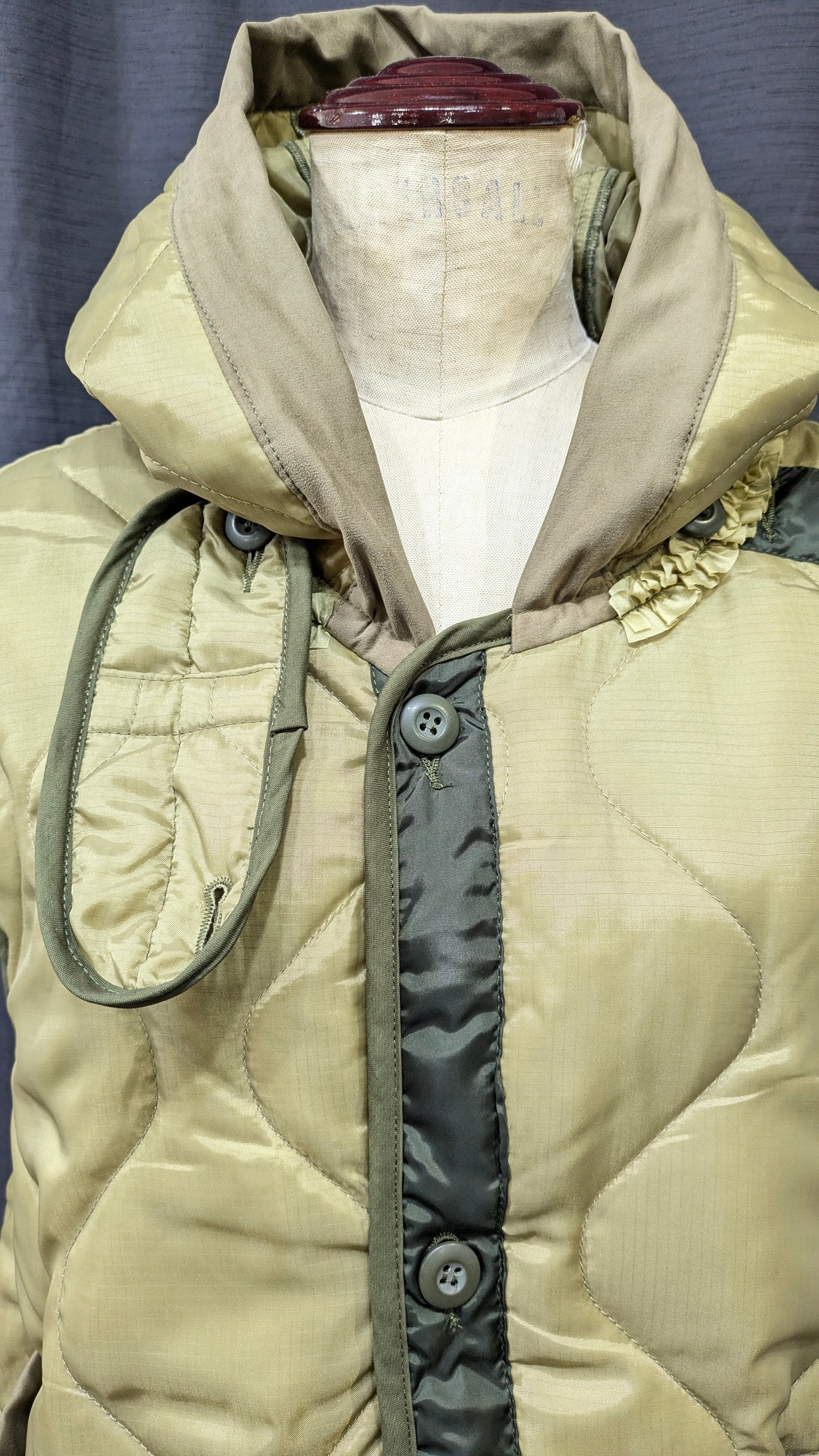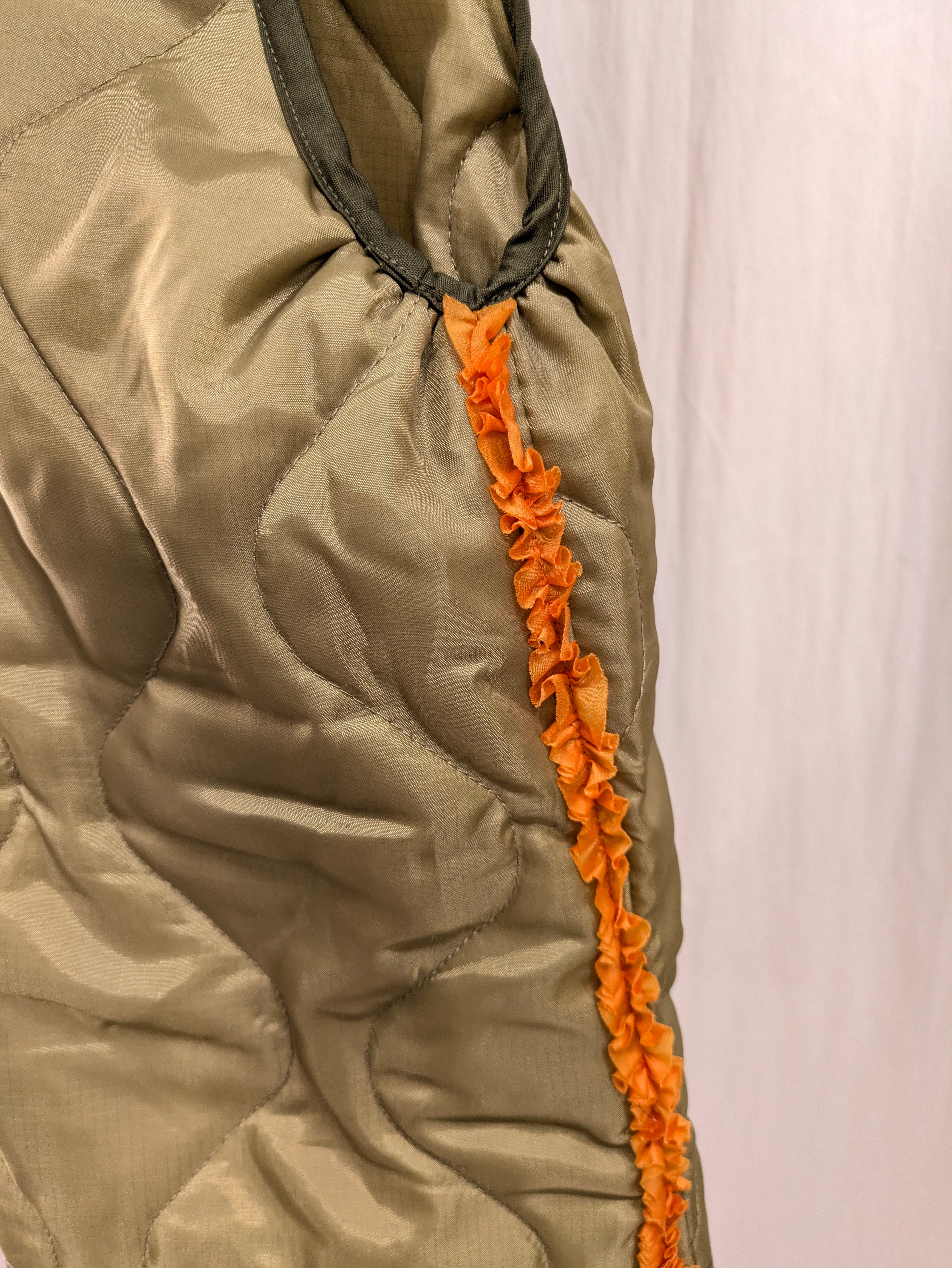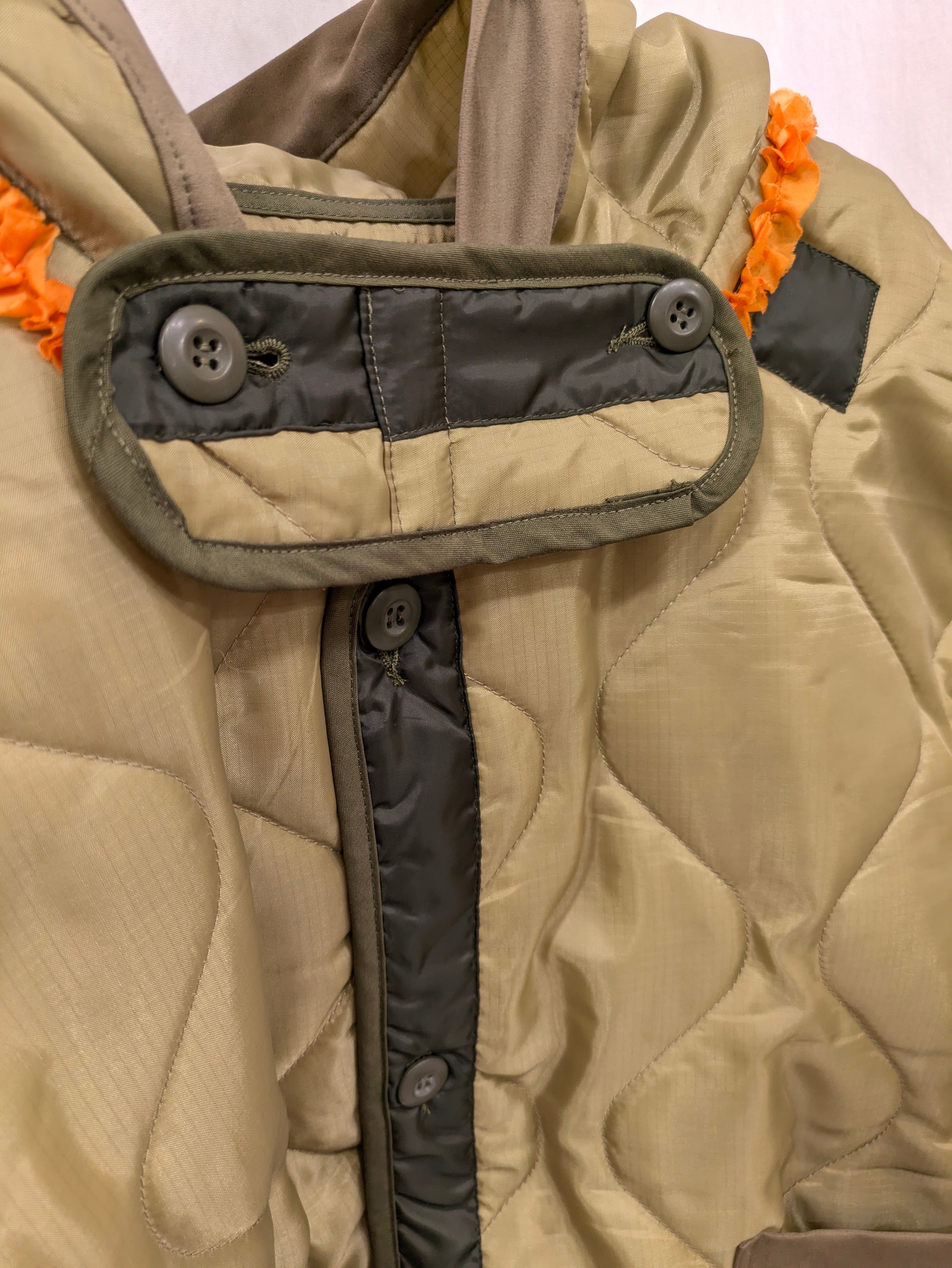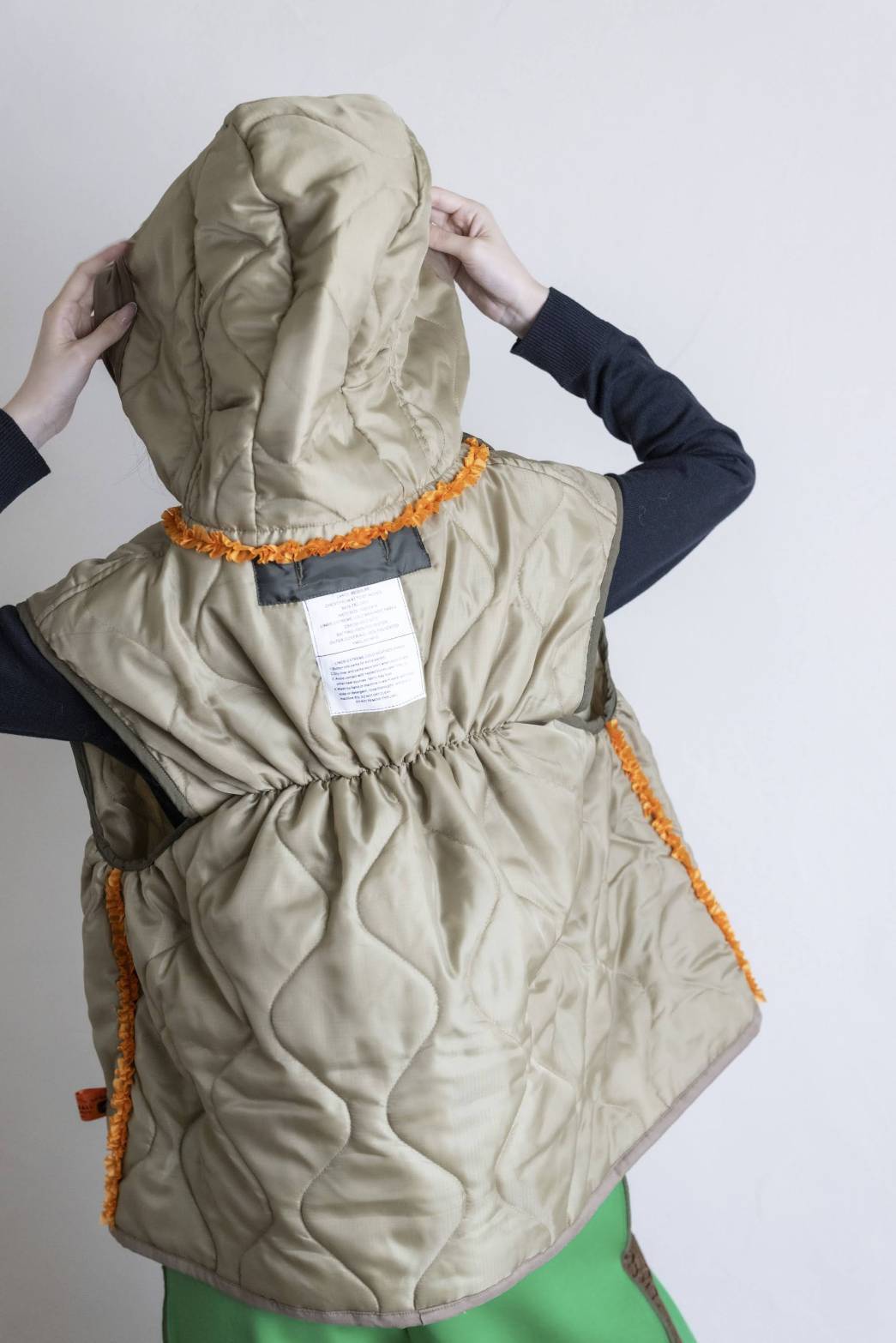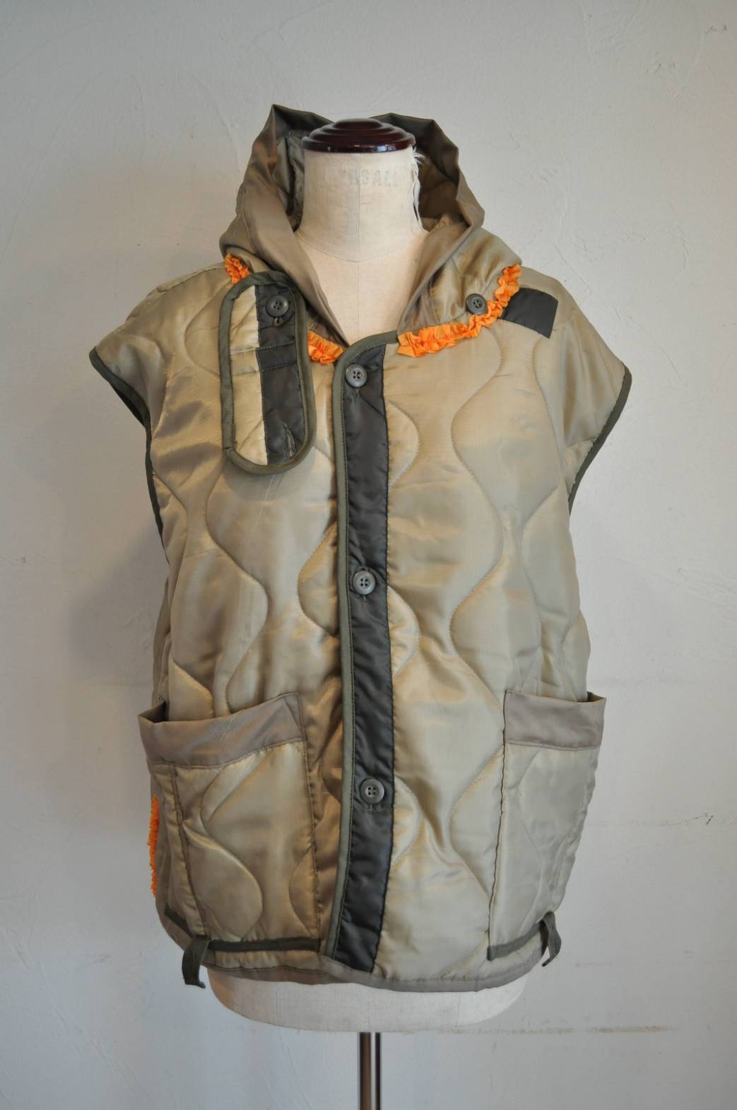 »デザインーライナーフリルジャケットに引き続き、ベストの登場です。ミリタリーコートのライナーをリメイクしています、袖を解体しフードに作り替え,背中部分にはシャーリングを加えることでふっくら丸みのあるチャーミングなシルエットに変身しています。シリーズとしてのフリルも程よくプラスされパッと目を引く可愛らしさではないでしょうか。