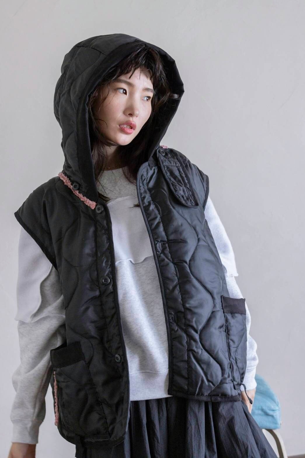 »デザインーライナーフリルジャケットに引き続き、ベストの登場です。ミリタリーコートのライナーをリメイクしています、袖を解体しフードに作り替え,背中部分にはシャーリングを加えることでふっくら丸みのあるチャーミングなシルエットに変身しています。シリーズとしてのフリルも程よくプラスされパッと目を引く可愛らしさではないでしょうか。