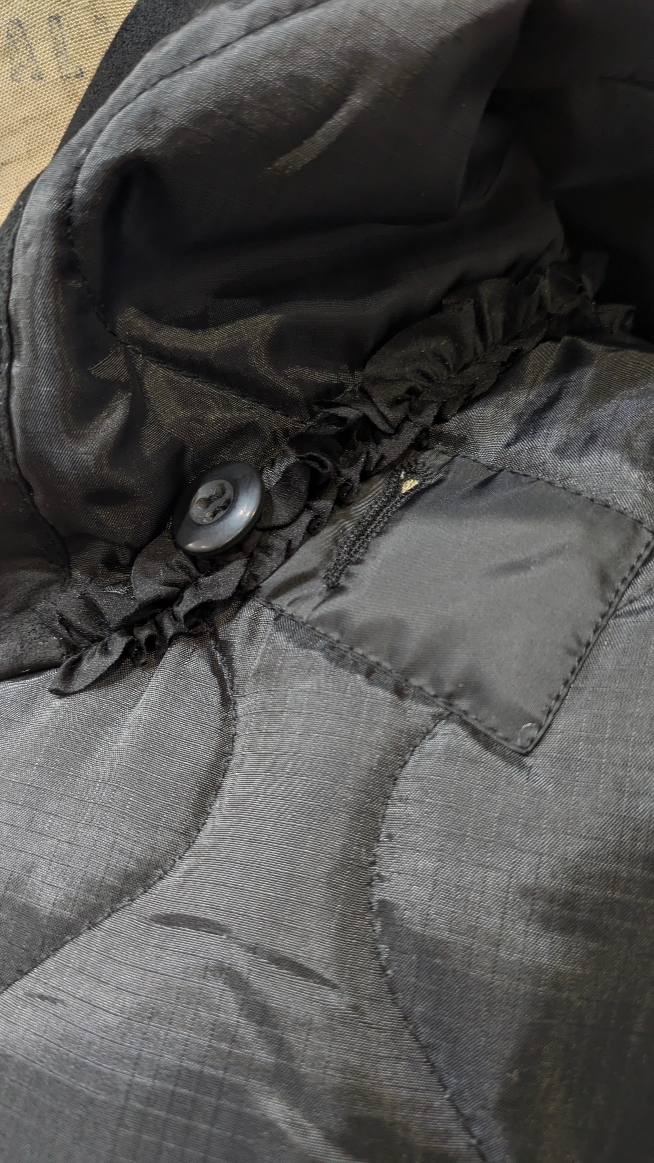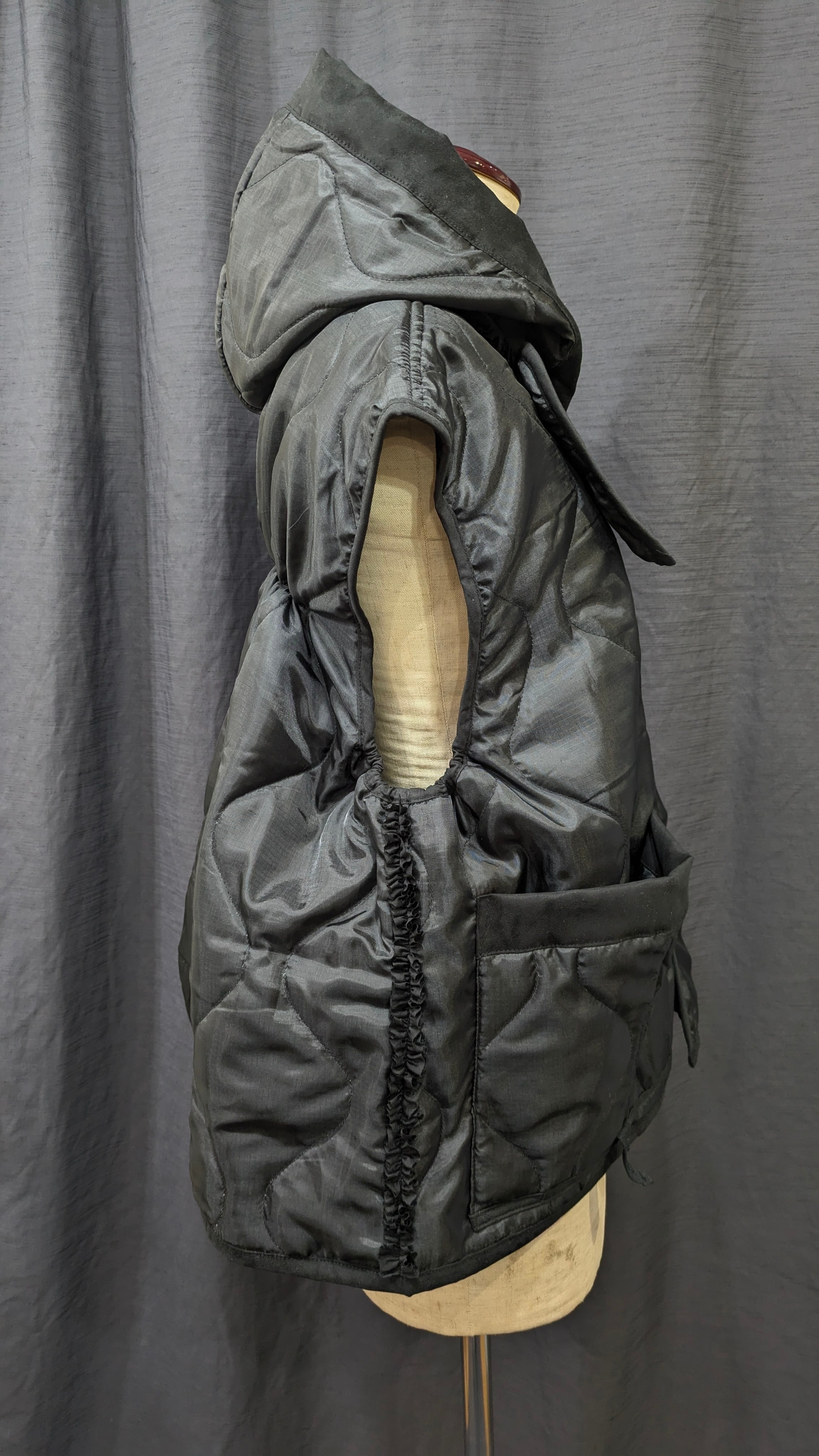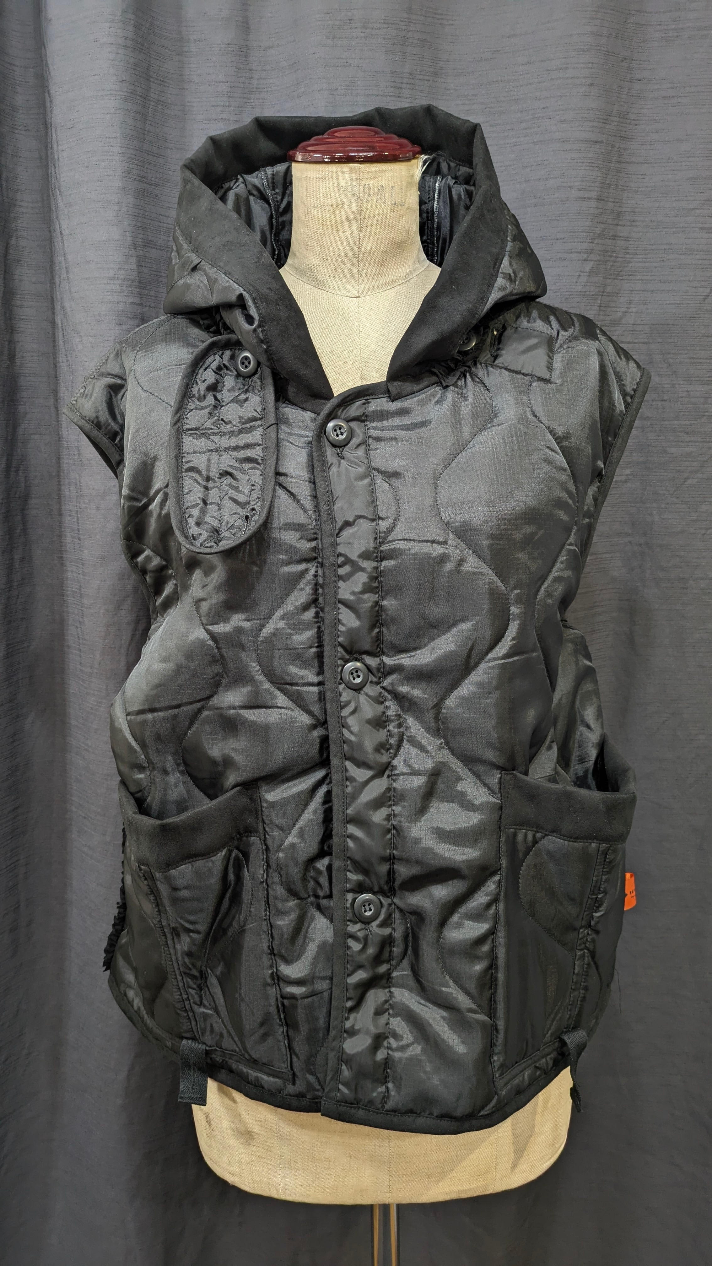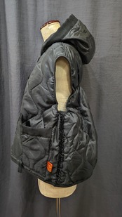 »デザインーライナーフリルジャケットに引き続き、ベストの登場です。ミリタリーコートのライナーをリメイクしています、袖を解体しフードに作り替え,背中部分にはシャーリングを加えることでふっくら丸みのあるチャーミングなシルエットに変身しています。シリーズとしてのフリルも程よくプラスされパッと目を引く可愛らしさではないでしょうか。