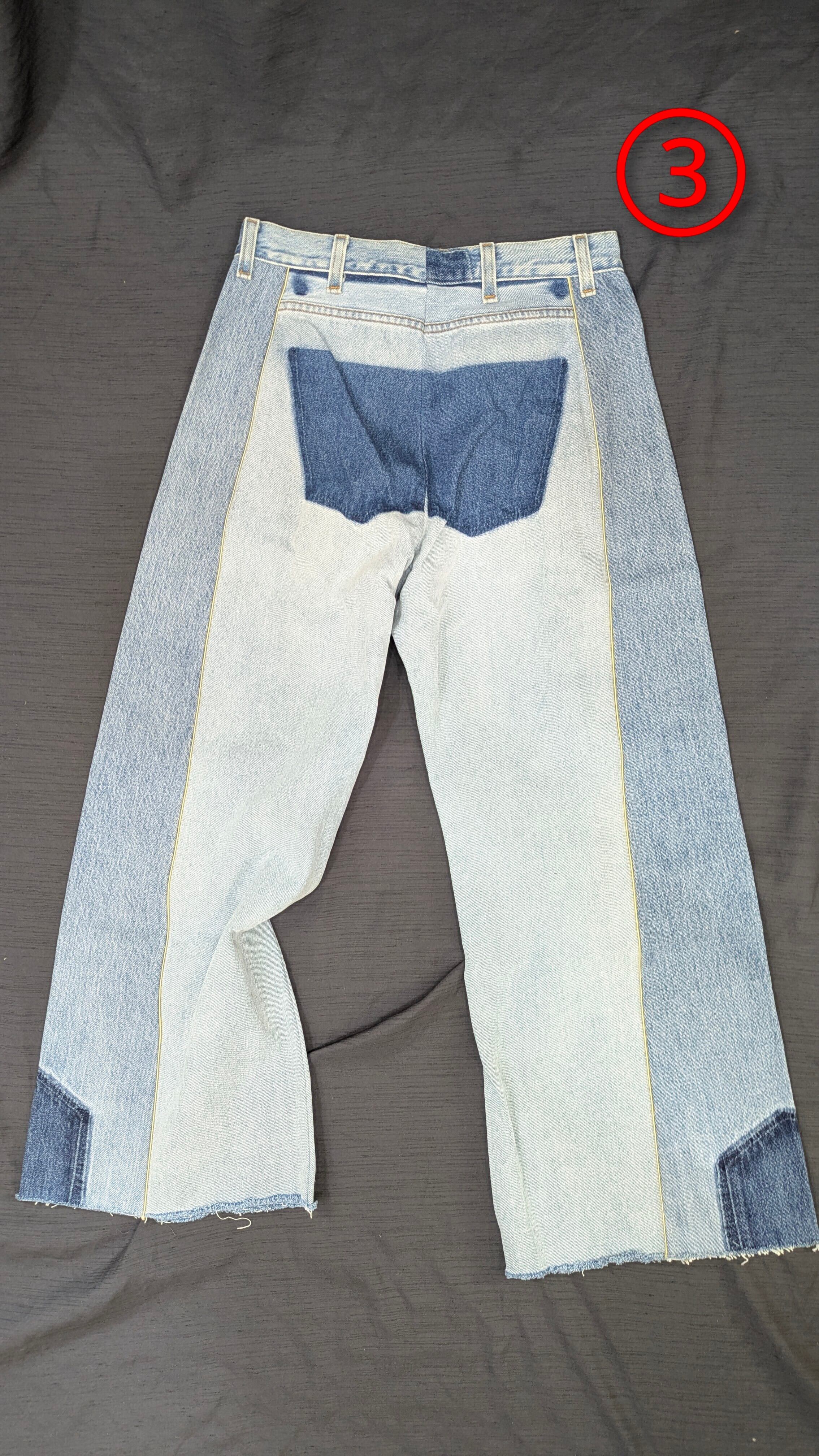 2本のUSEDデニムパンツを使用し、パターンにはめて再構築したデニムです。