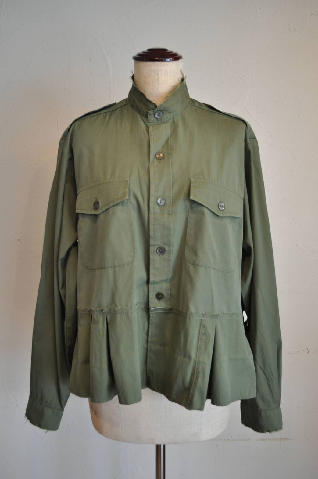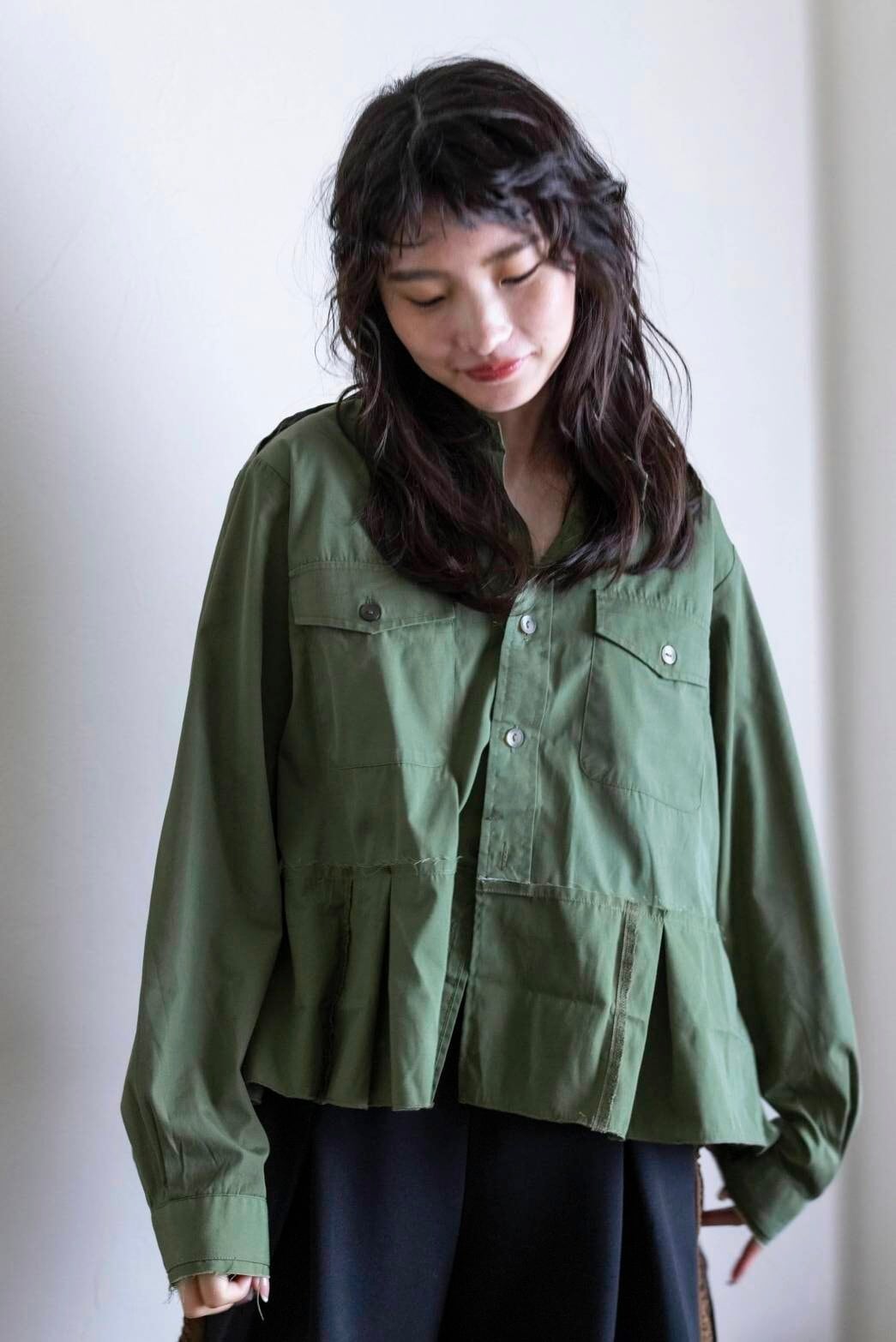 »デザインーイギリス製フィールドシャツをリメイクした、無骨さと女性らしさを両立させるショート丈シャツです。