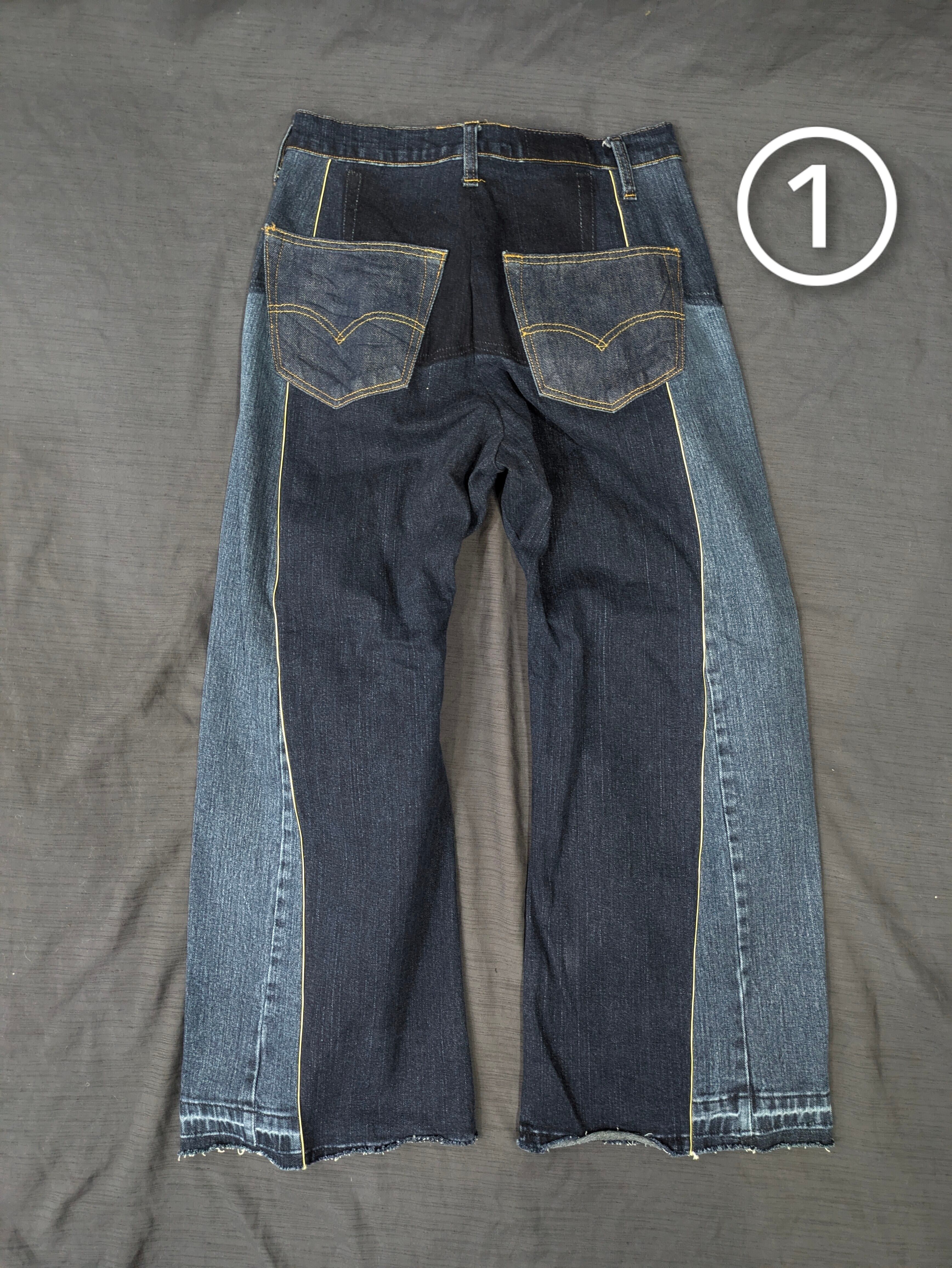 »デザインー古着のデニムを使用し、パターンにはめ2着をドッキングしたアイテムです。