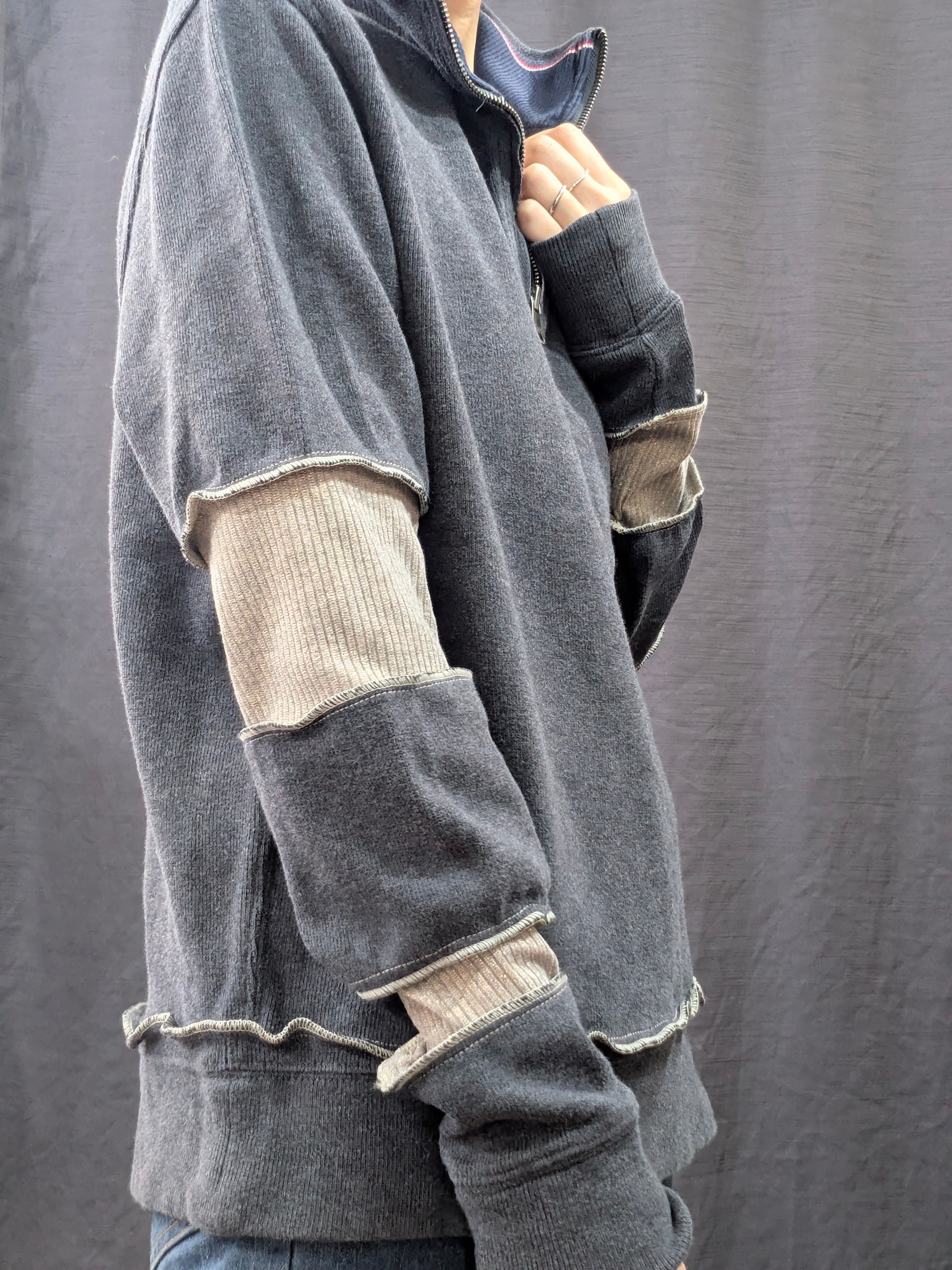 ボーダー状に異素材を挟み込み、面白い形状の袖に。
