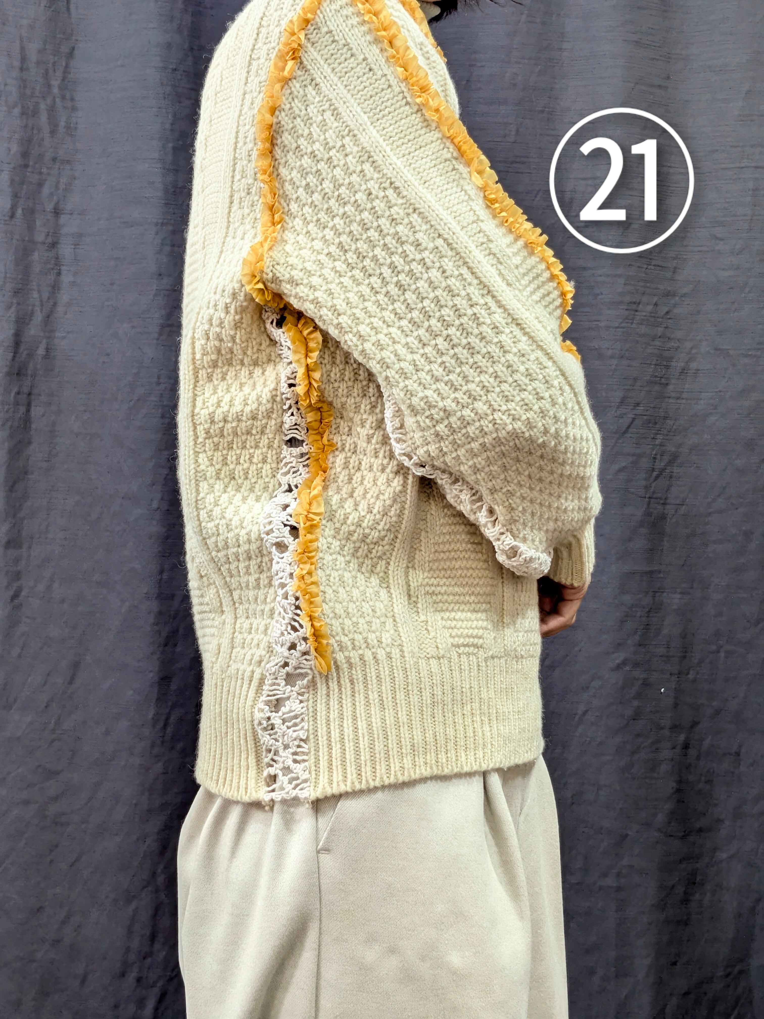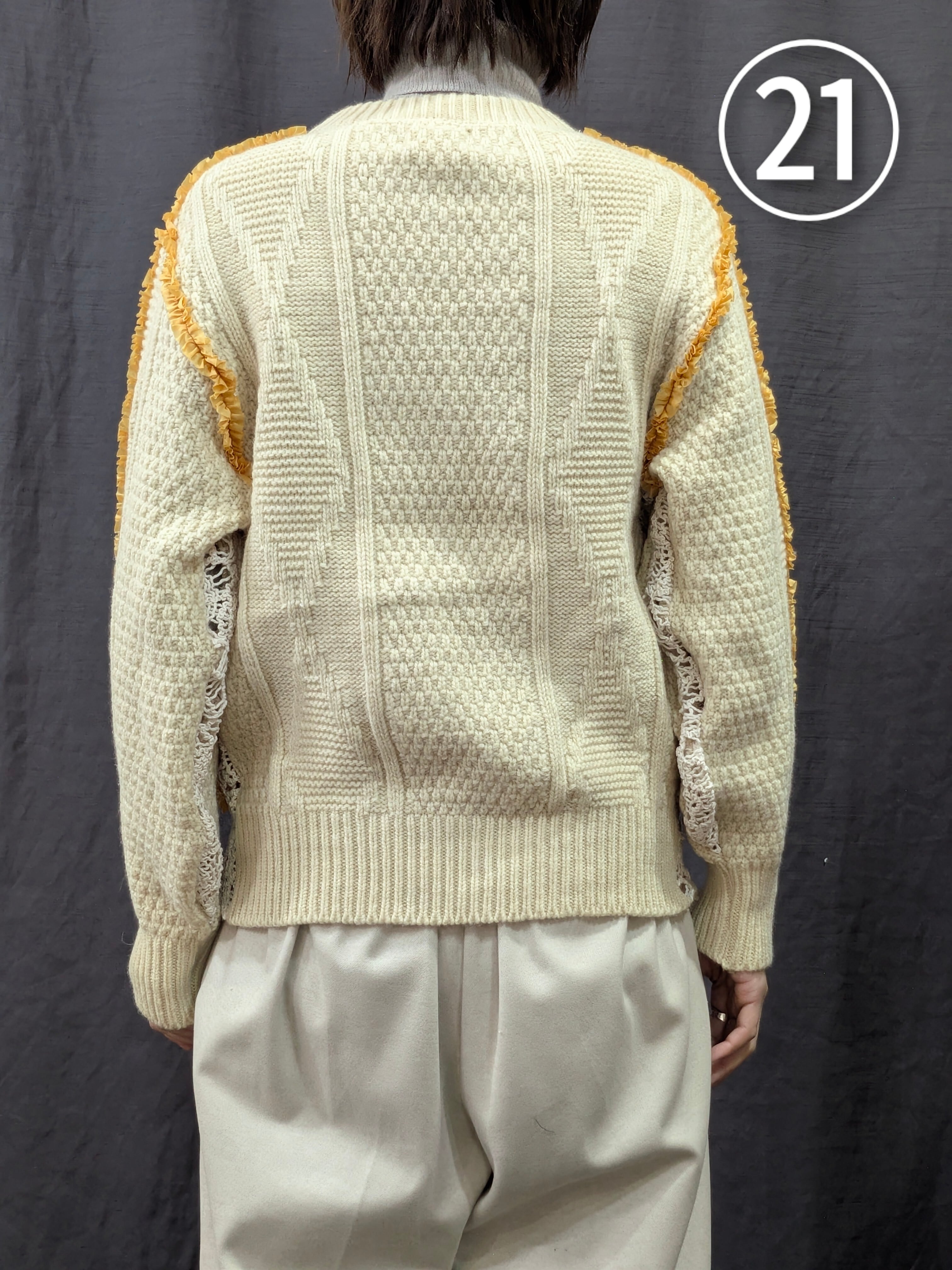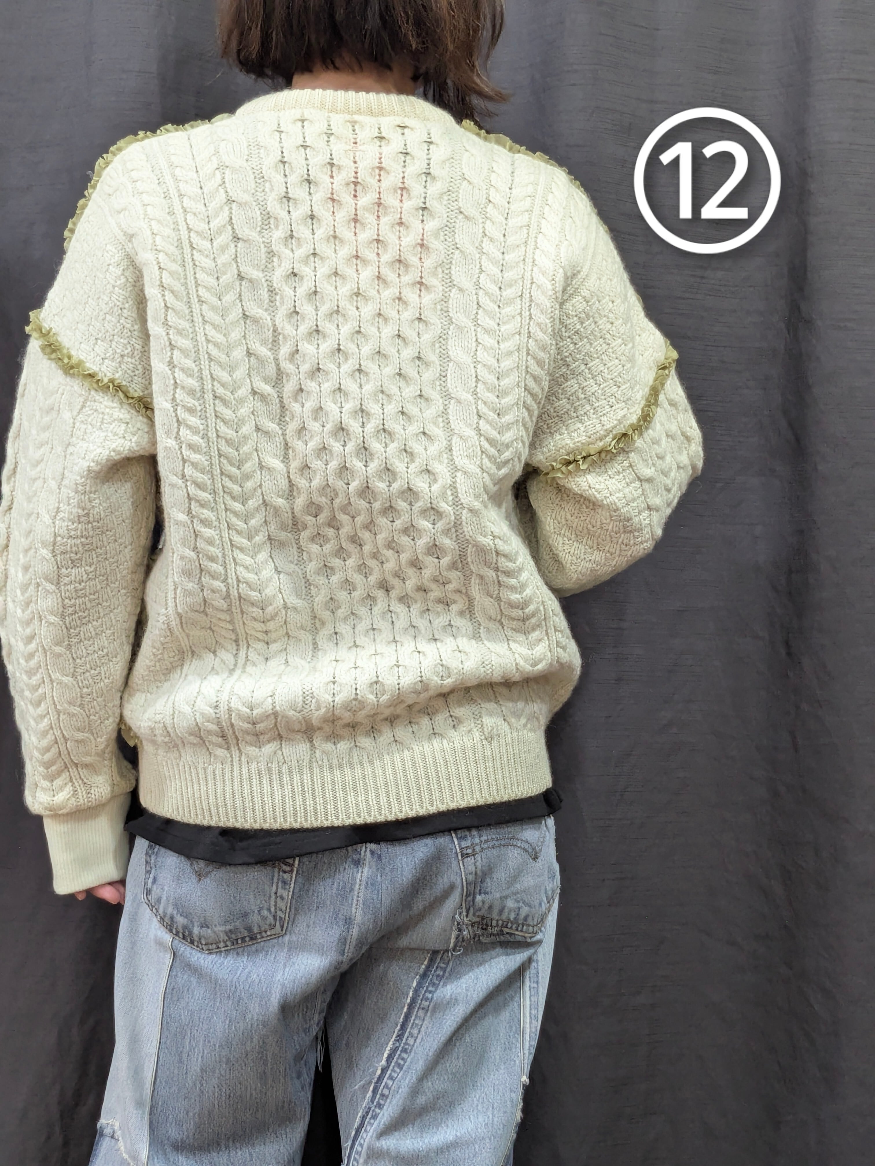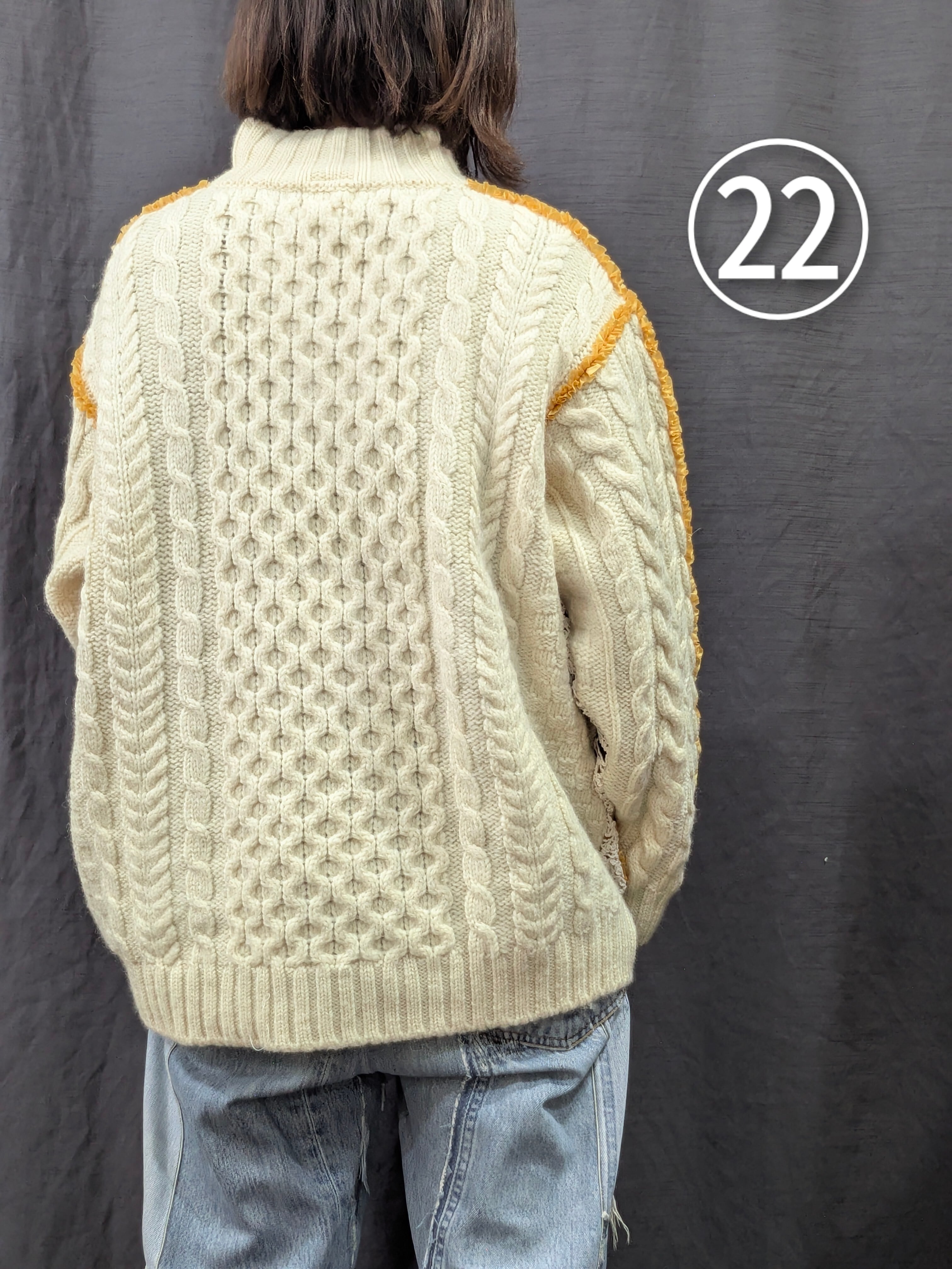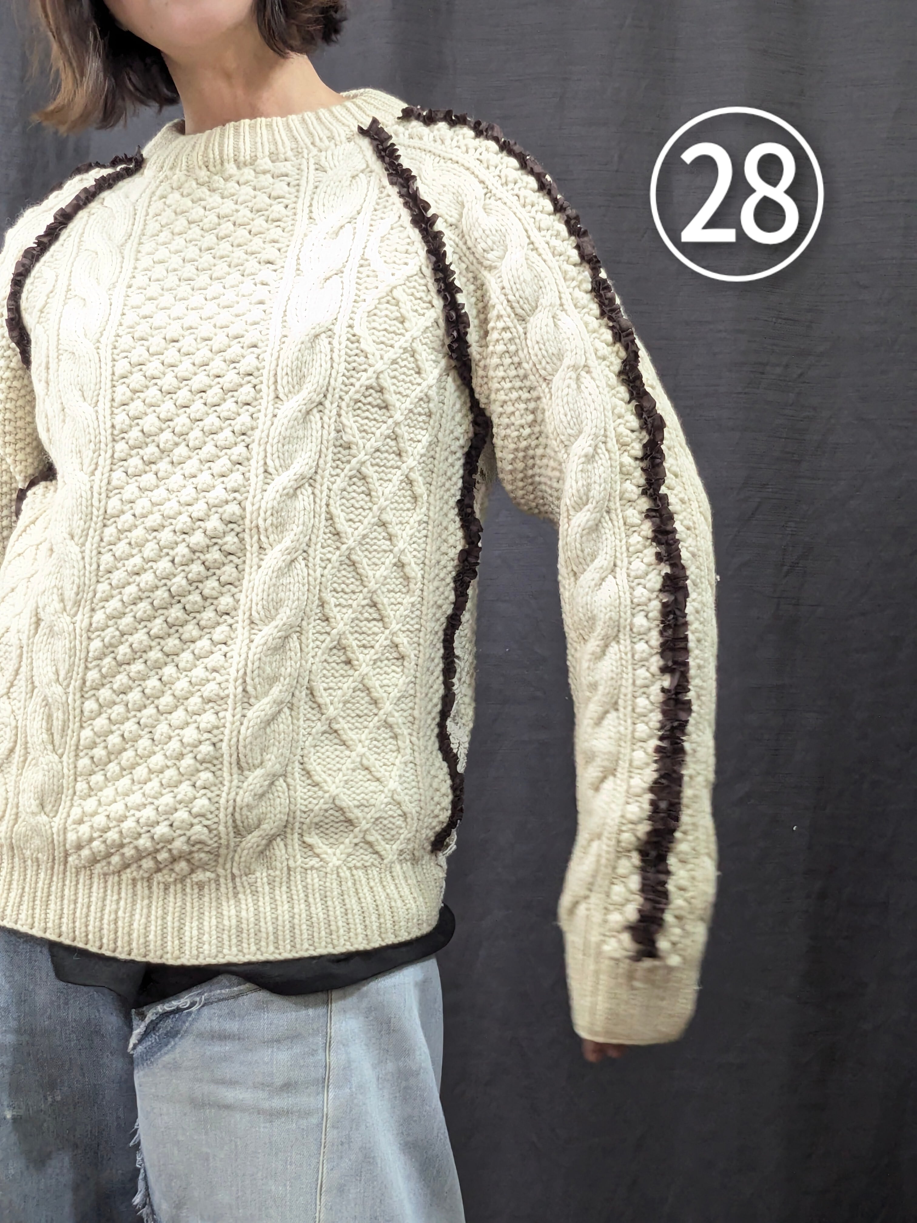 »デザインー古着のフィッシャーマンセーターのシームラインにフリルをあしらいました。