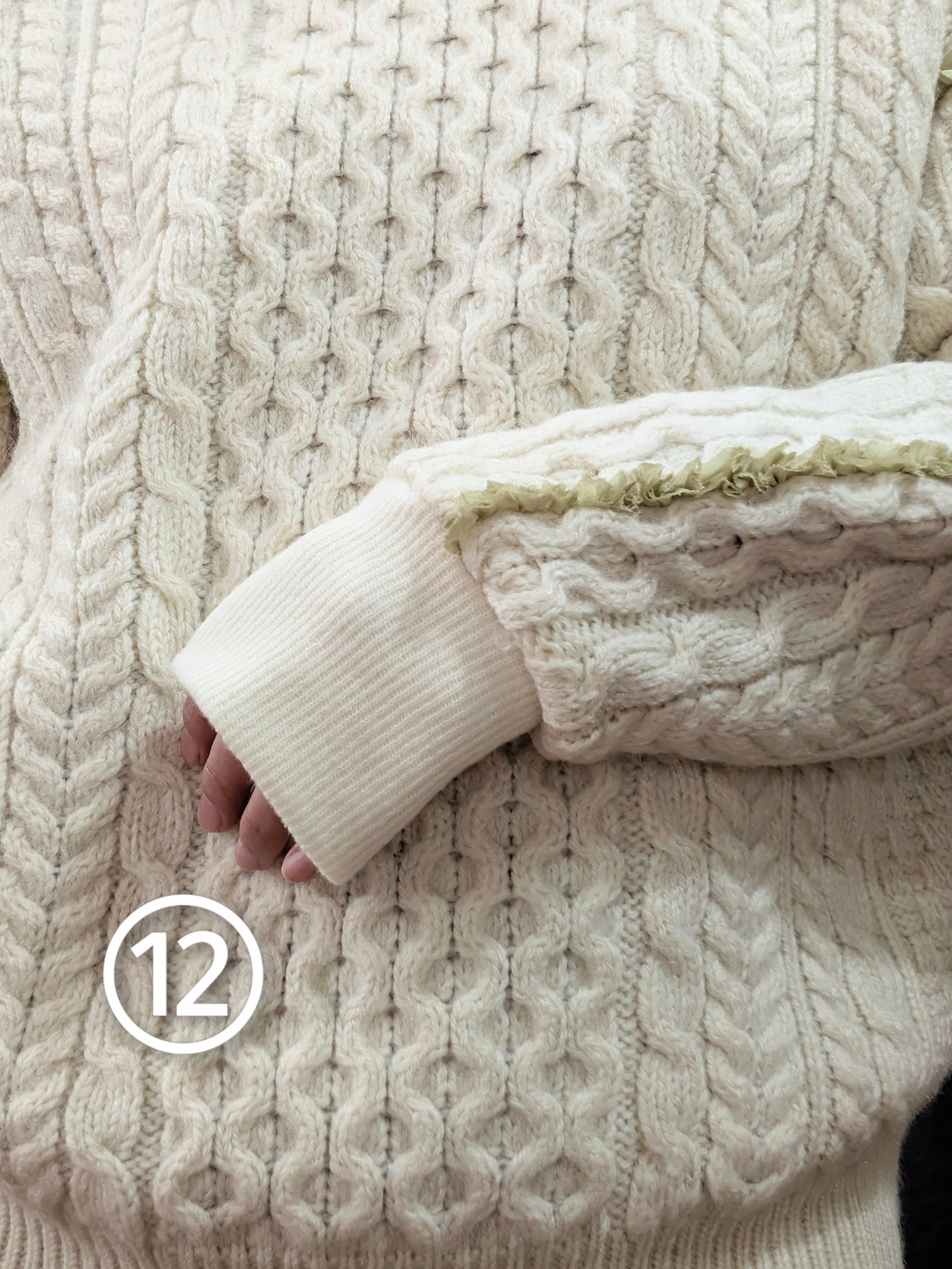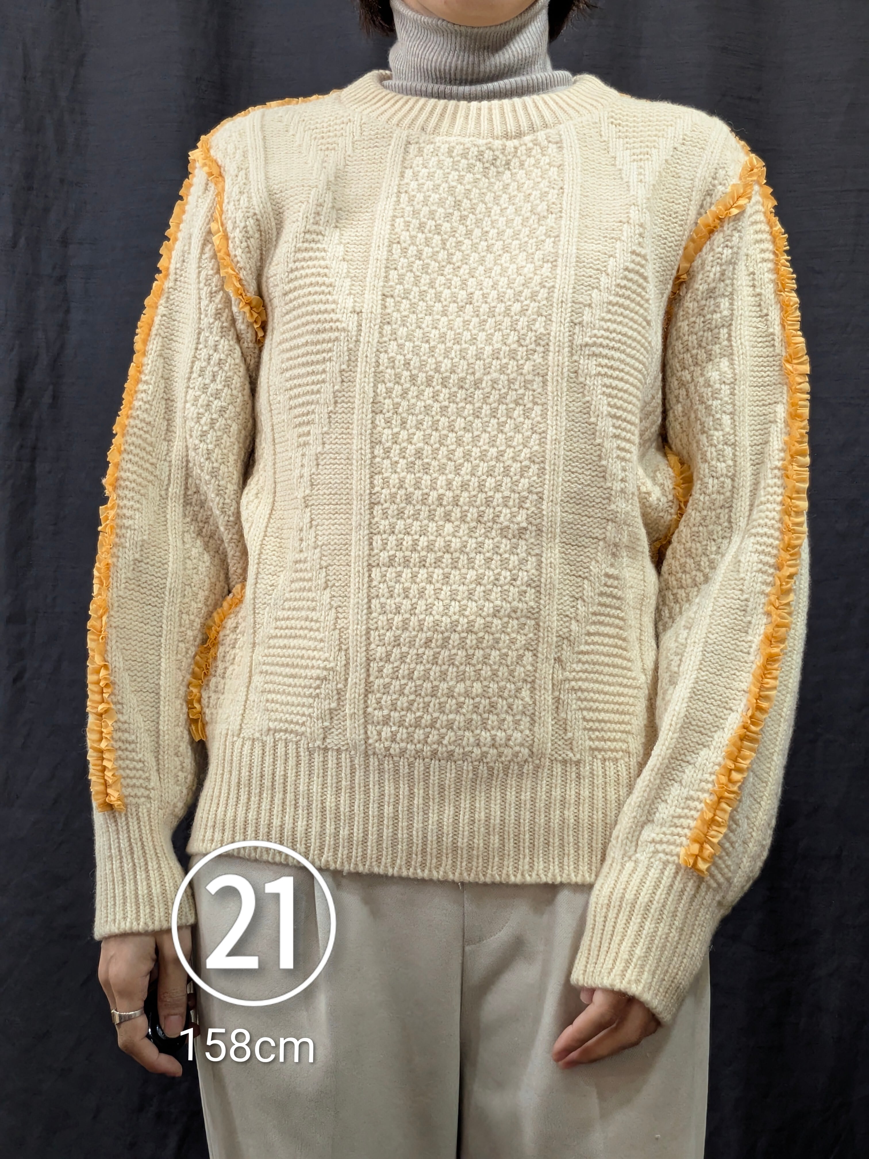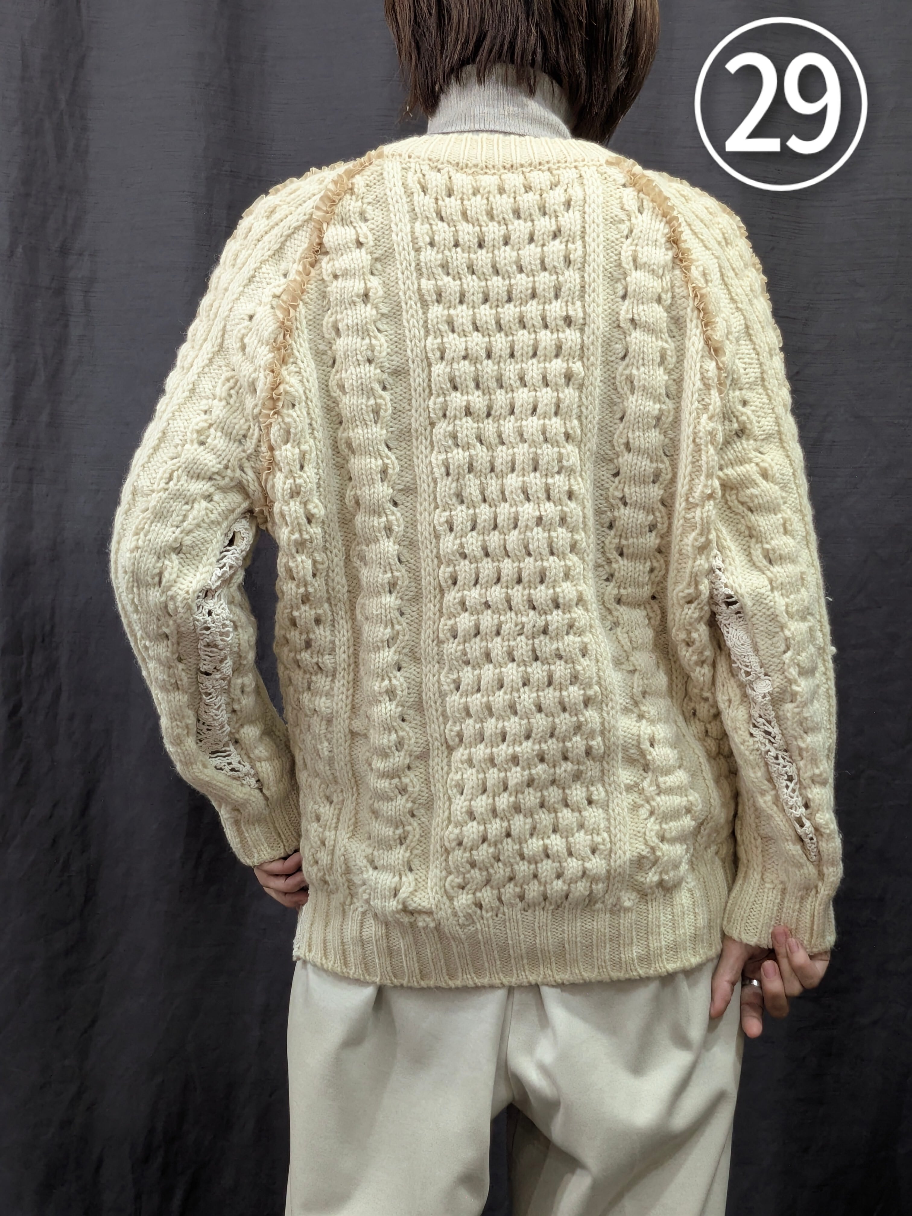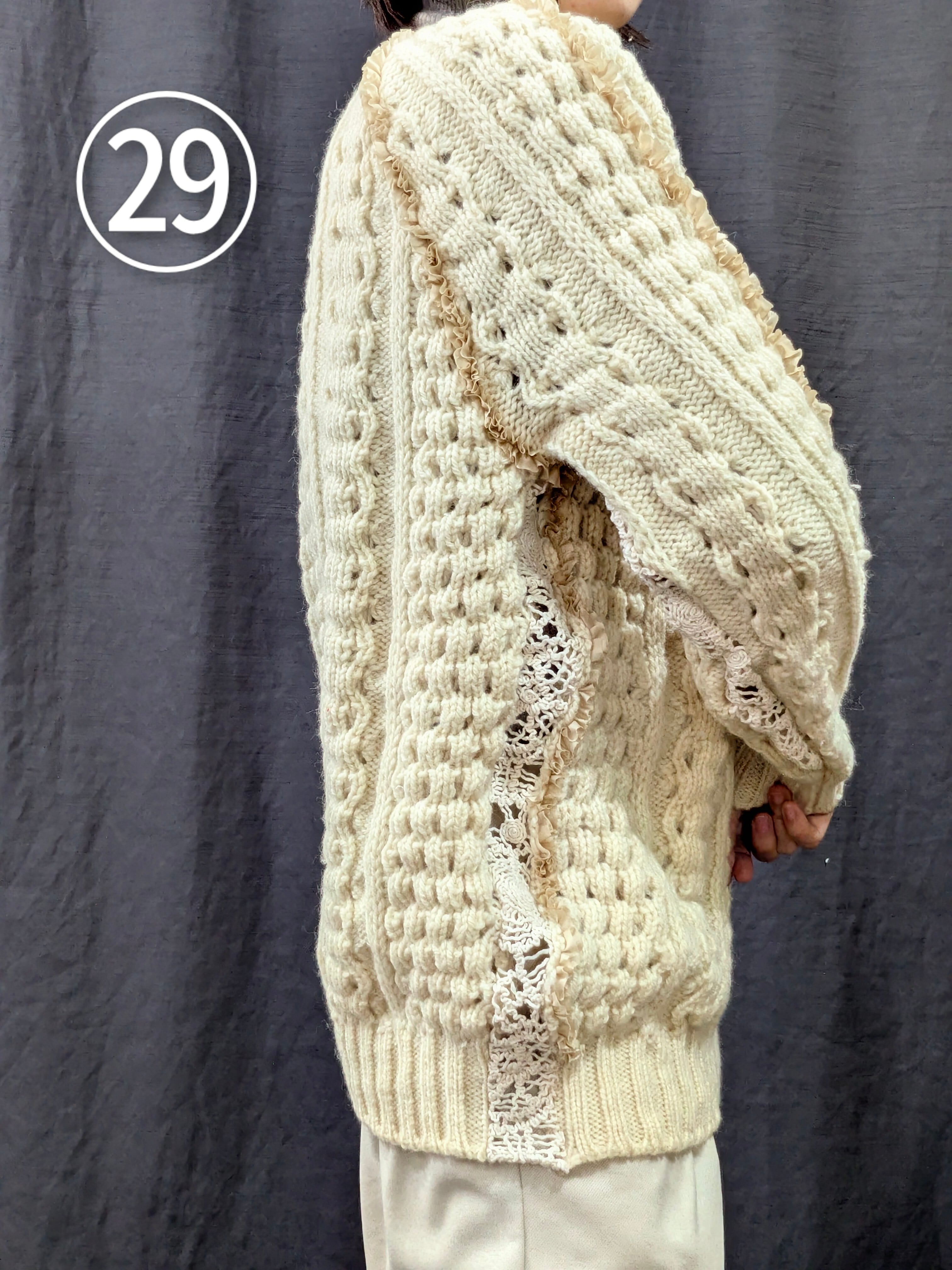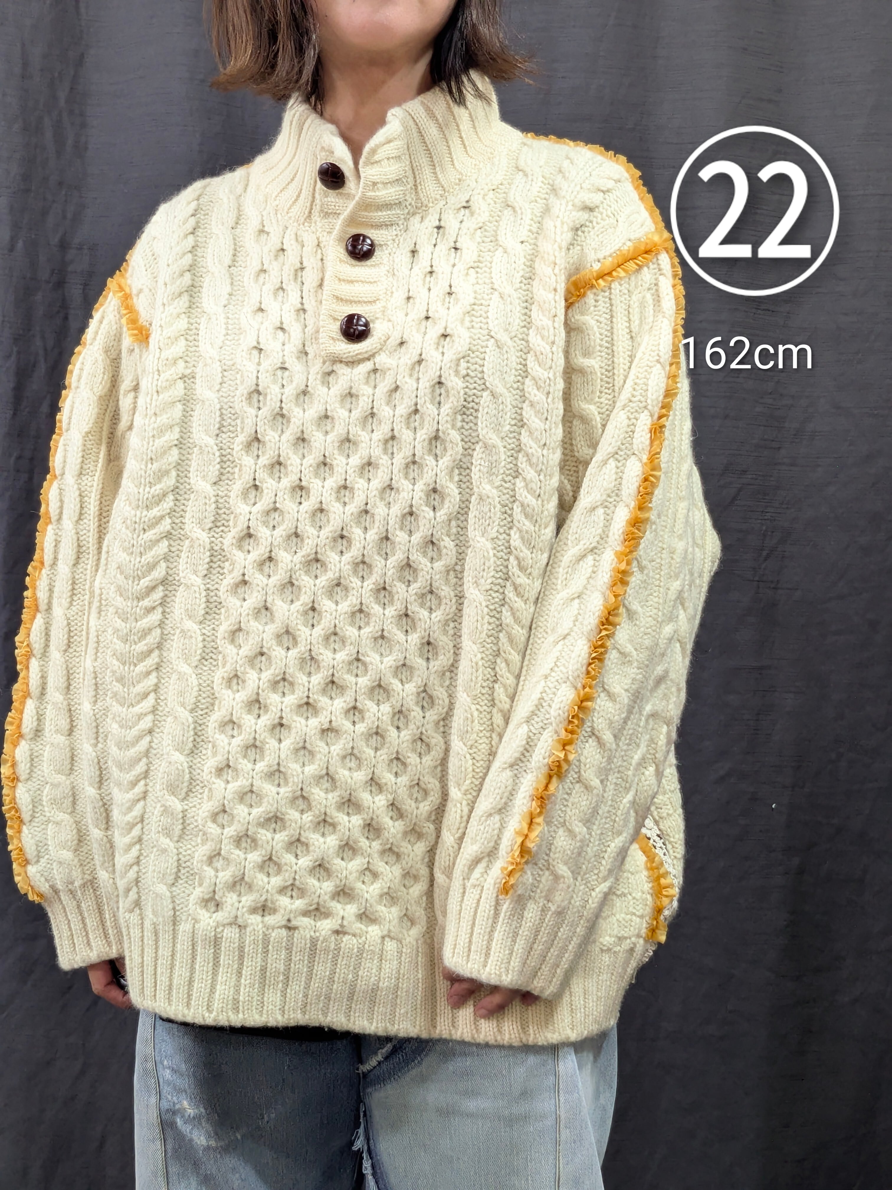 »デザインー古着のフィッシャーマンセーターのシームラインにフリルをあしらいました。