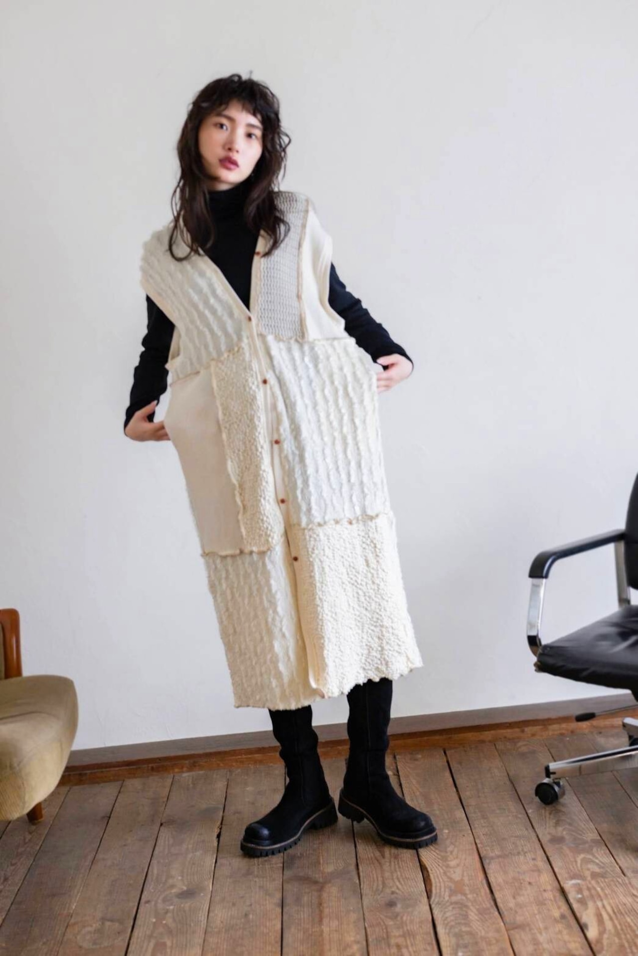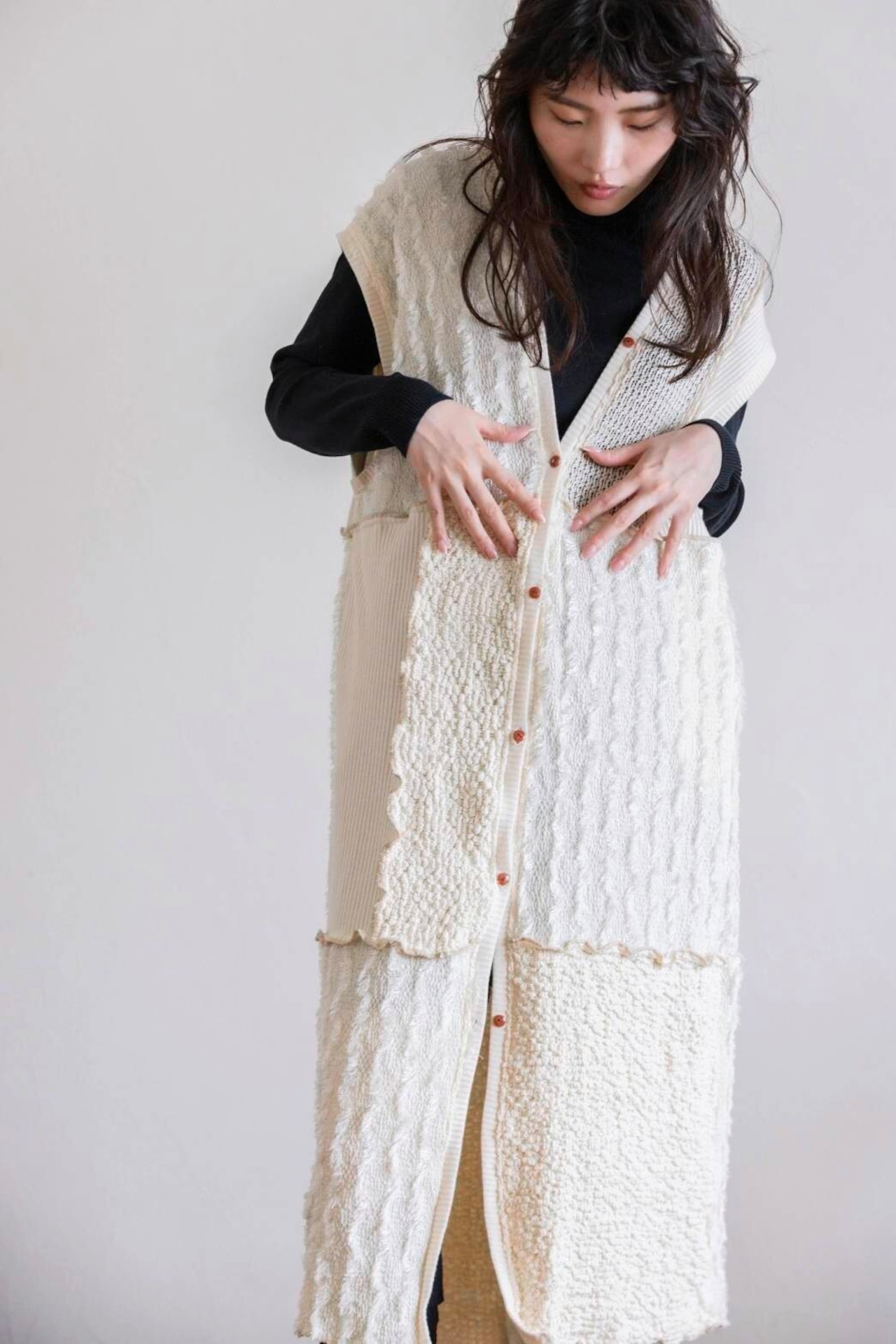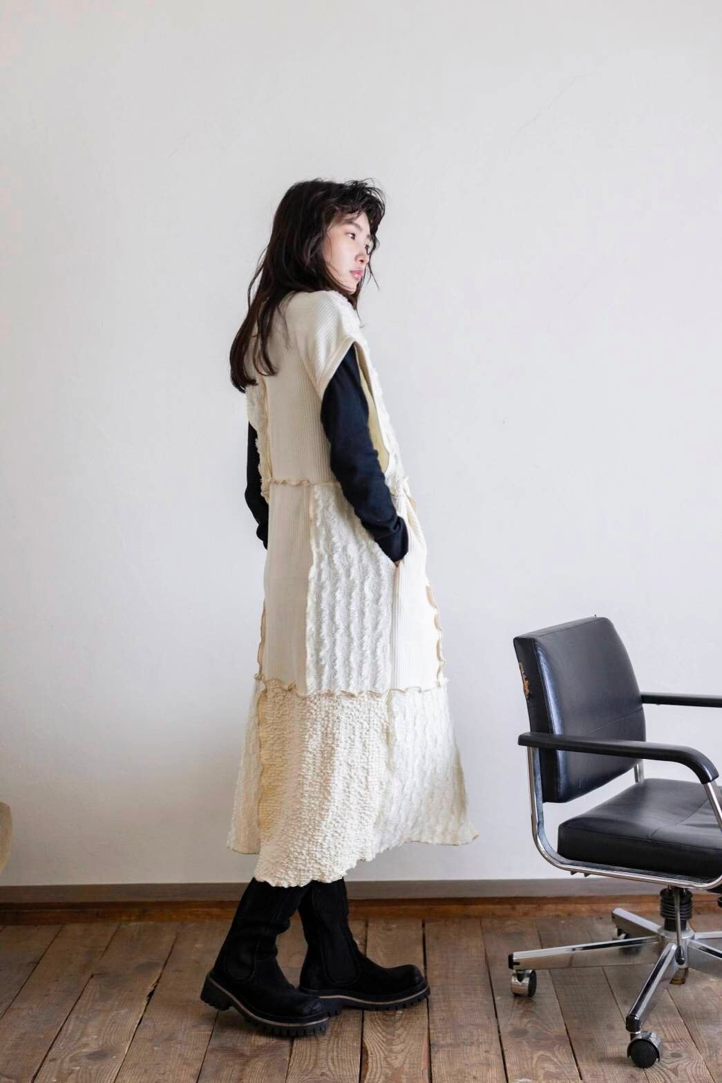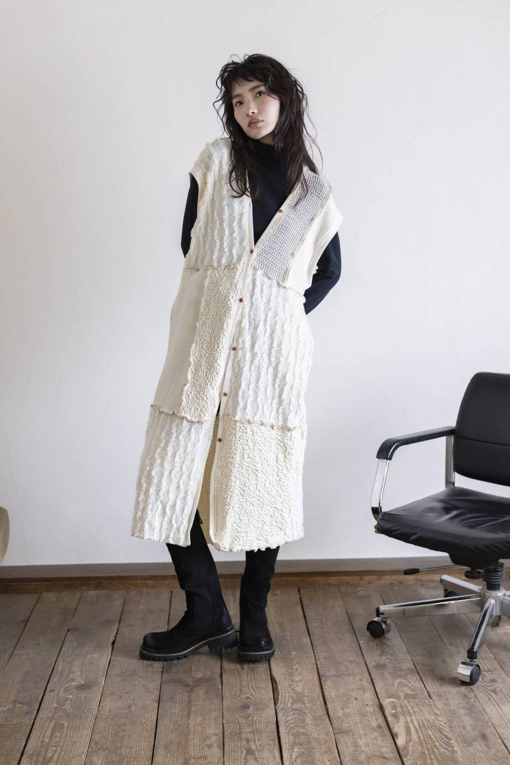 にっと、リブ素材など異なる表情のニットを組み合わせて仕立てたロングジレ。同素材のパンツとセットアップで着ても可愛いです。