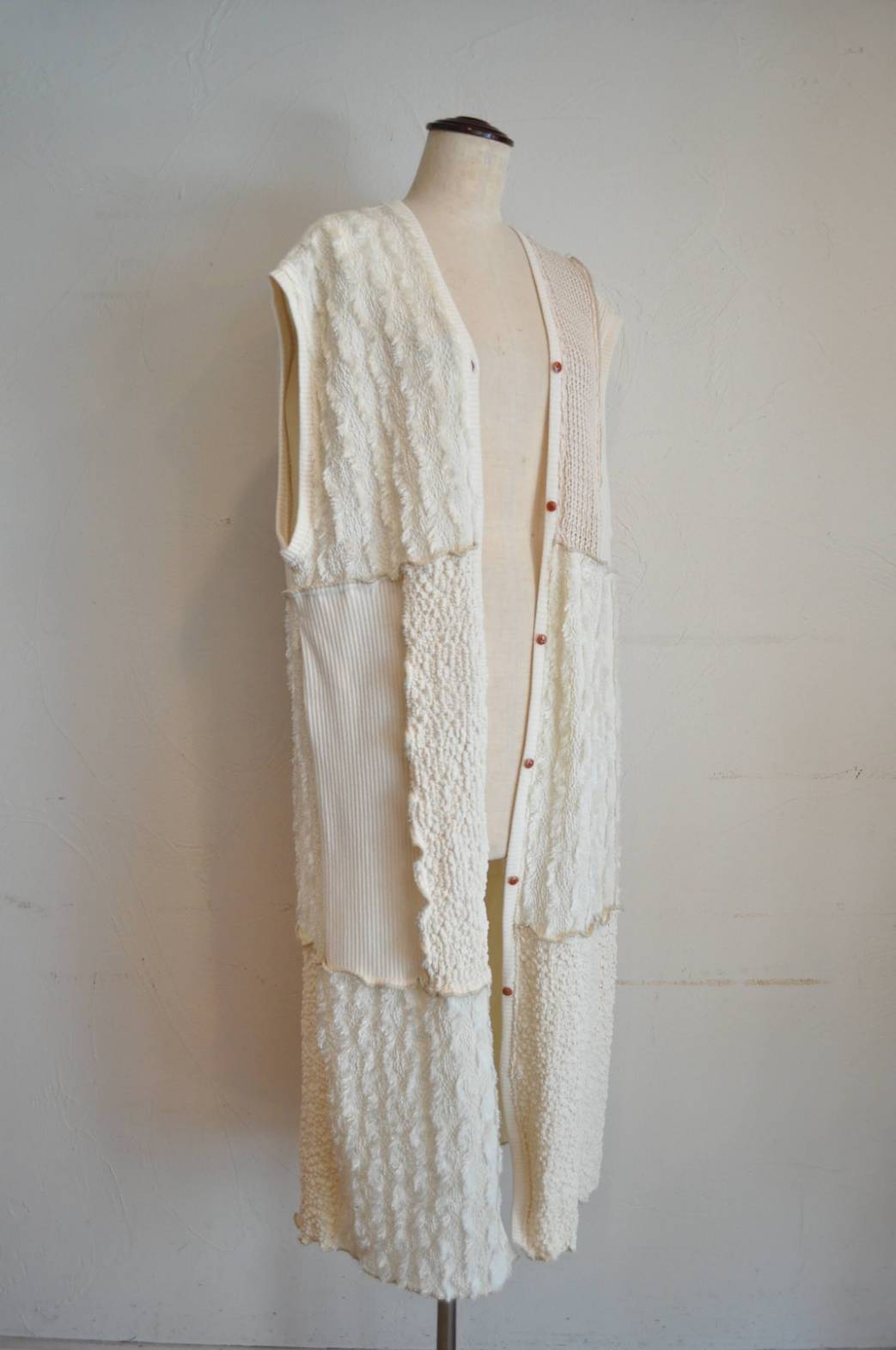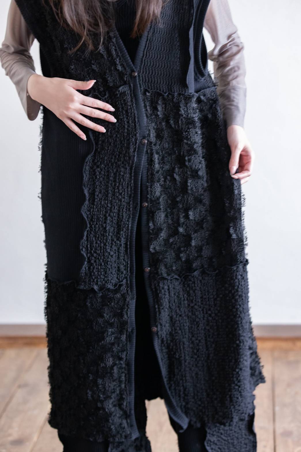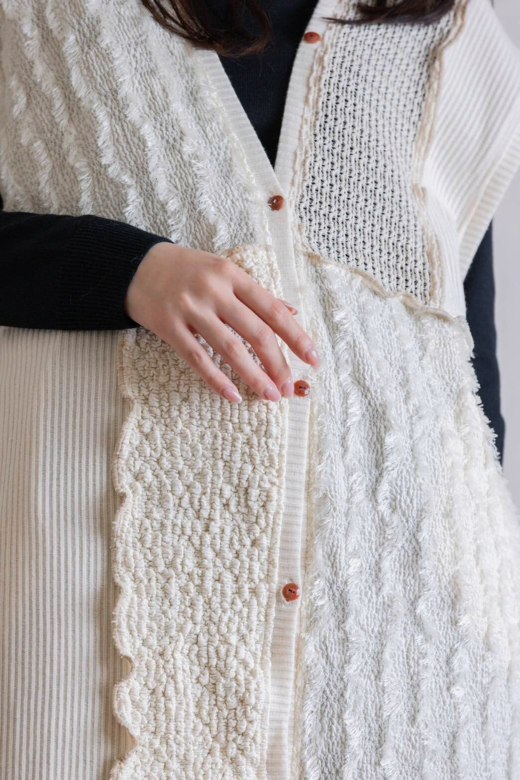 にっと、リブ素材など異なる表情のニットを組み合わせて仕立てたロングジレ。同素材のパンツとセットアップで着ても可愛いです。