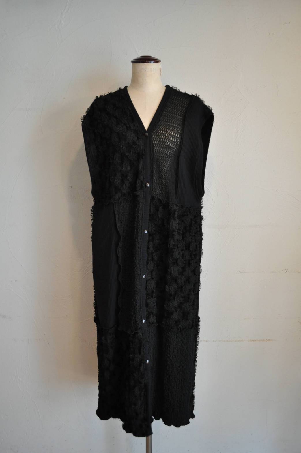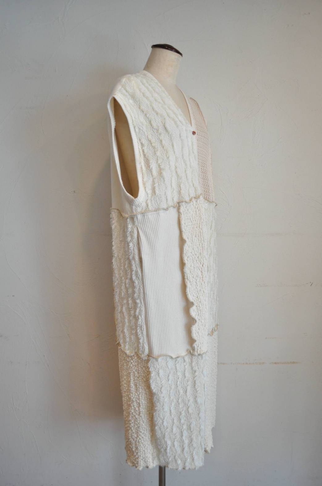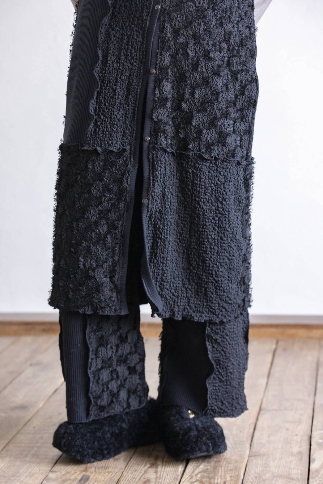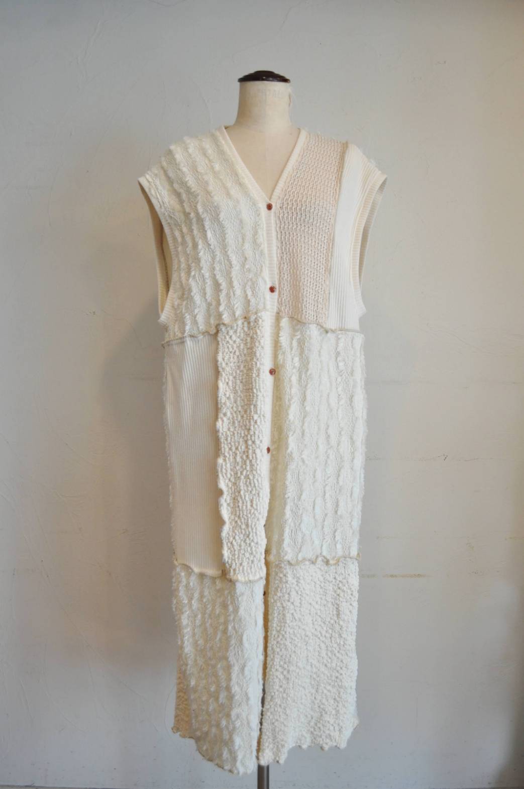 にっと、リブ素材など異なる表情のニットを組み合わせて仕立てたロングジレ。同素材のパンツとセットアップで着ても可愛いです。