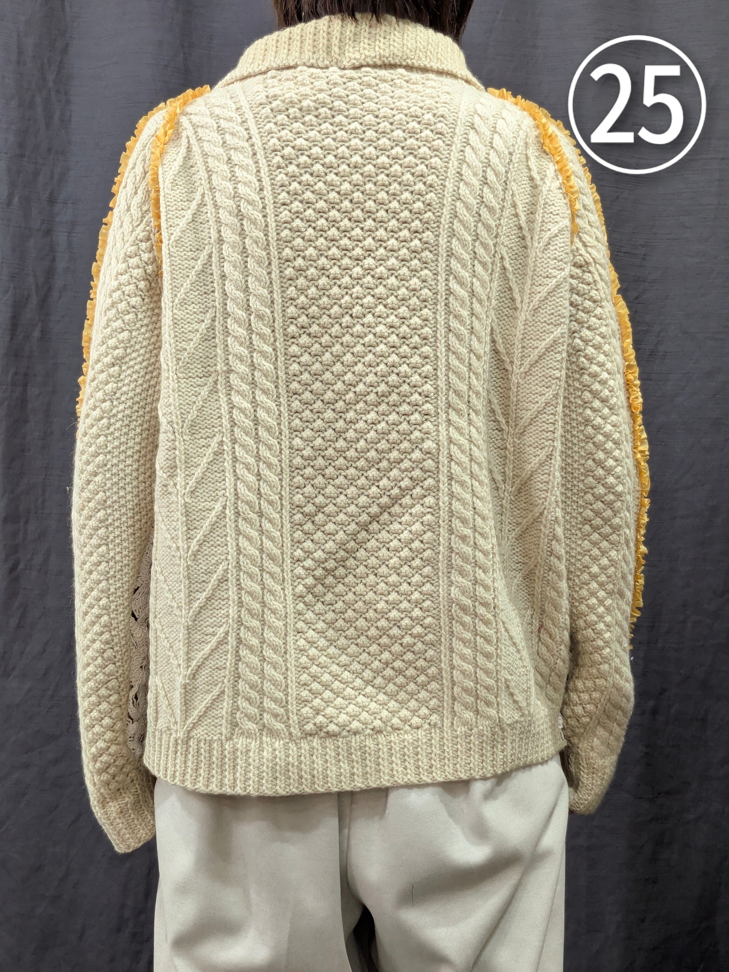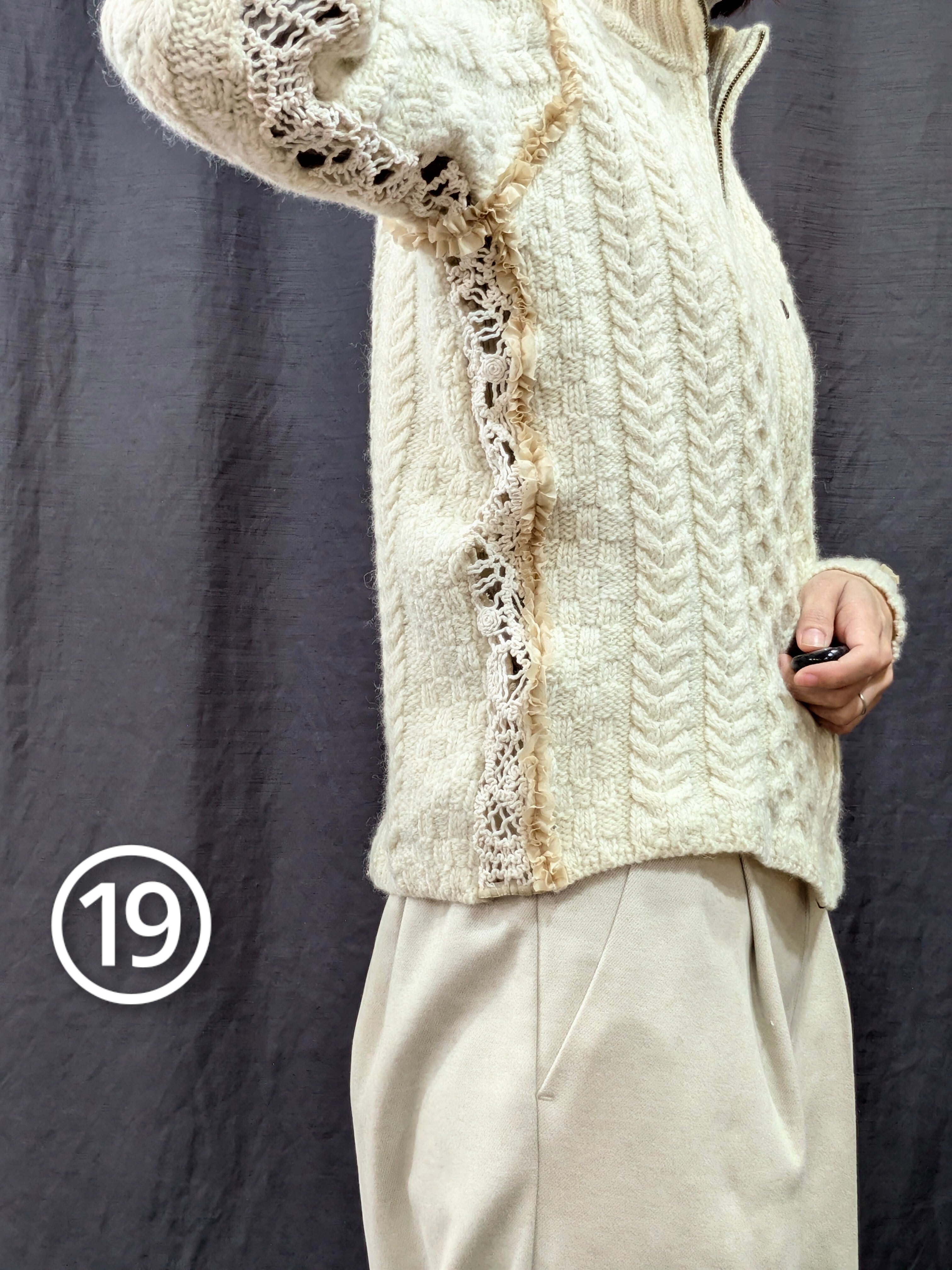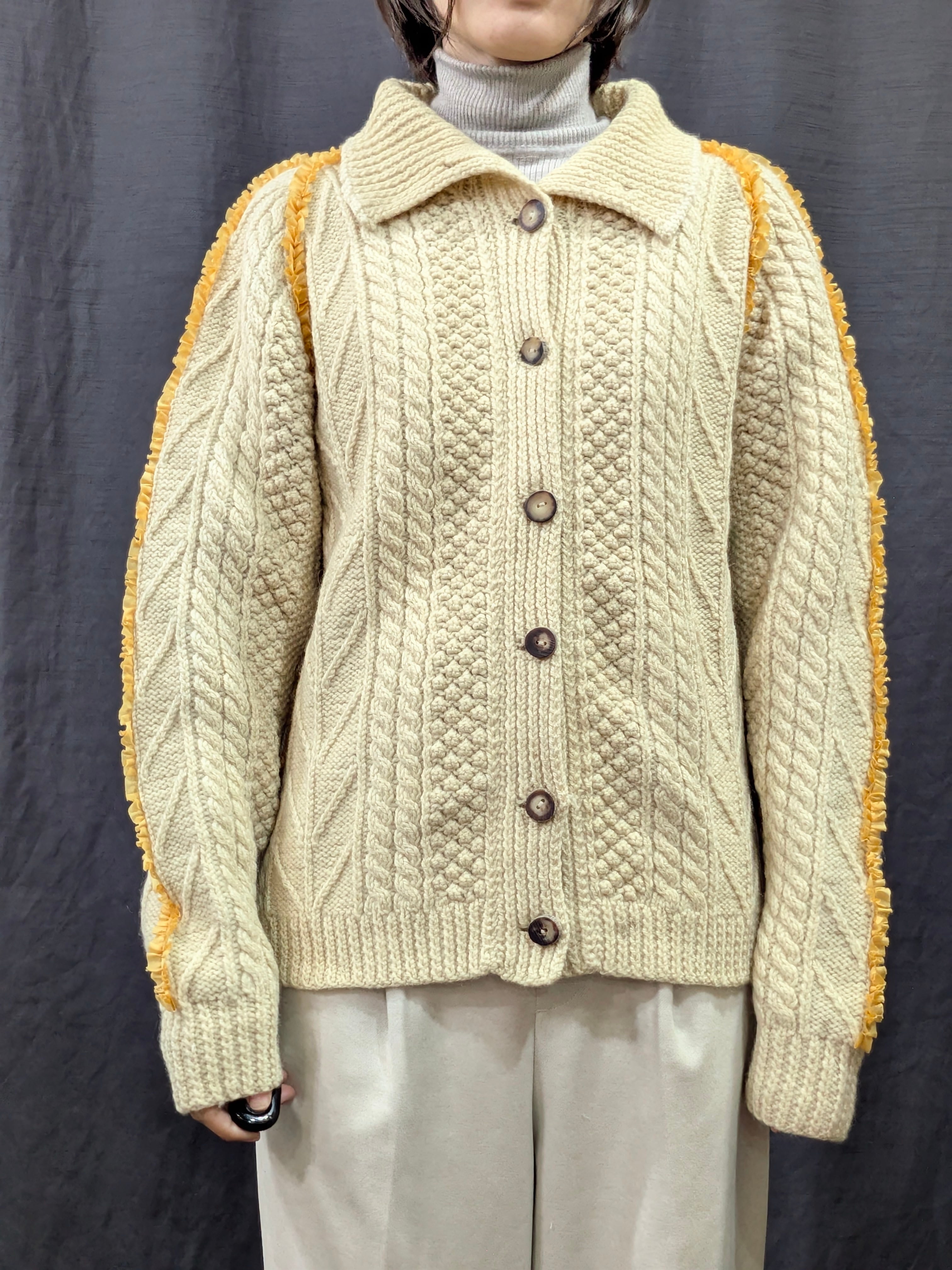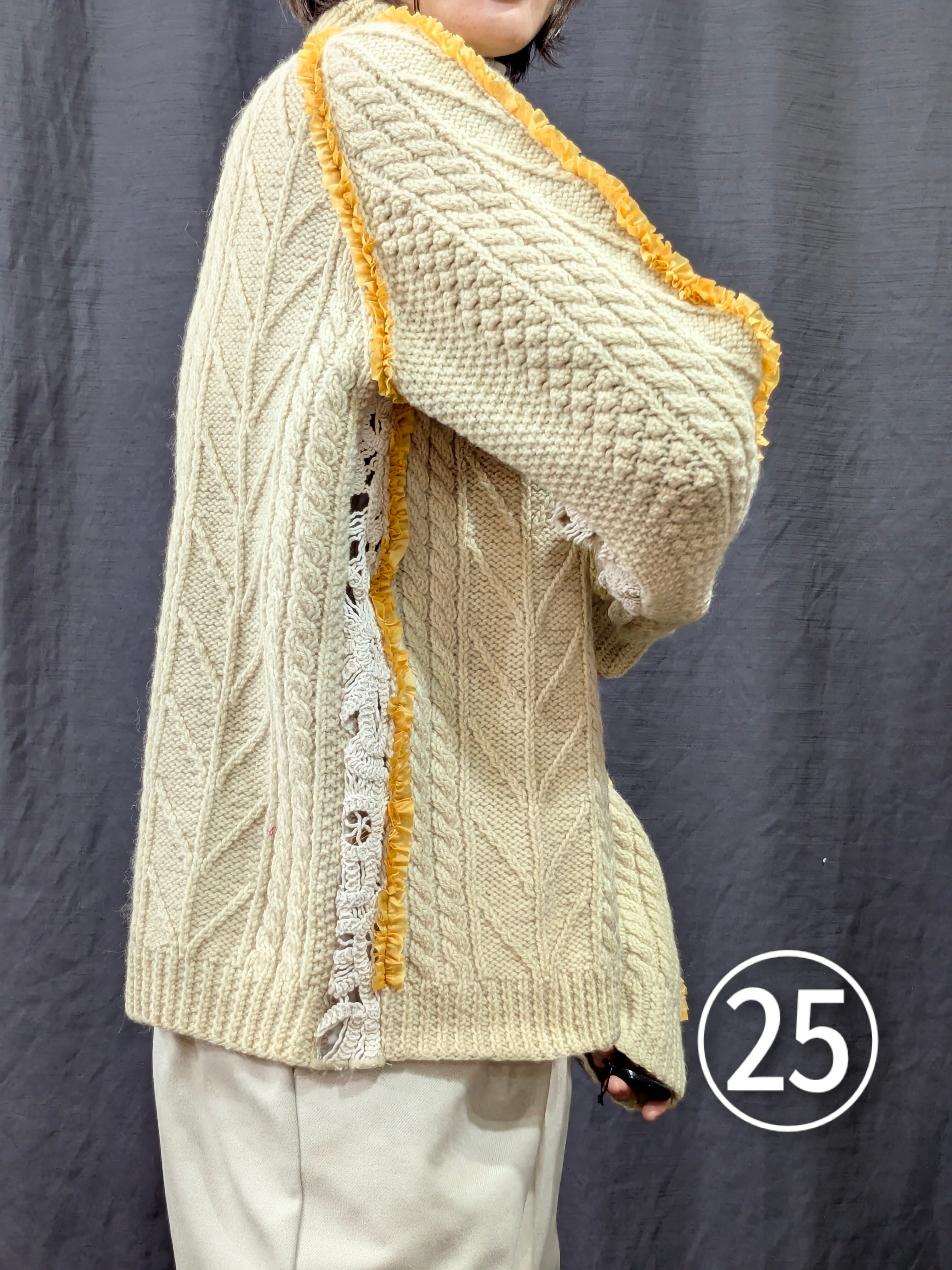 »デザインー古着のフィッシャーマンセーターのシームラインにフリルをあしらいました。