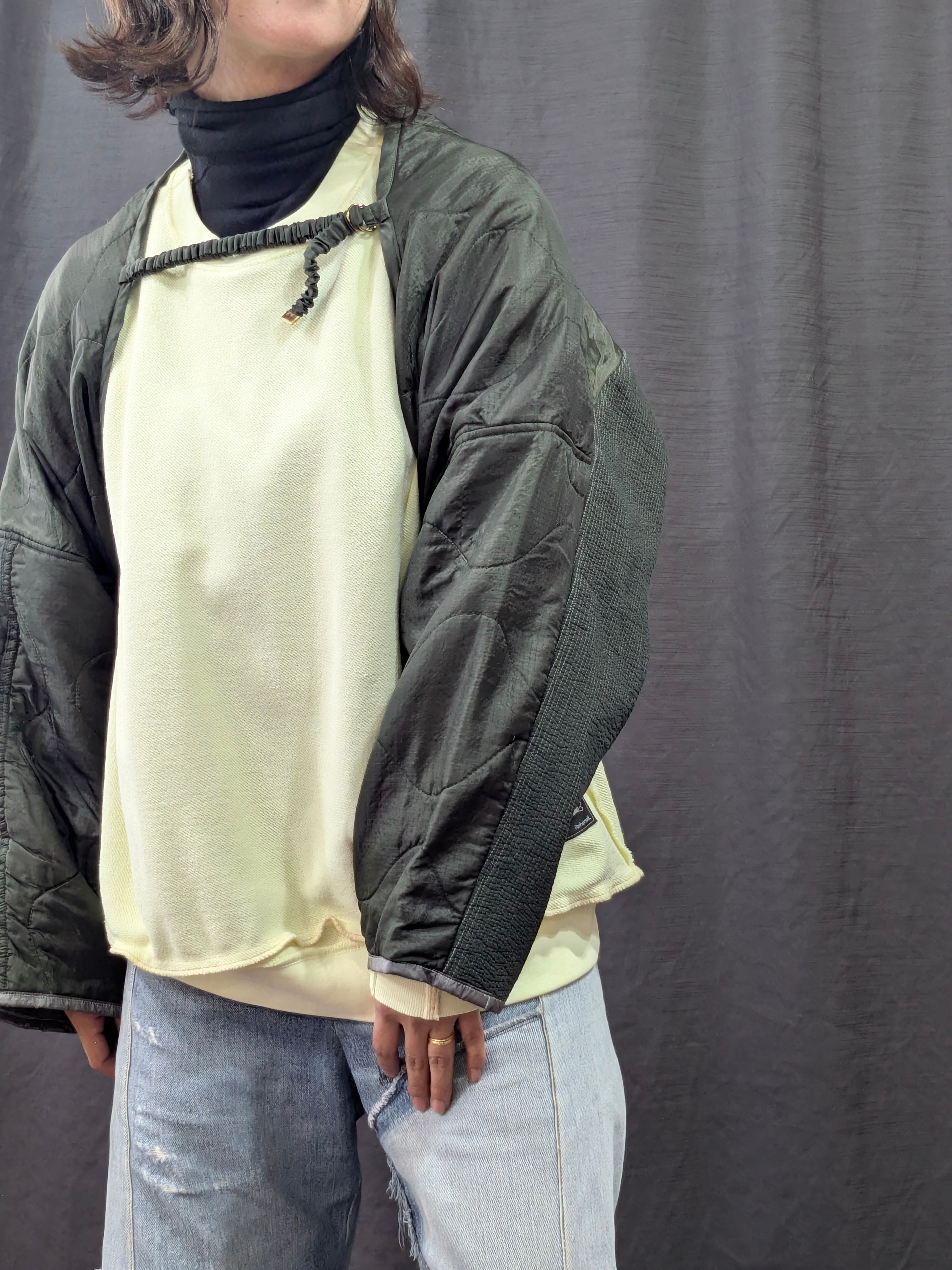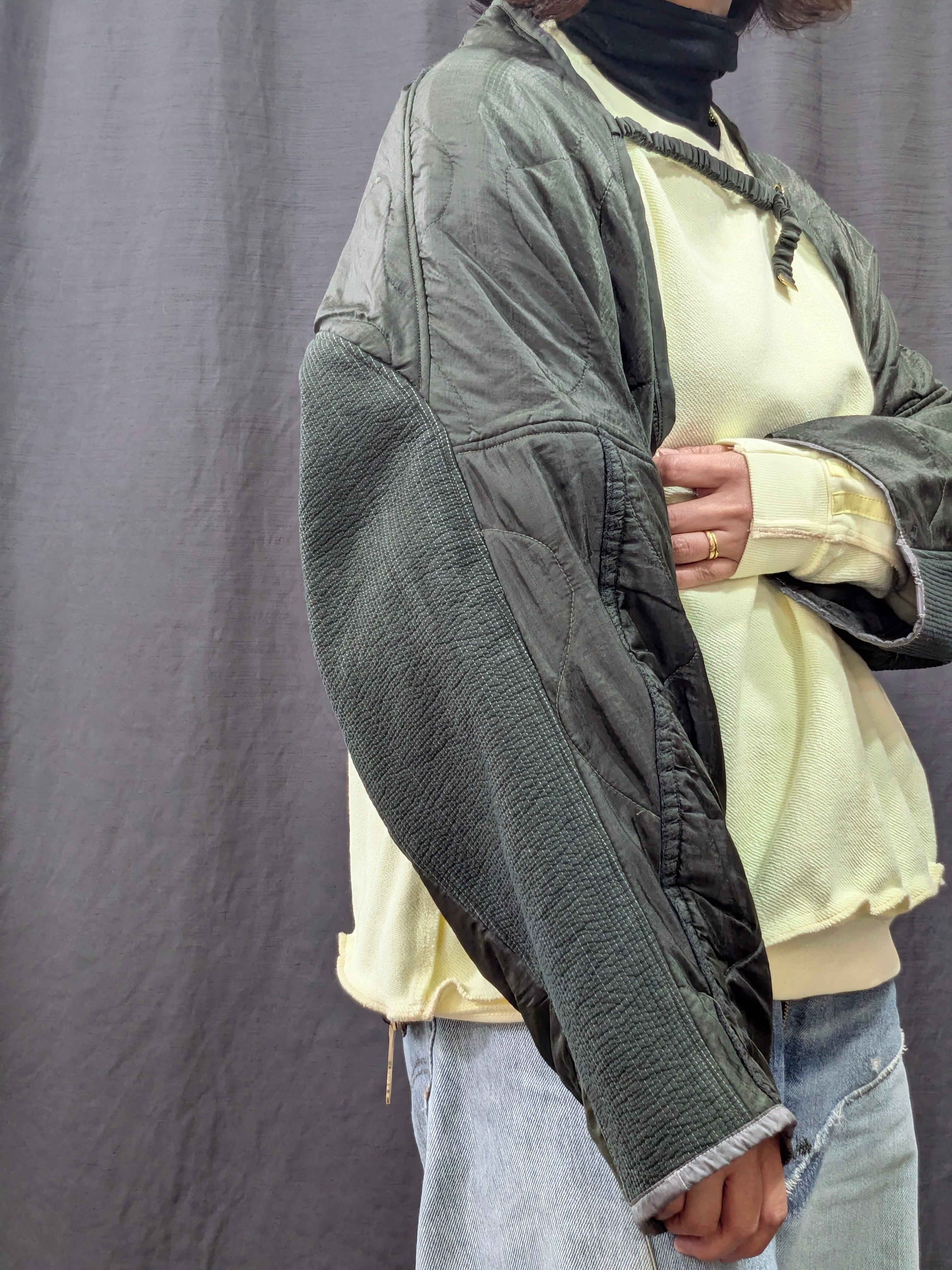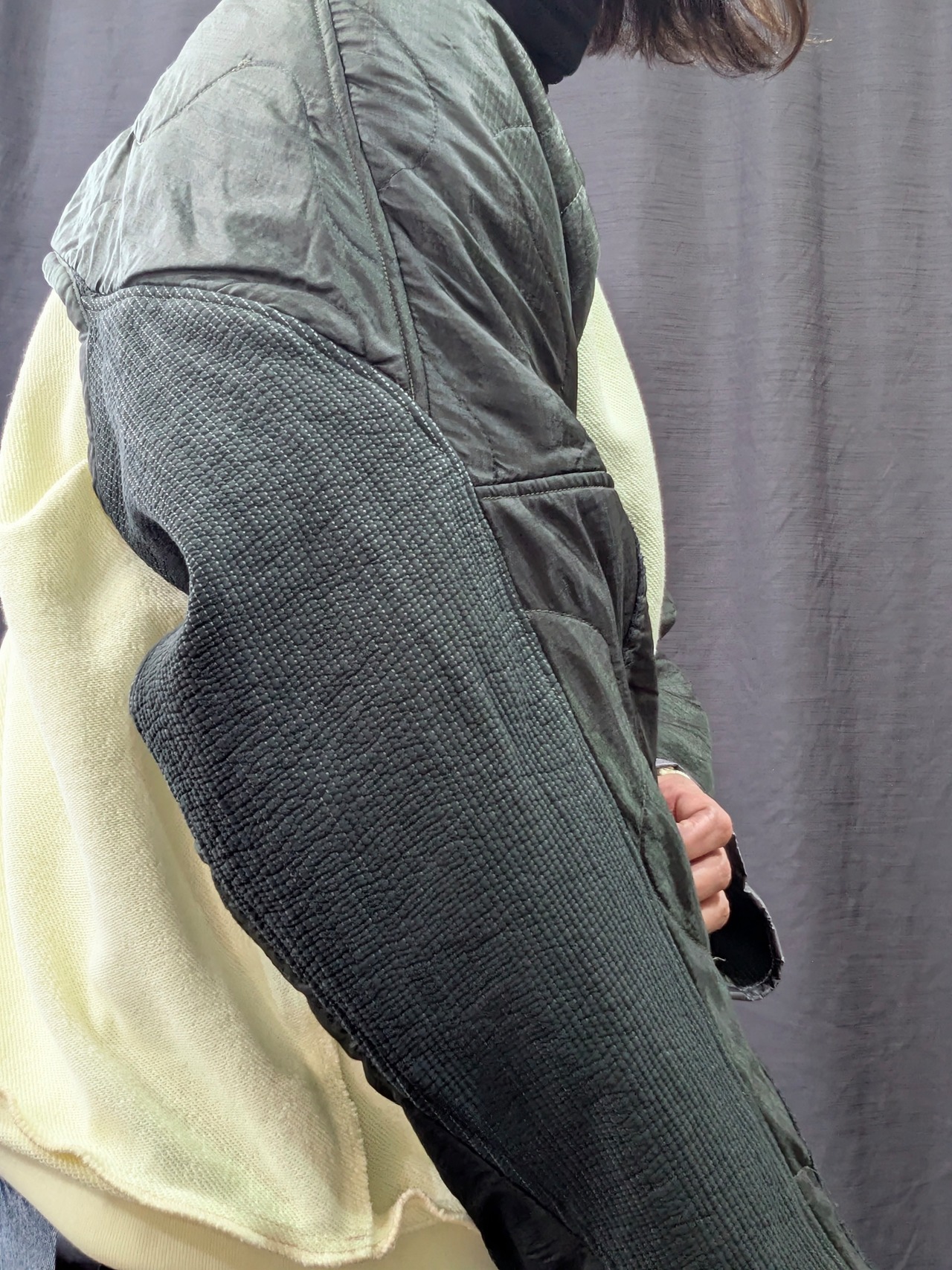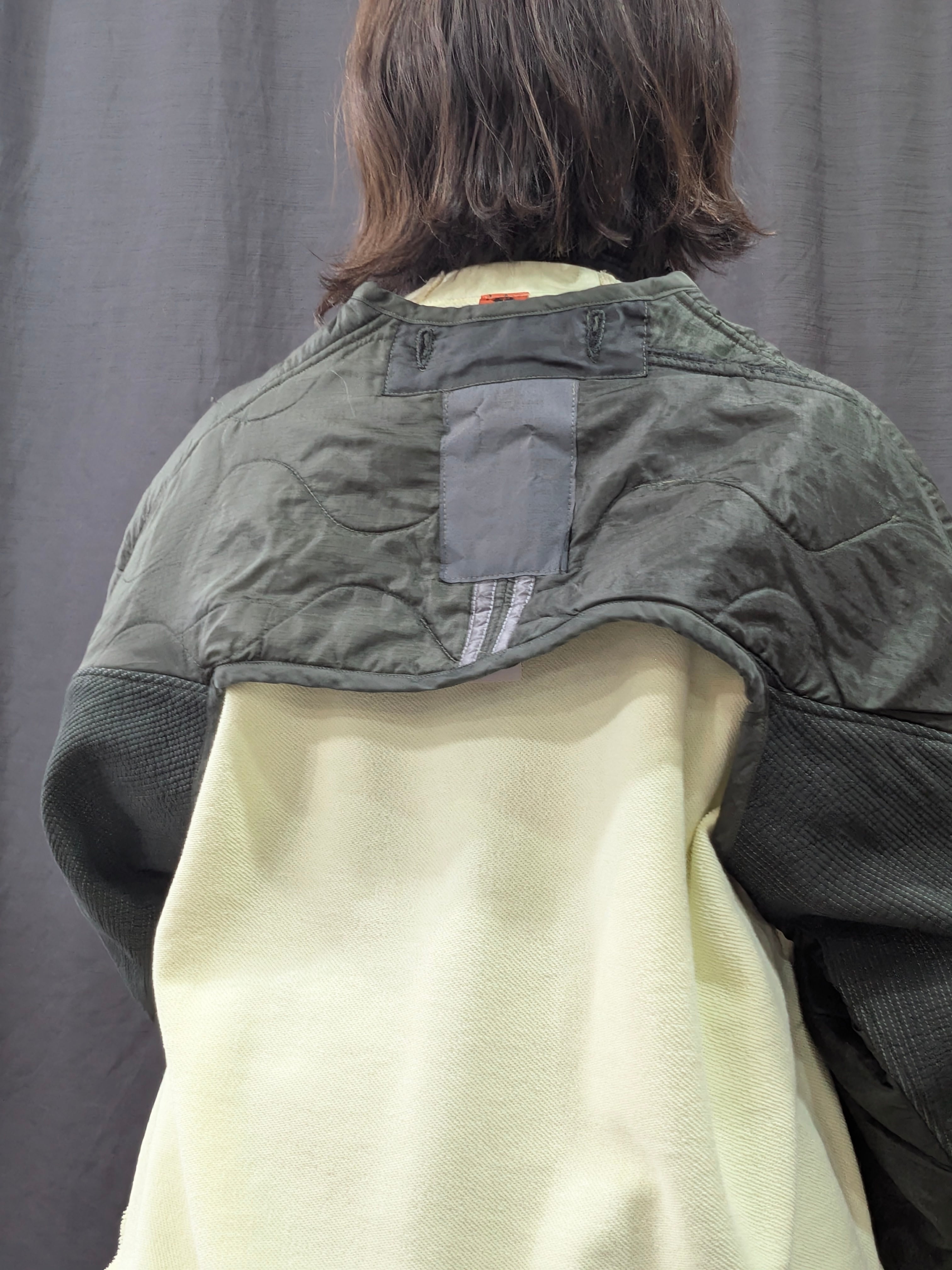 »デザインー定番素材である古着のライナーと軽めのイブル生地をパターンにはめ、構築したボレロです。