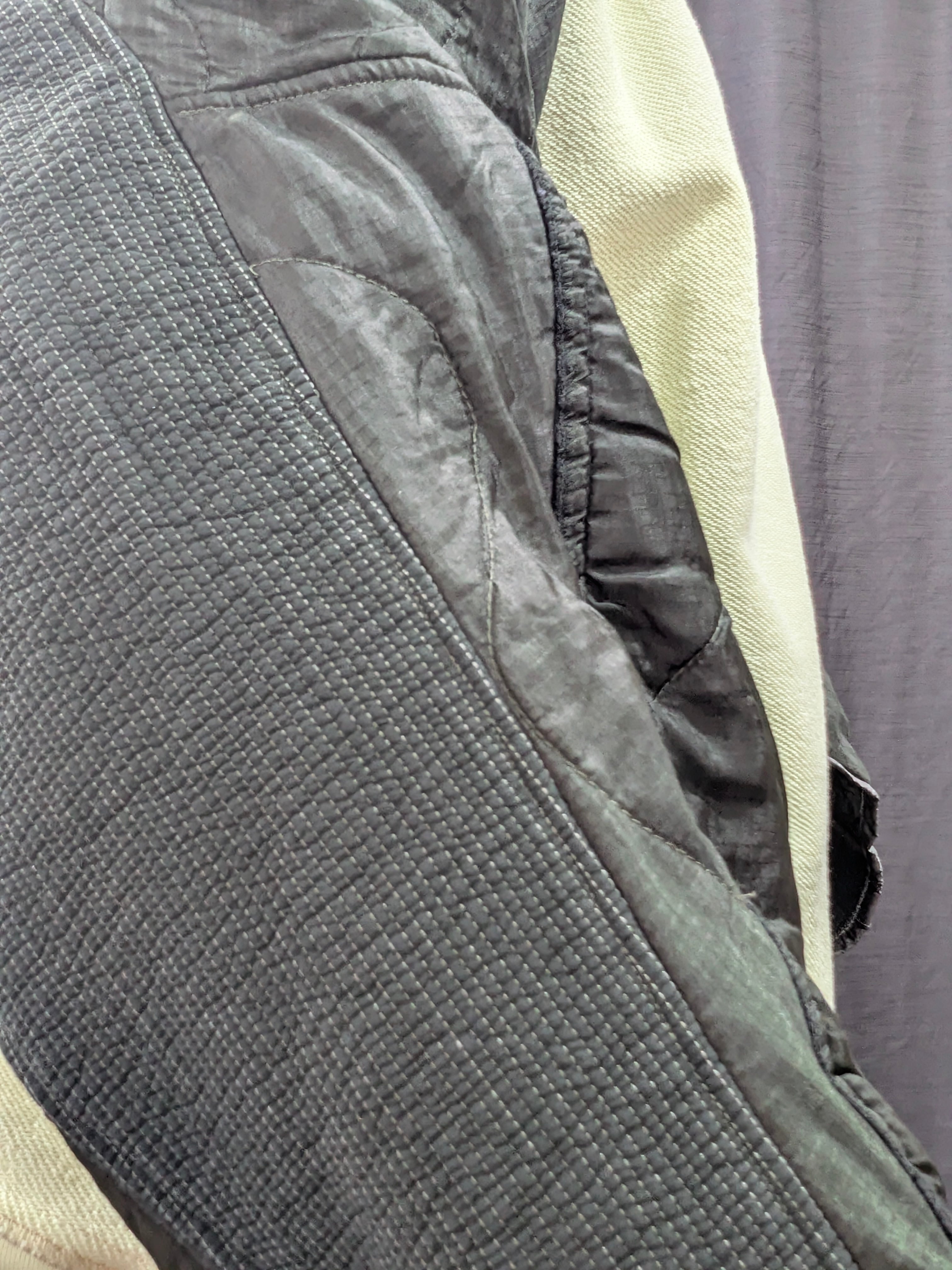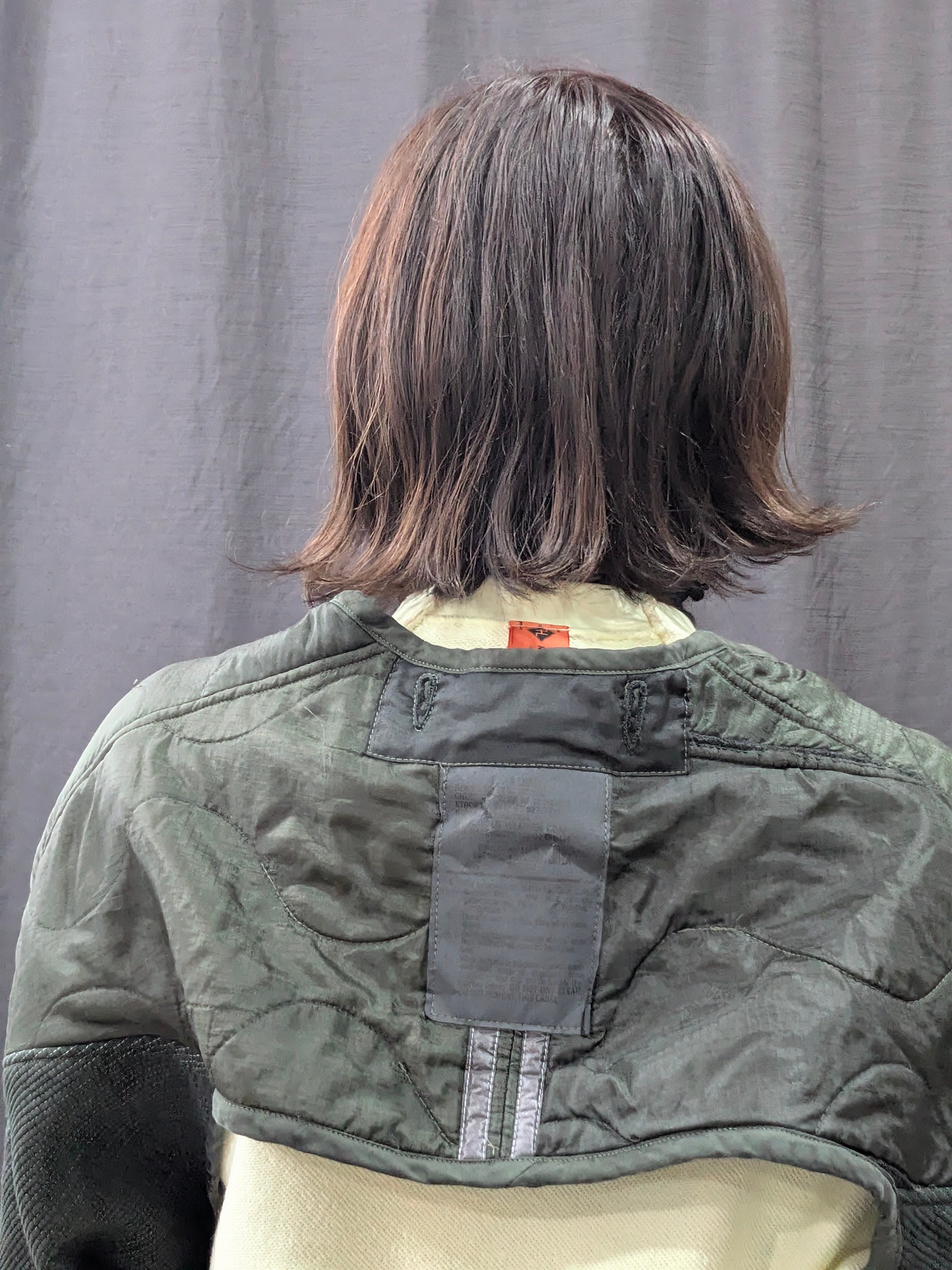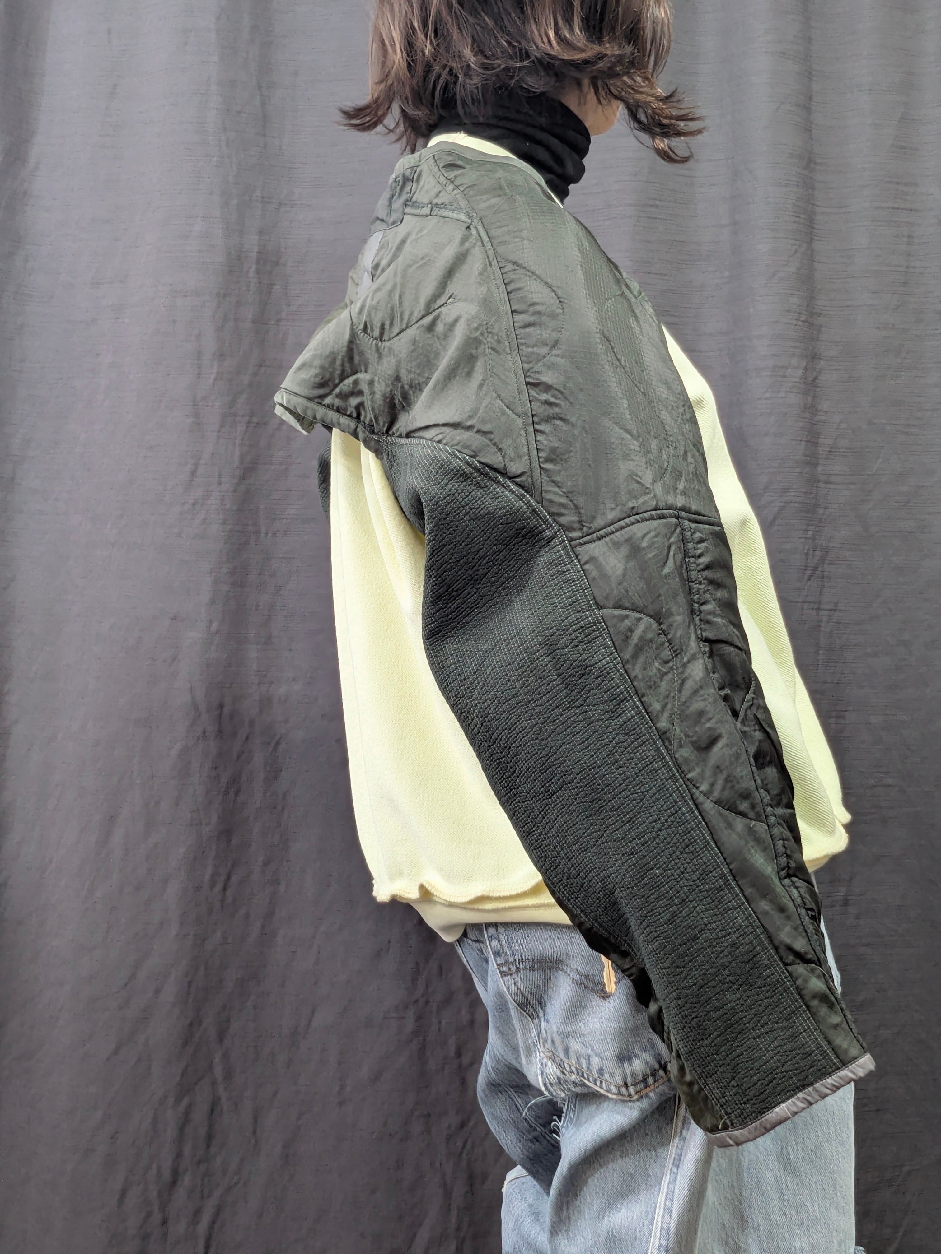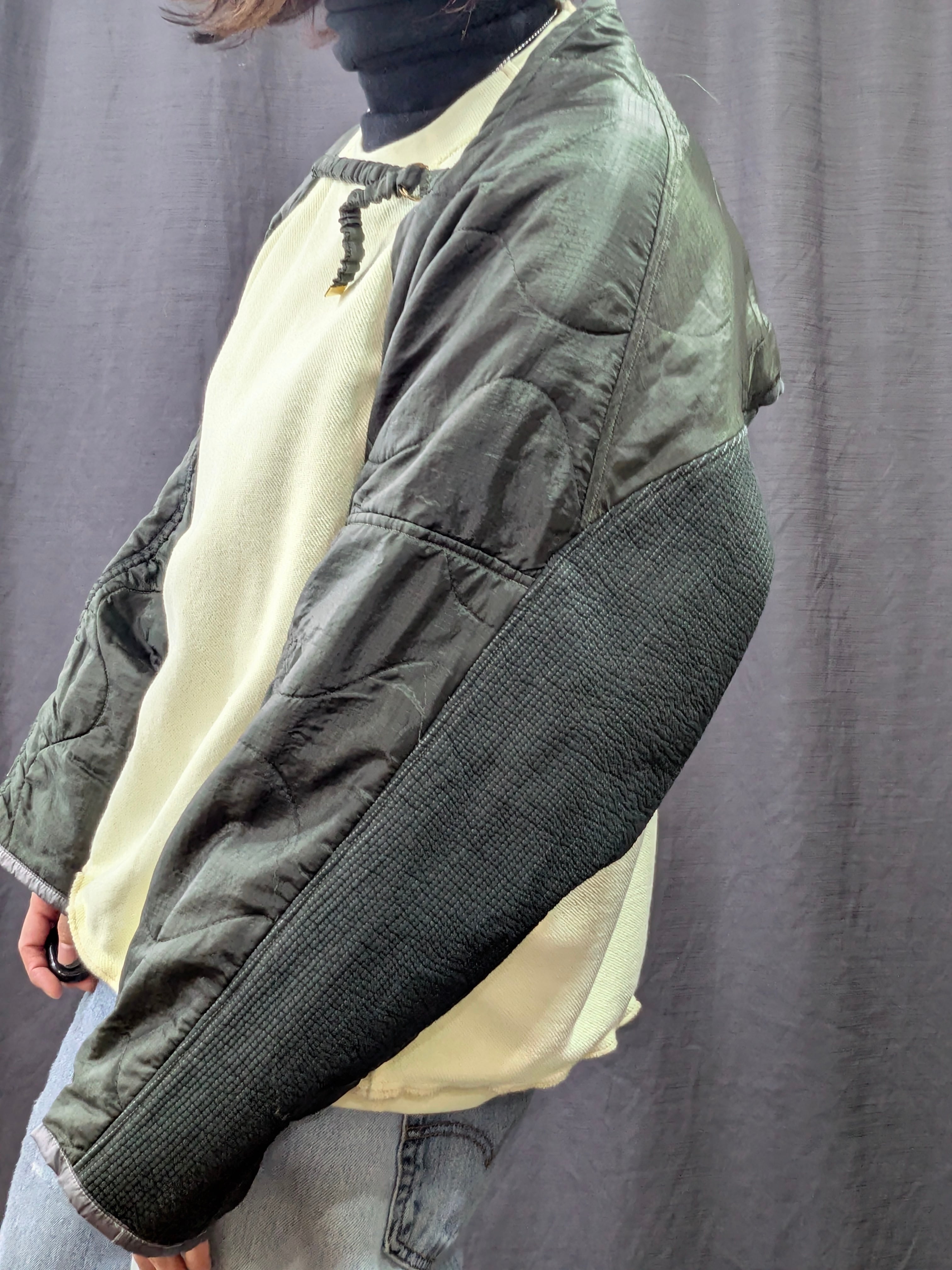»デザインー定番素材である古着のライナーと軽めのイブル生地をパターンにはめ、構築したボレロです。