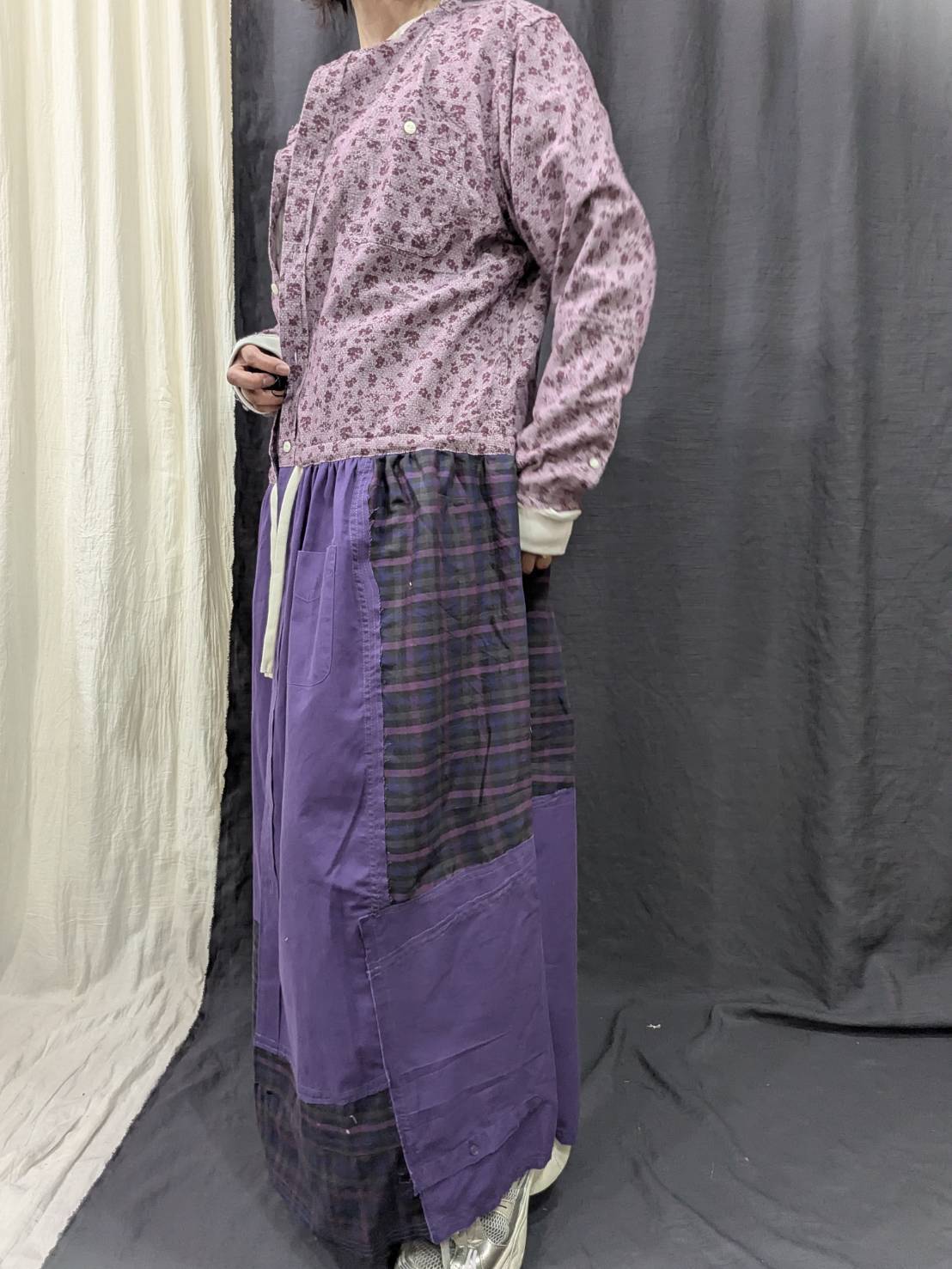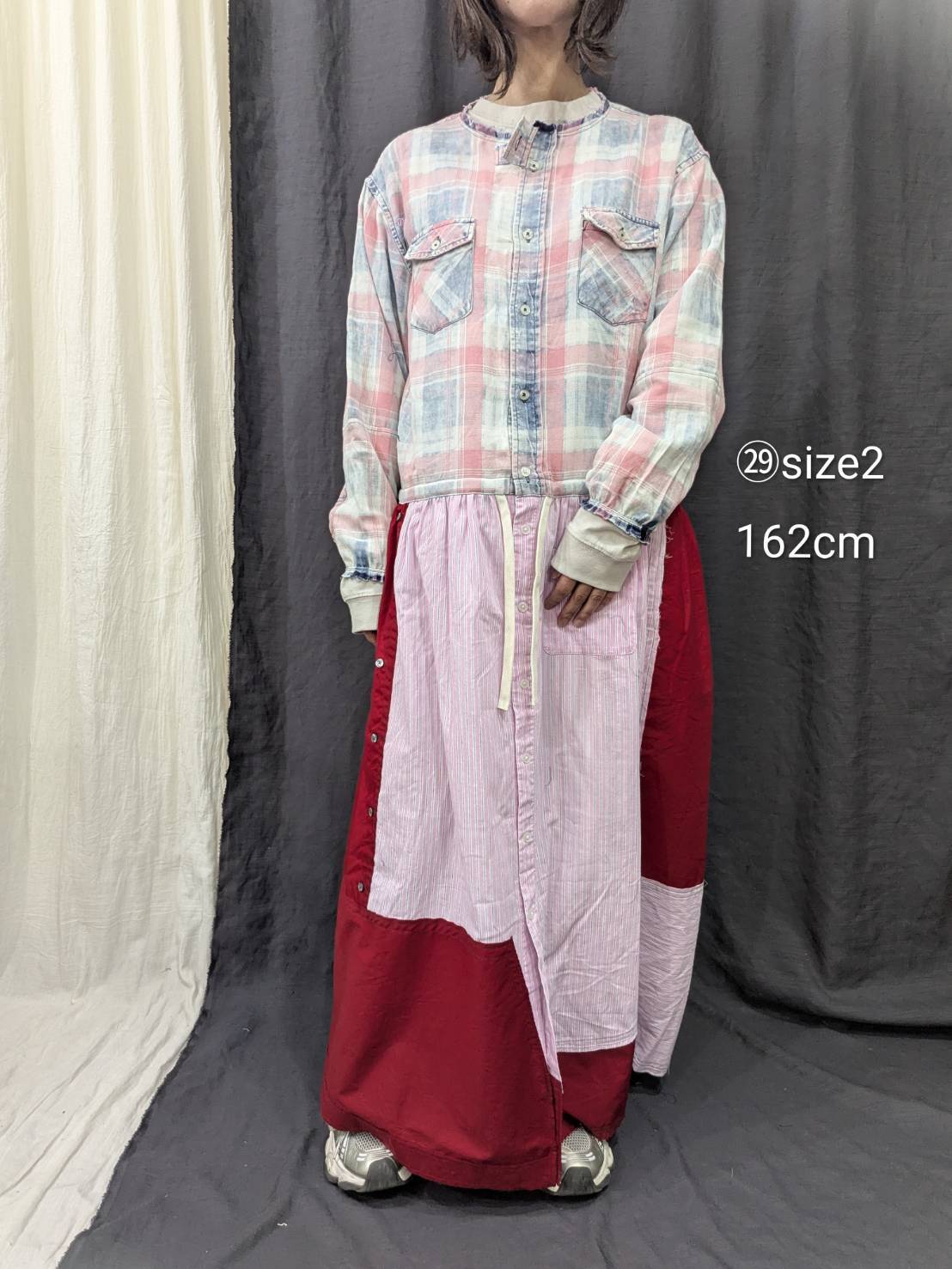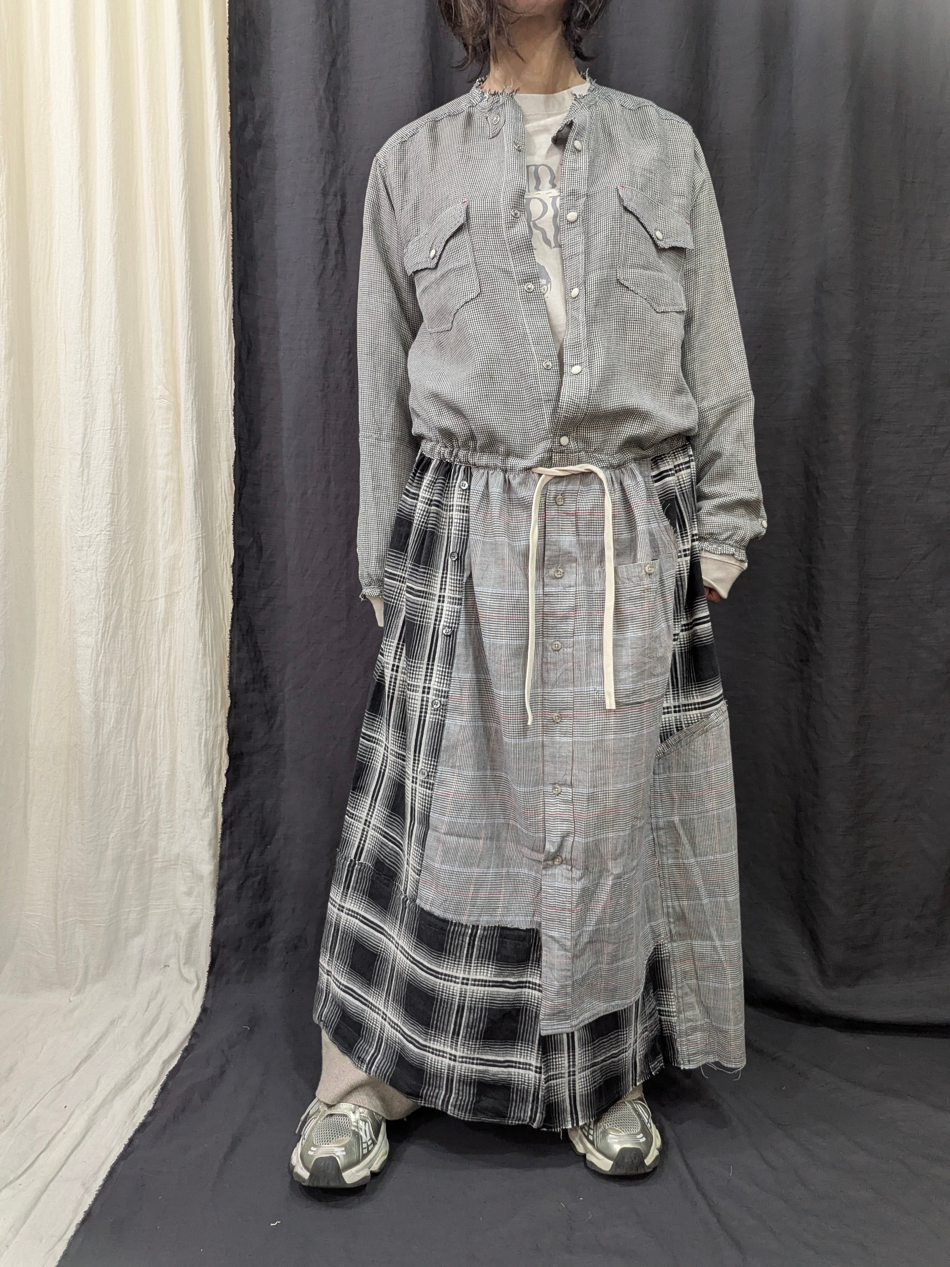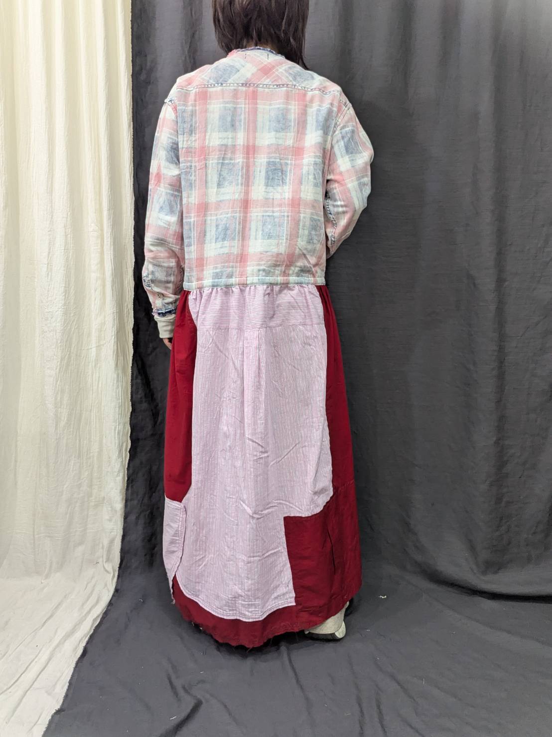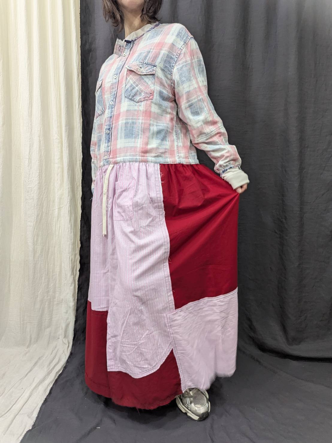 »デザインー古着のシャツを使用して再構築したリメイクワンピースです。シャツならではのディテールを活かしつつウエストの切り替えからしたはパッチワークでボリュームを持たせています。色落ちや風合いに違いが生むグラデーションや一点一点違う柄が一つとして同じ物がないスペシャルワンに仕上がっています。