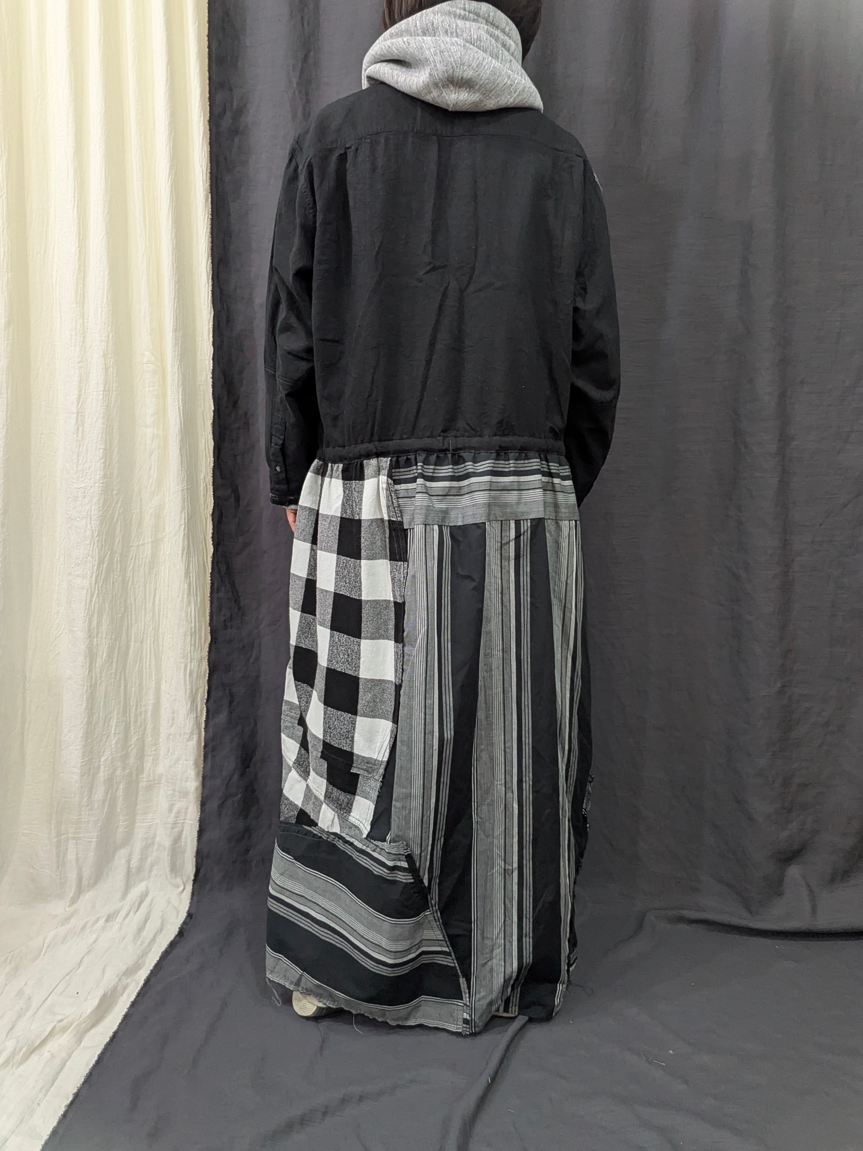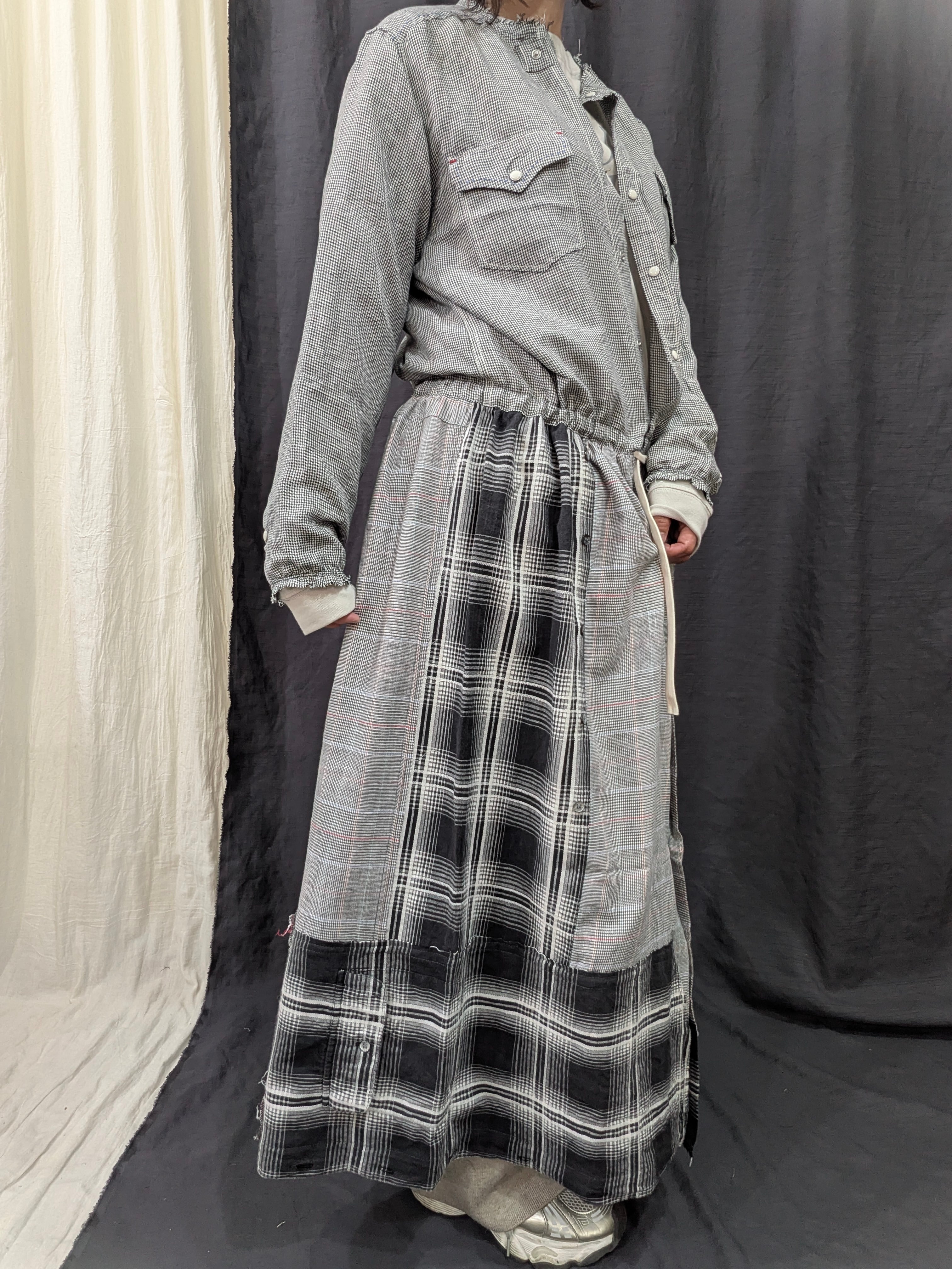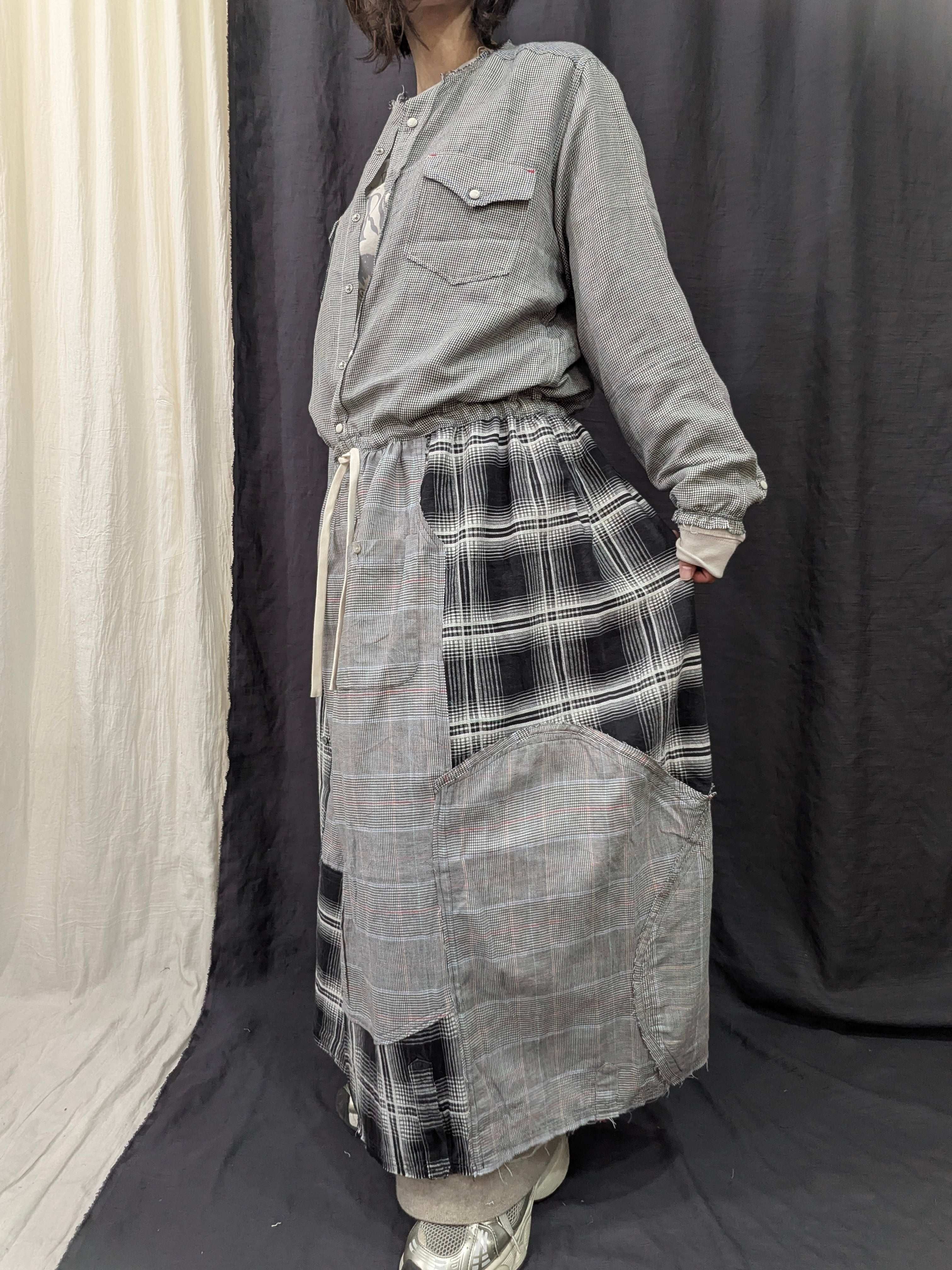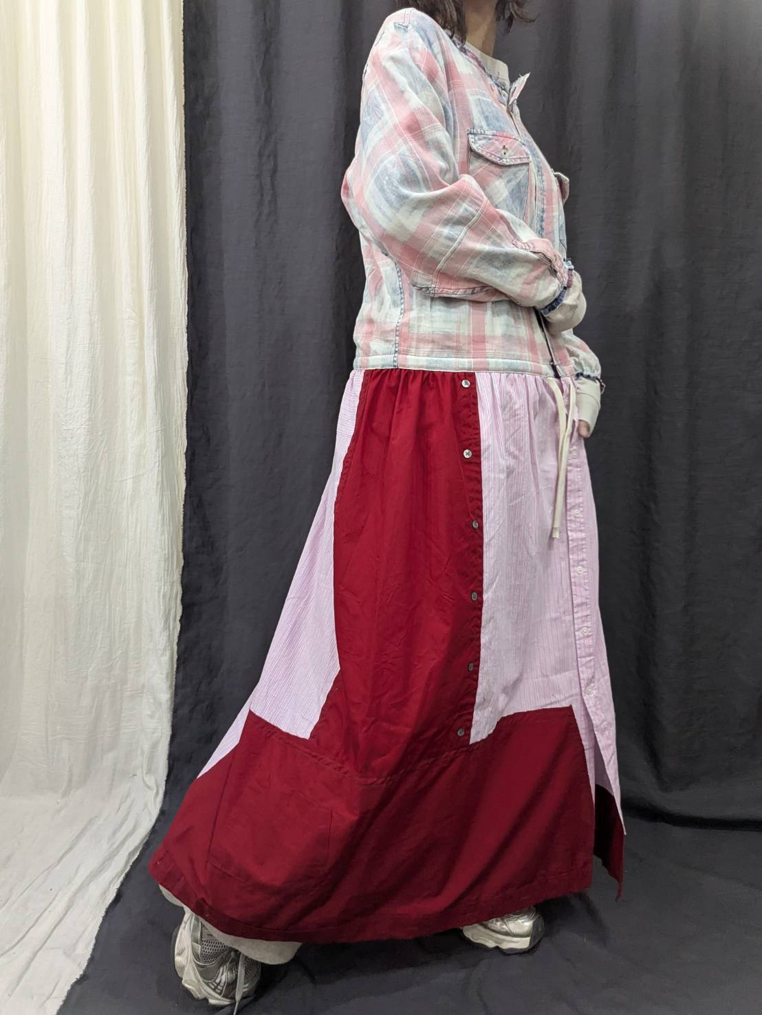 »デザインー古着のシャツを使用して再構築したリメイクワンピースです。シャツならではのディテールを活かしつつウエストの切り替えからしたはパッチワークでボリュームを持たせています。色落ちや風合いに違いが生むグラデーションや一点一点違う柄が一つとして同じ物がないスペシャルワンに仕上がっています。