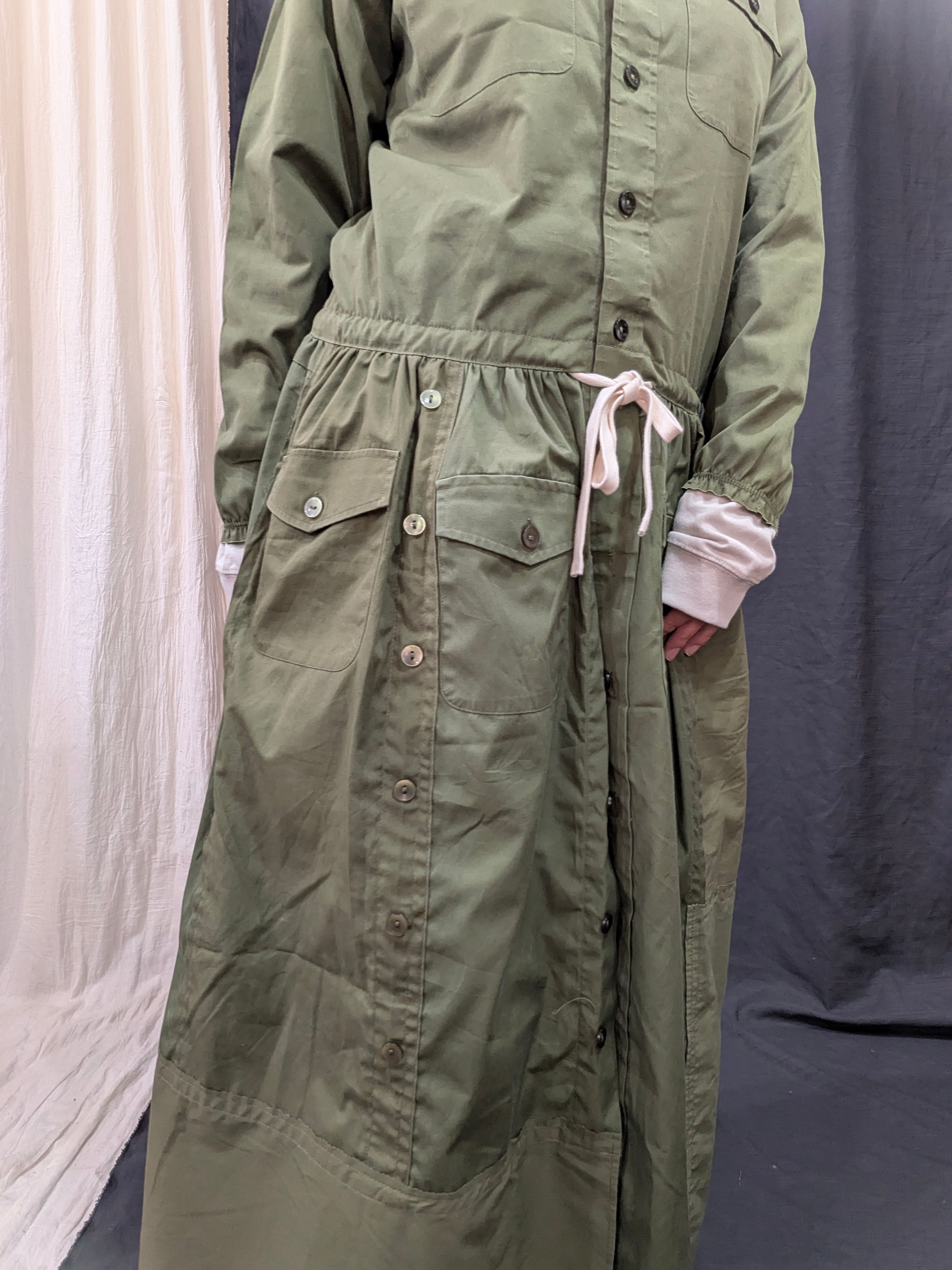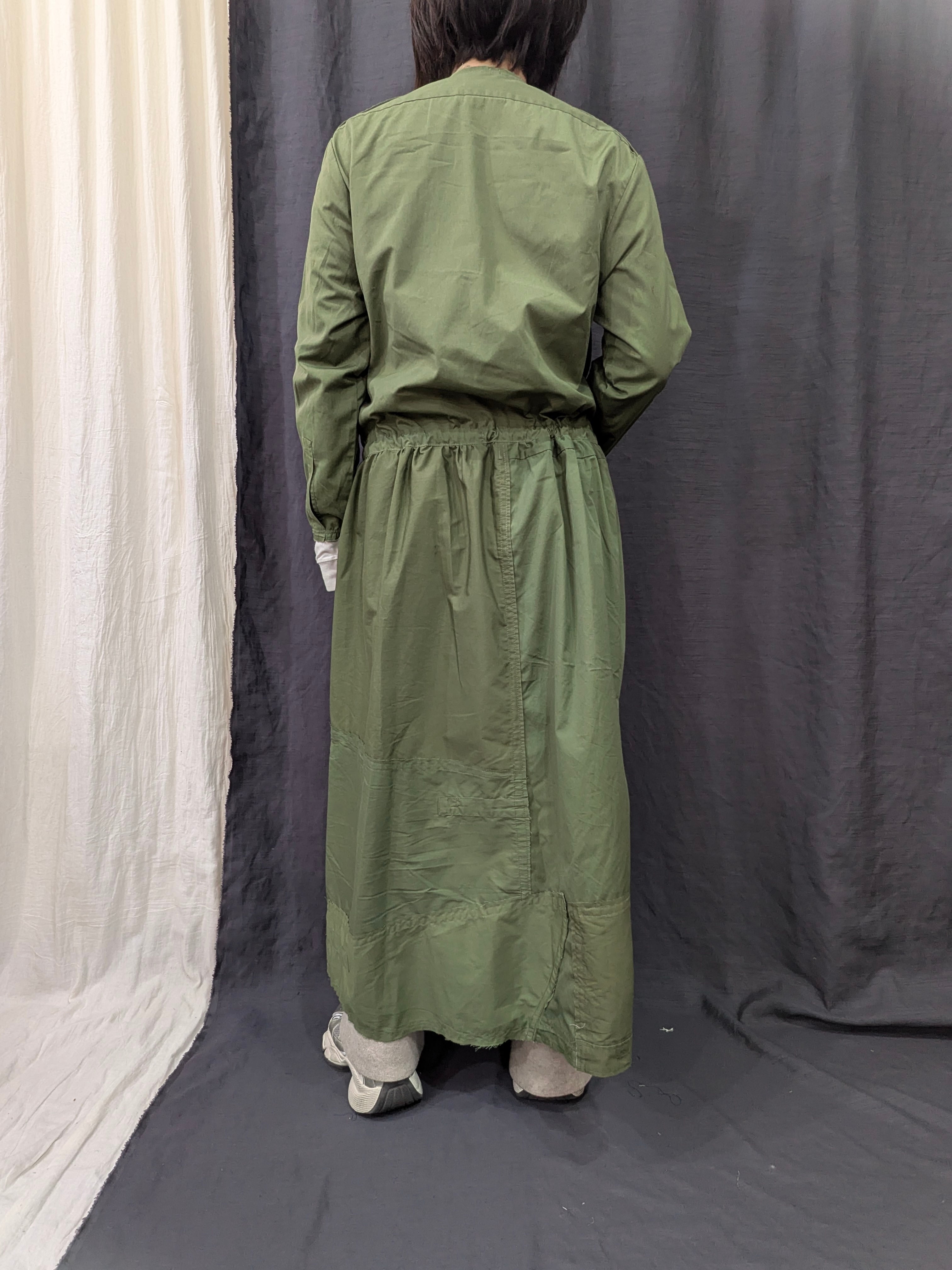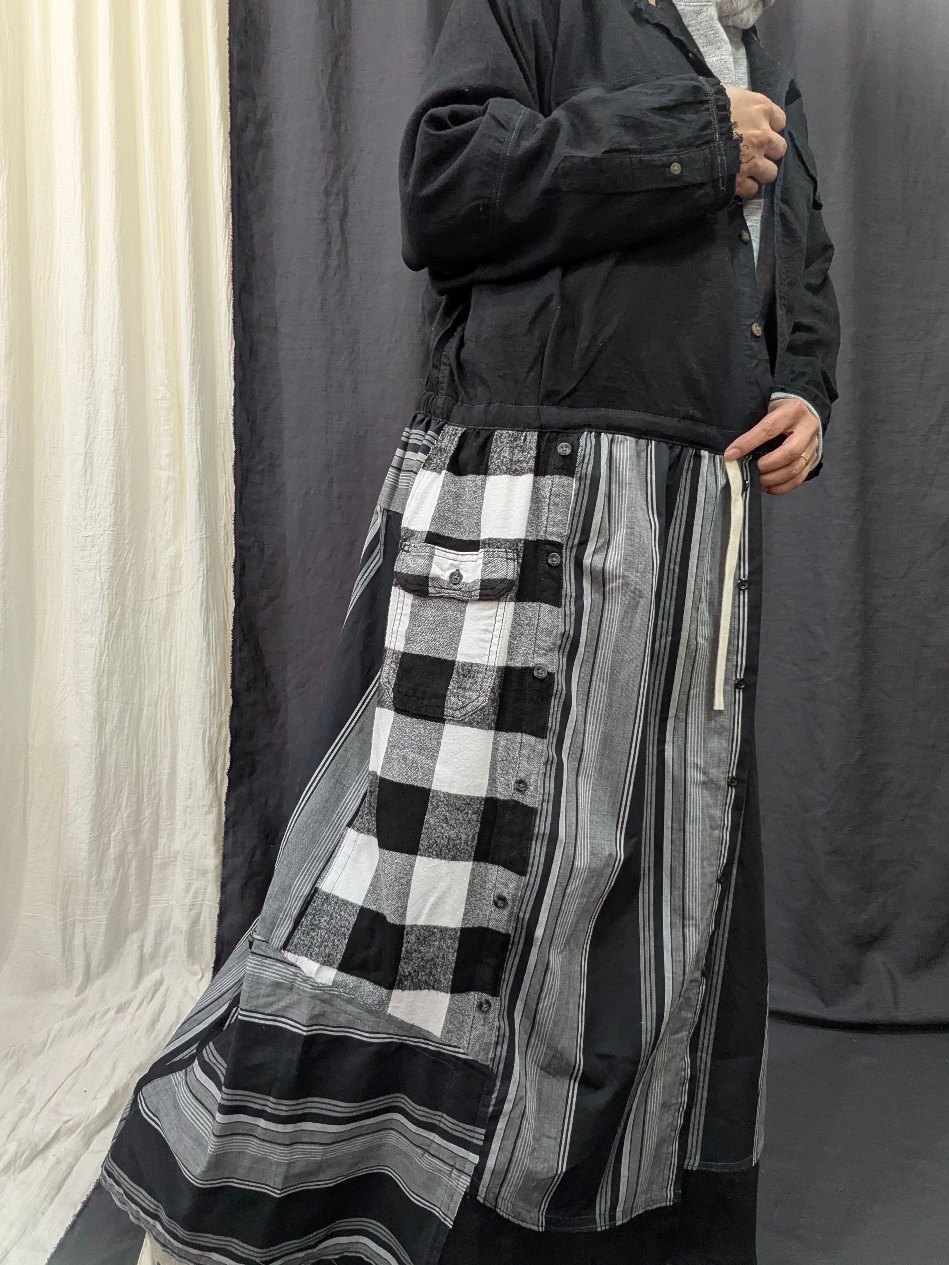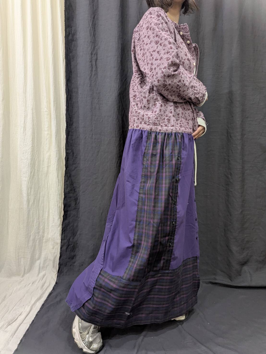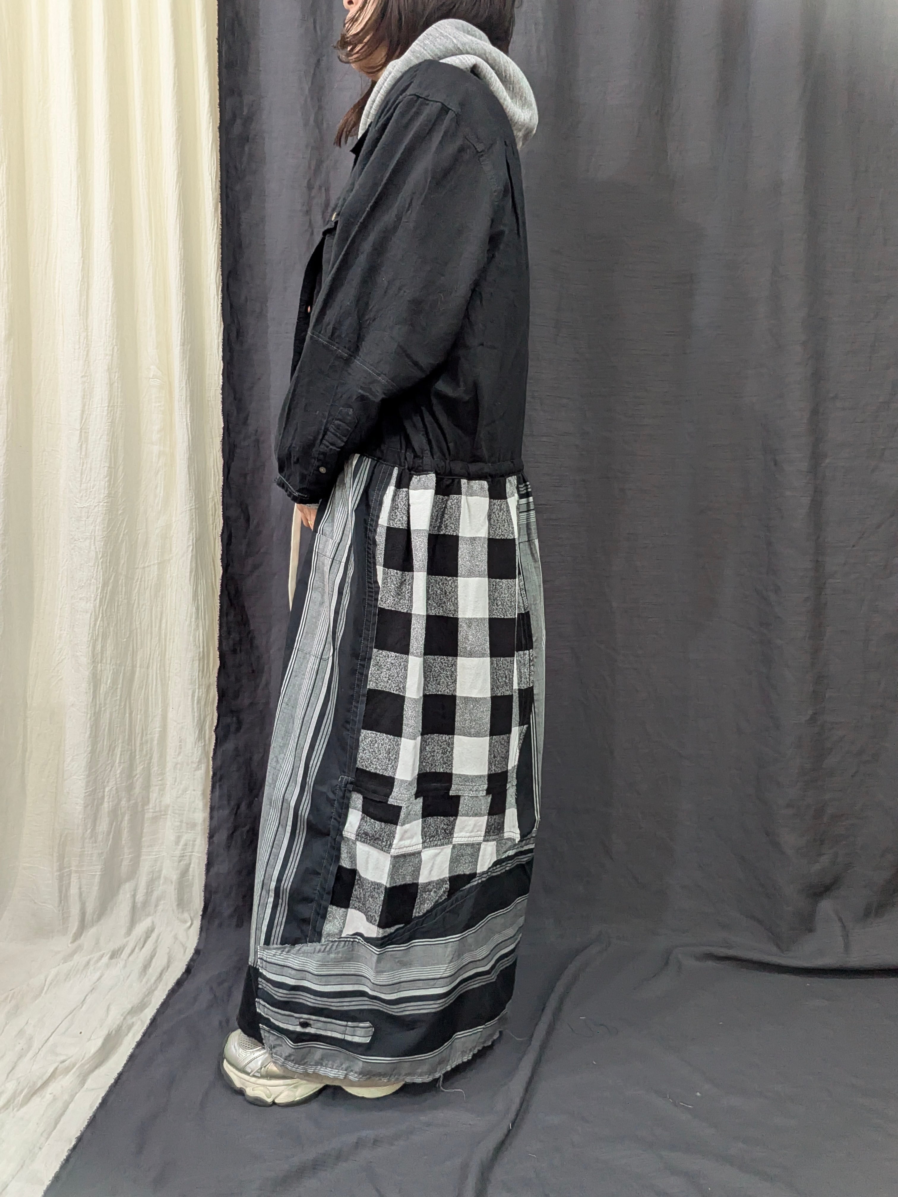 »デザインー古着のシャツを使用して再構築したリメイクワンピースです。シャツならではのディテールを活かしつつウエストの切り替えからしたはパッチワークでボリュームを持たせています。色落ちや風合いに違いが生むグラデーションや一点一点違う柄が一つとして同じ物がないスペシャルワンに仕上がっています。