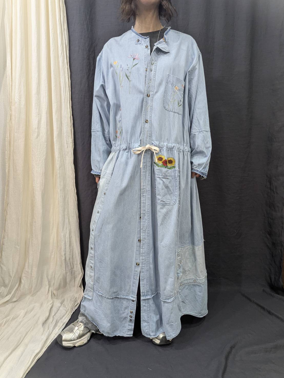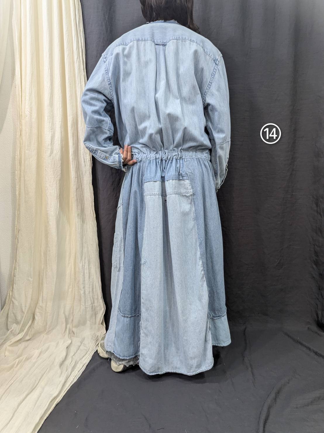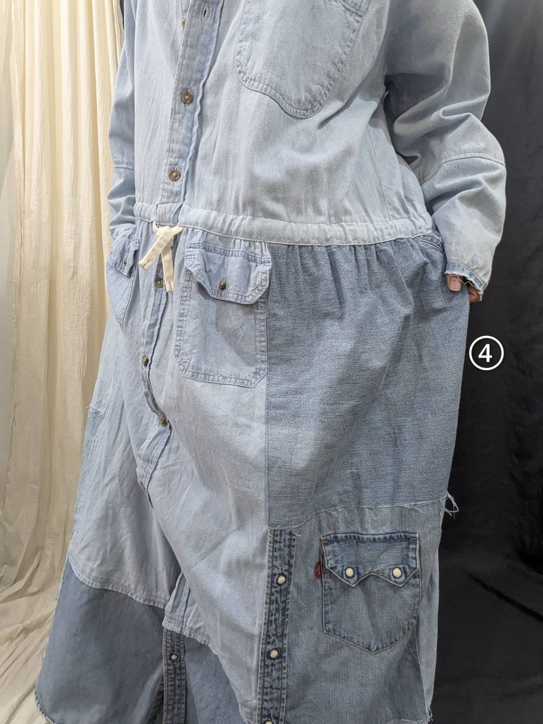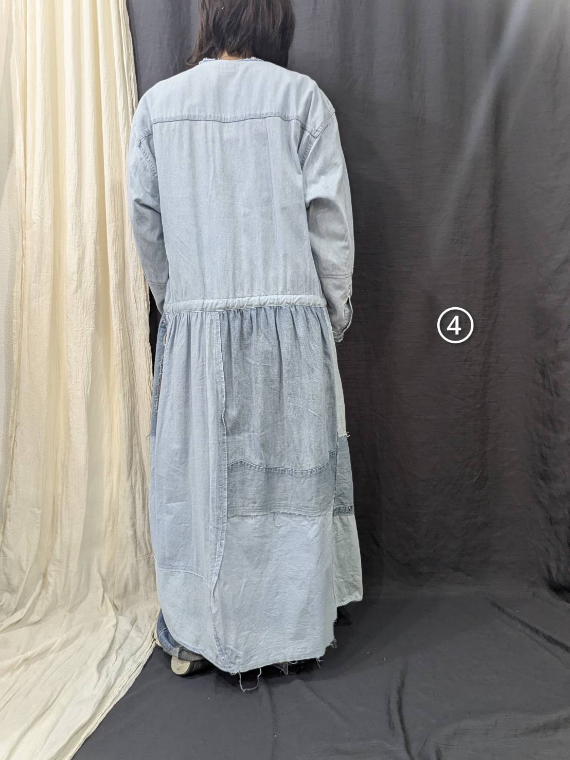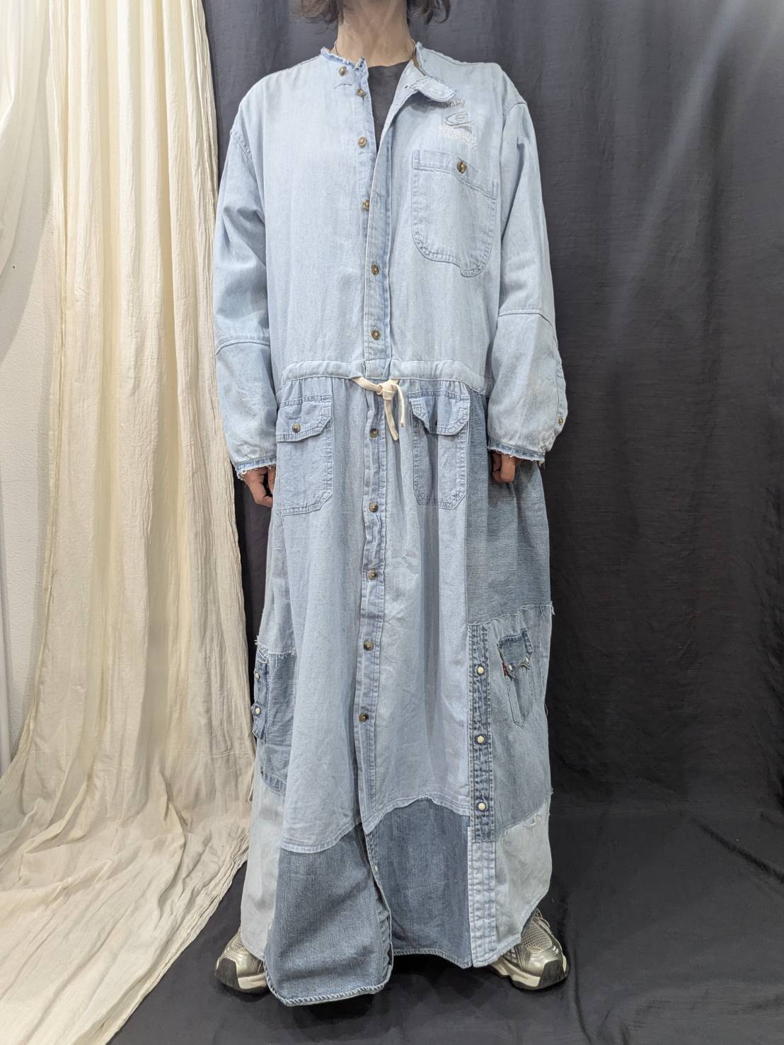 »デザインー古着のシャツを使用して再構築したリメイクワンピースです。シャツならではのディテールを活かしつつウエストの切り替えからしたはパッチワークでボリュームを持たせています。色落ちや風合いに違いが生むグラデーションや一点一点違う柄が一つとして同じ物がないスペシャルワンに仕上がっています。