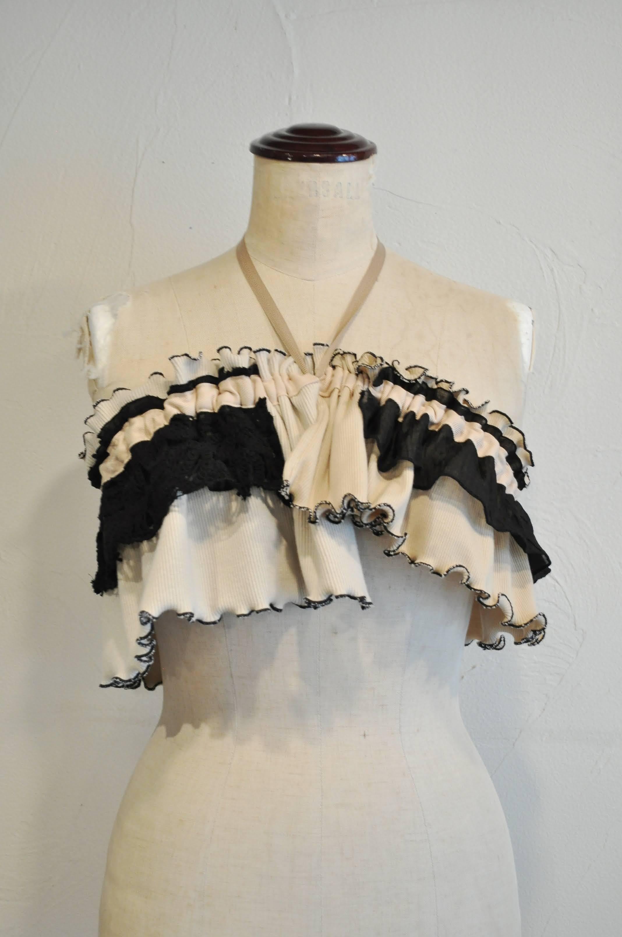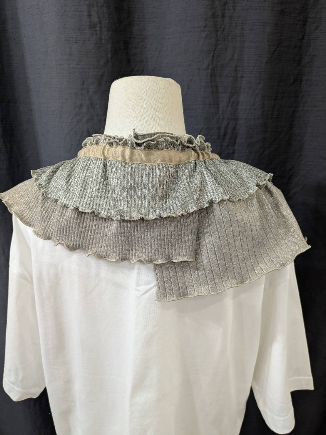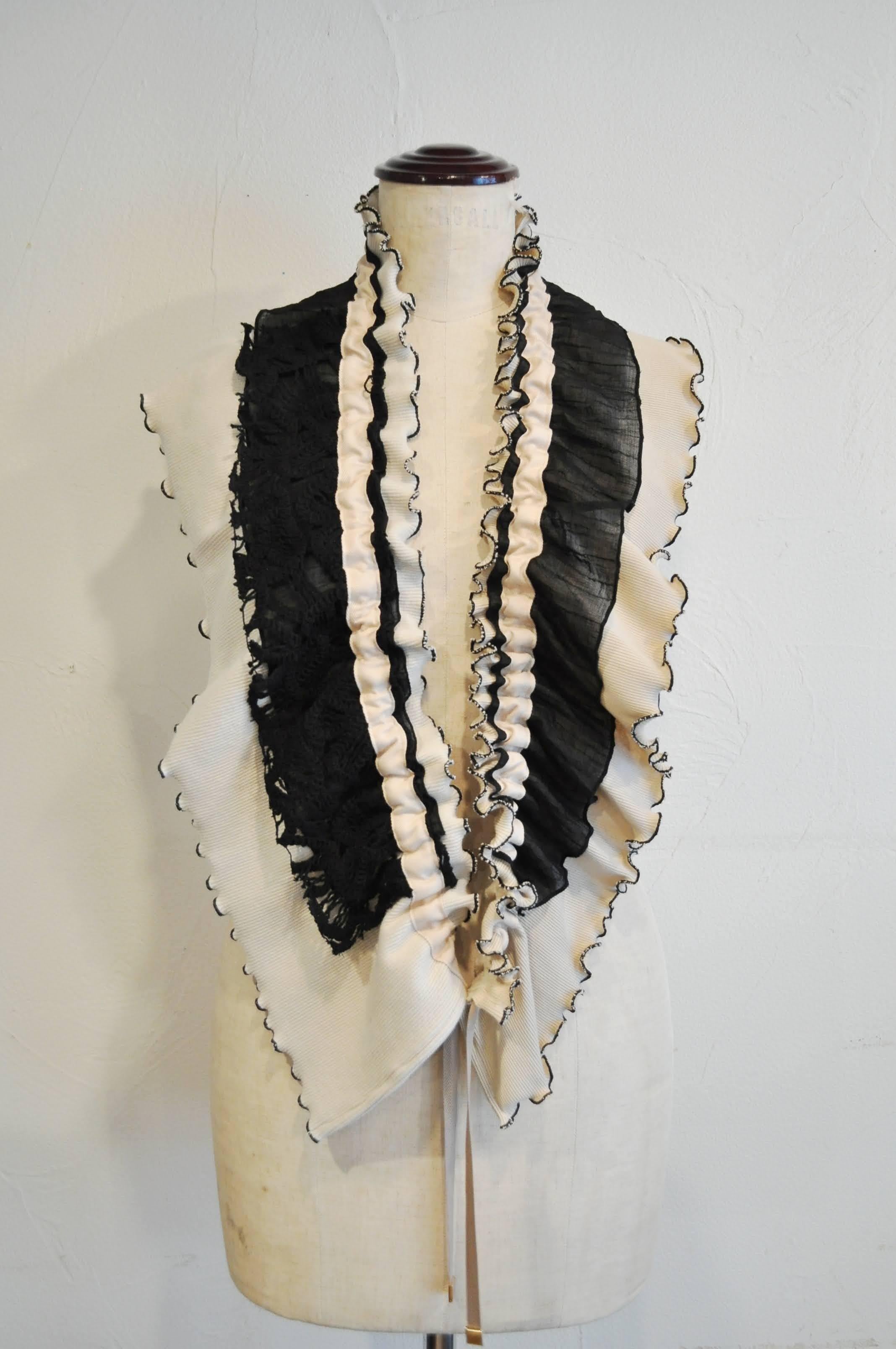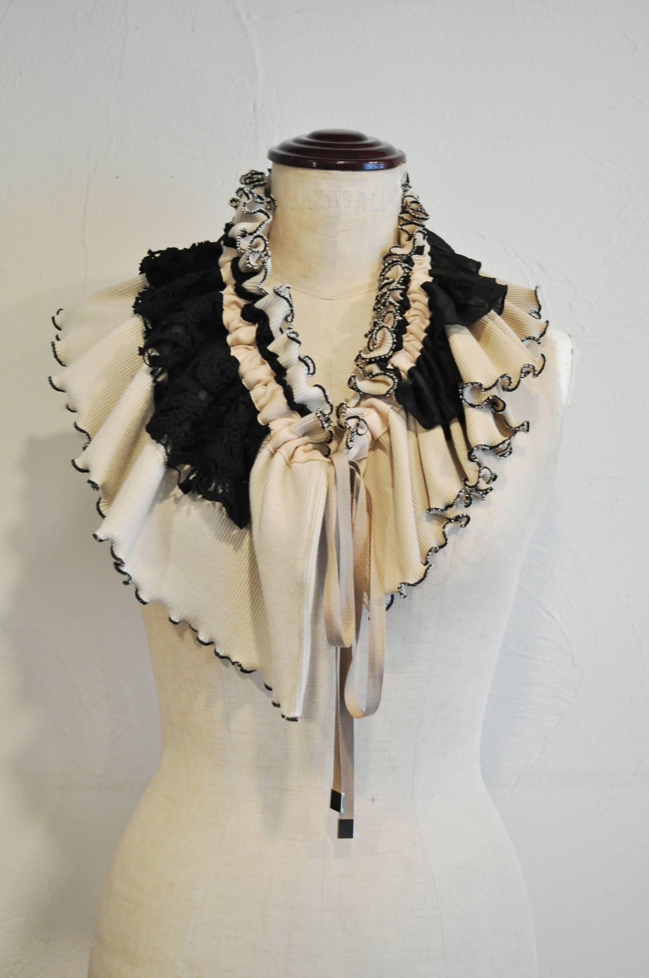 デザインーリブを中心に色々な素材を組み合わせて、フリルカラーを作りました。紐の引き具合によって長さを調節でき、襟として、たすき掛けや腰に巻いたりと沢山の着方を楽しめます。