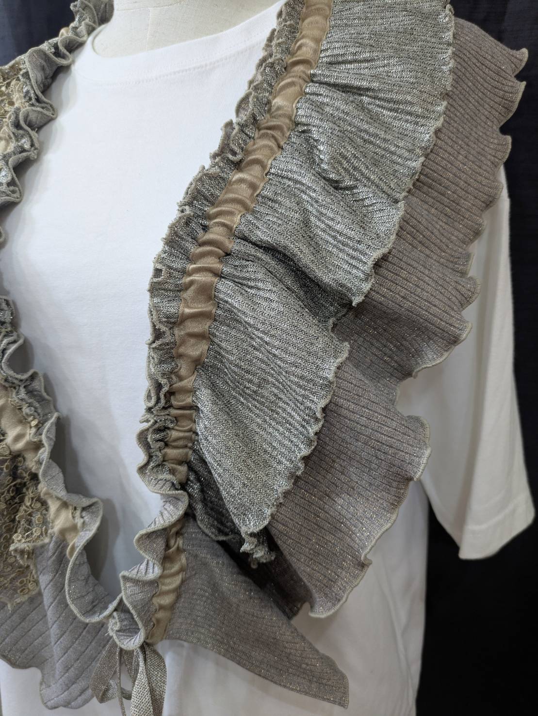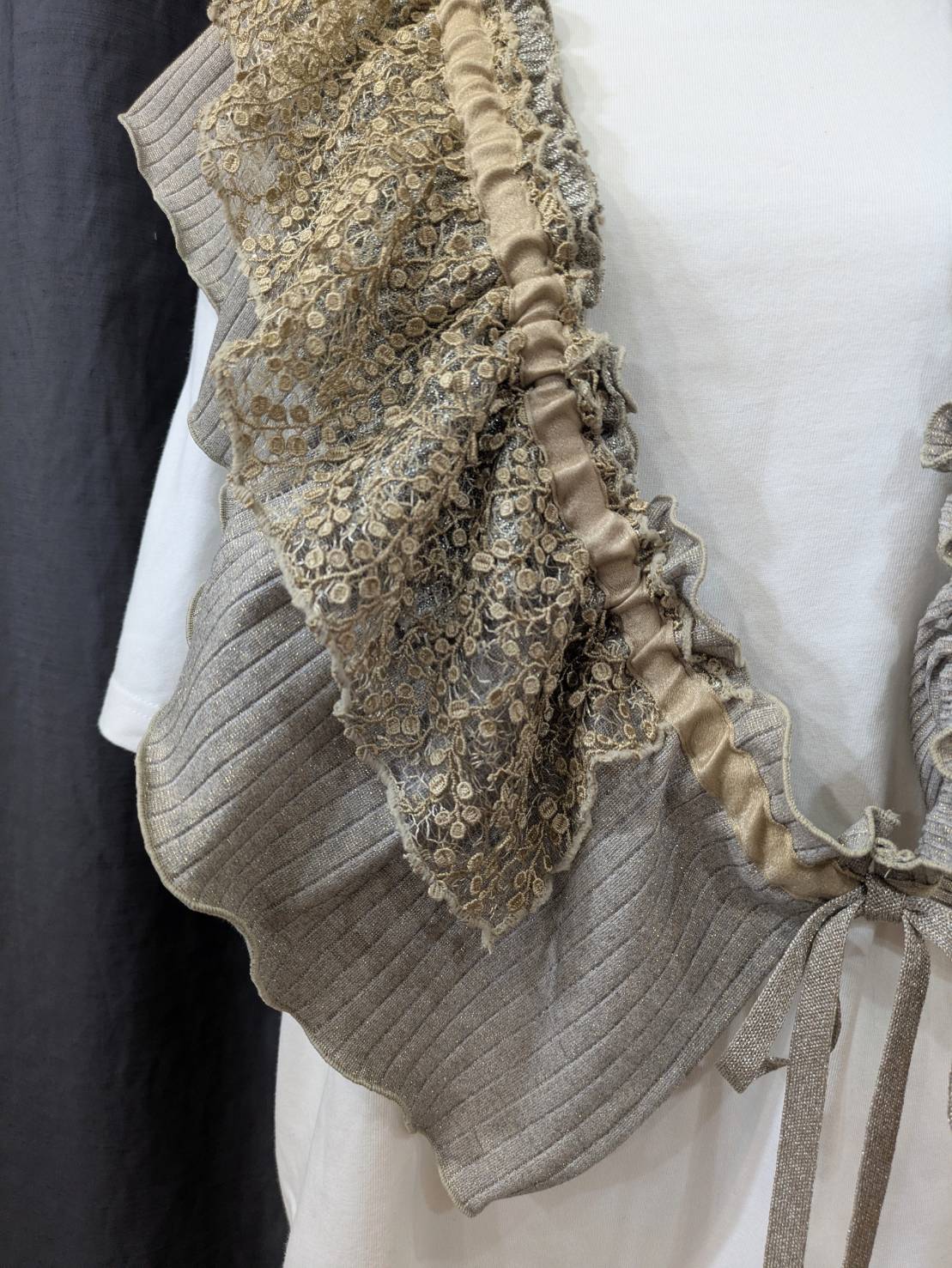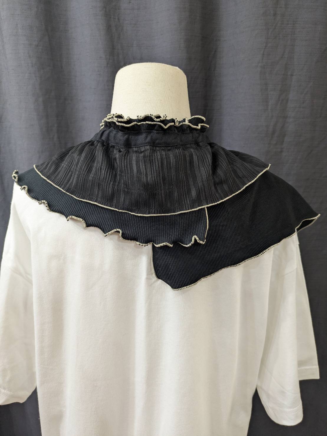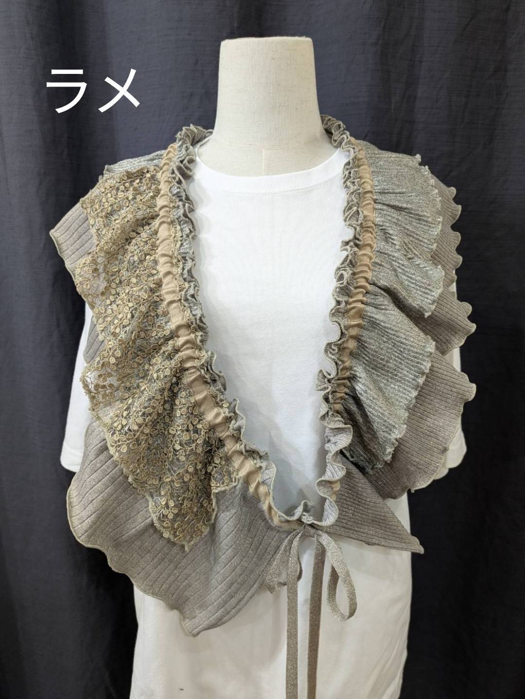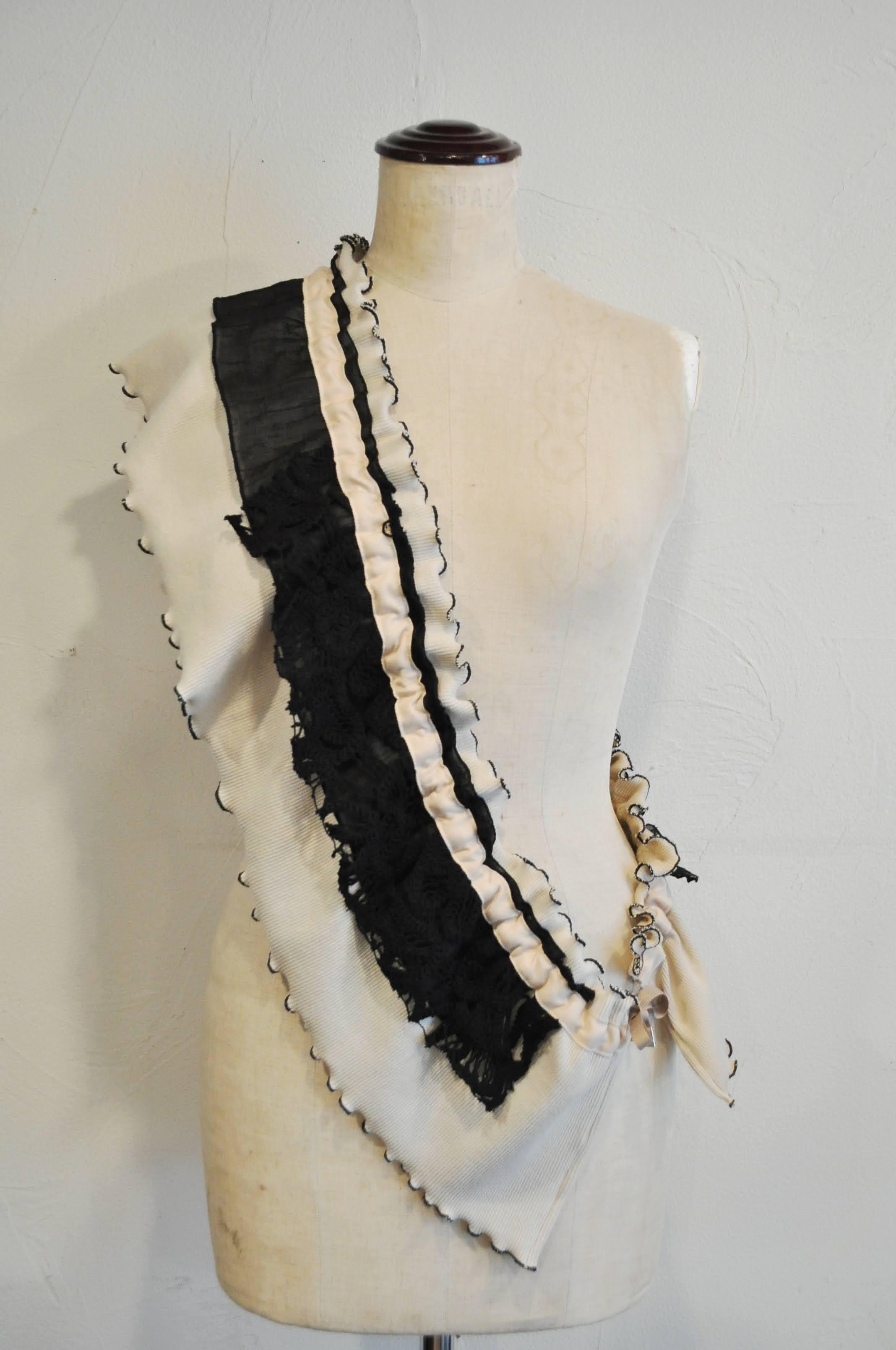 デザインーリブを中心に色々な素材を組み合わせて、フリルカラーを作りました。紐の引き具合によって長さを調節でき、襟として、たすき掛けや腰に巻いたりと沢山の着方を楽しめます。