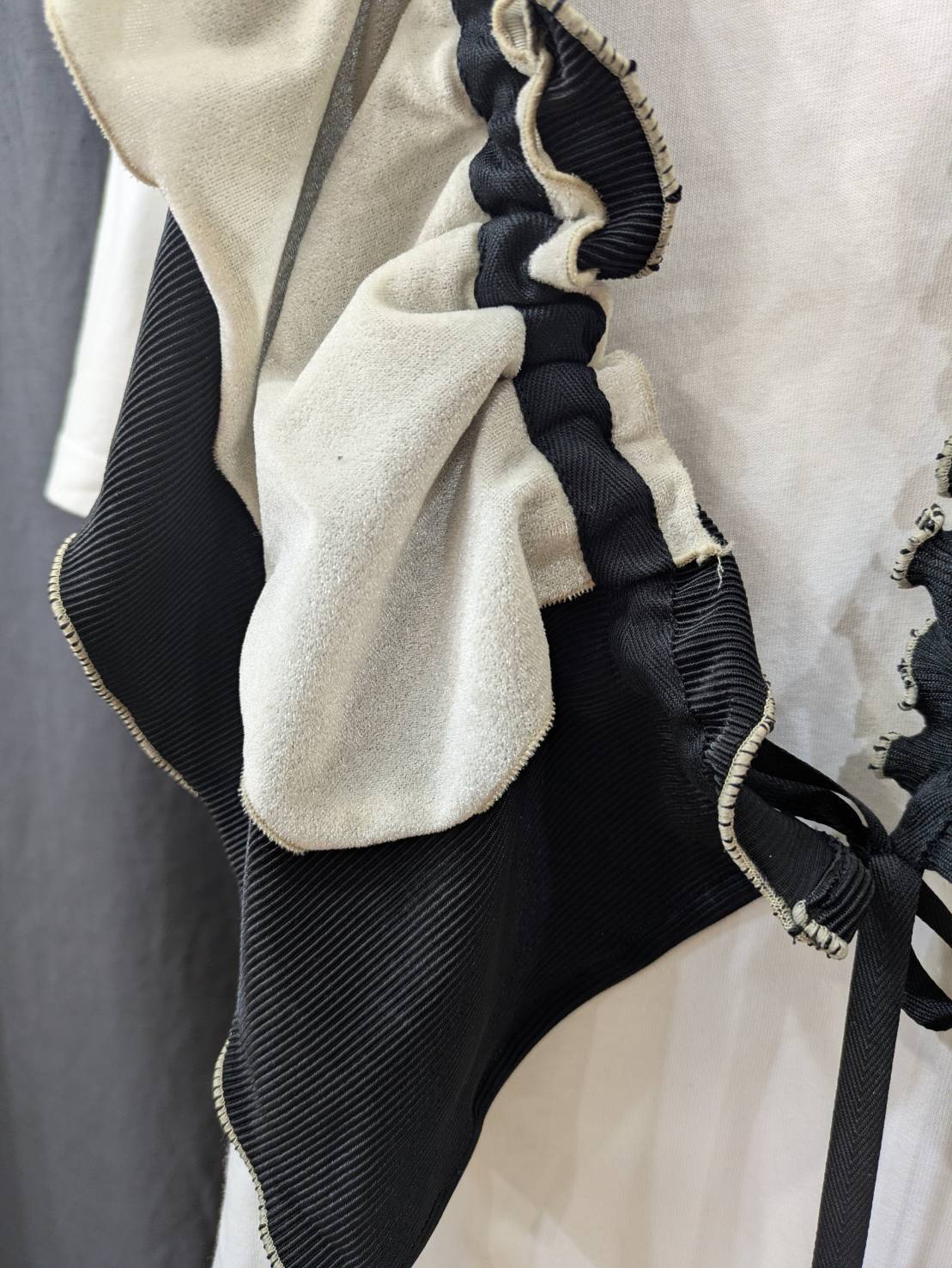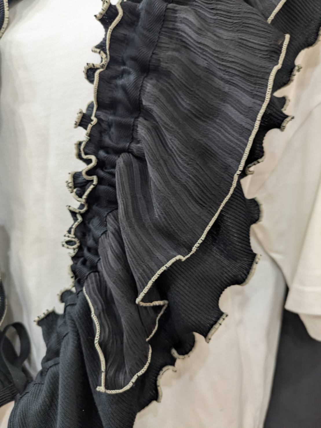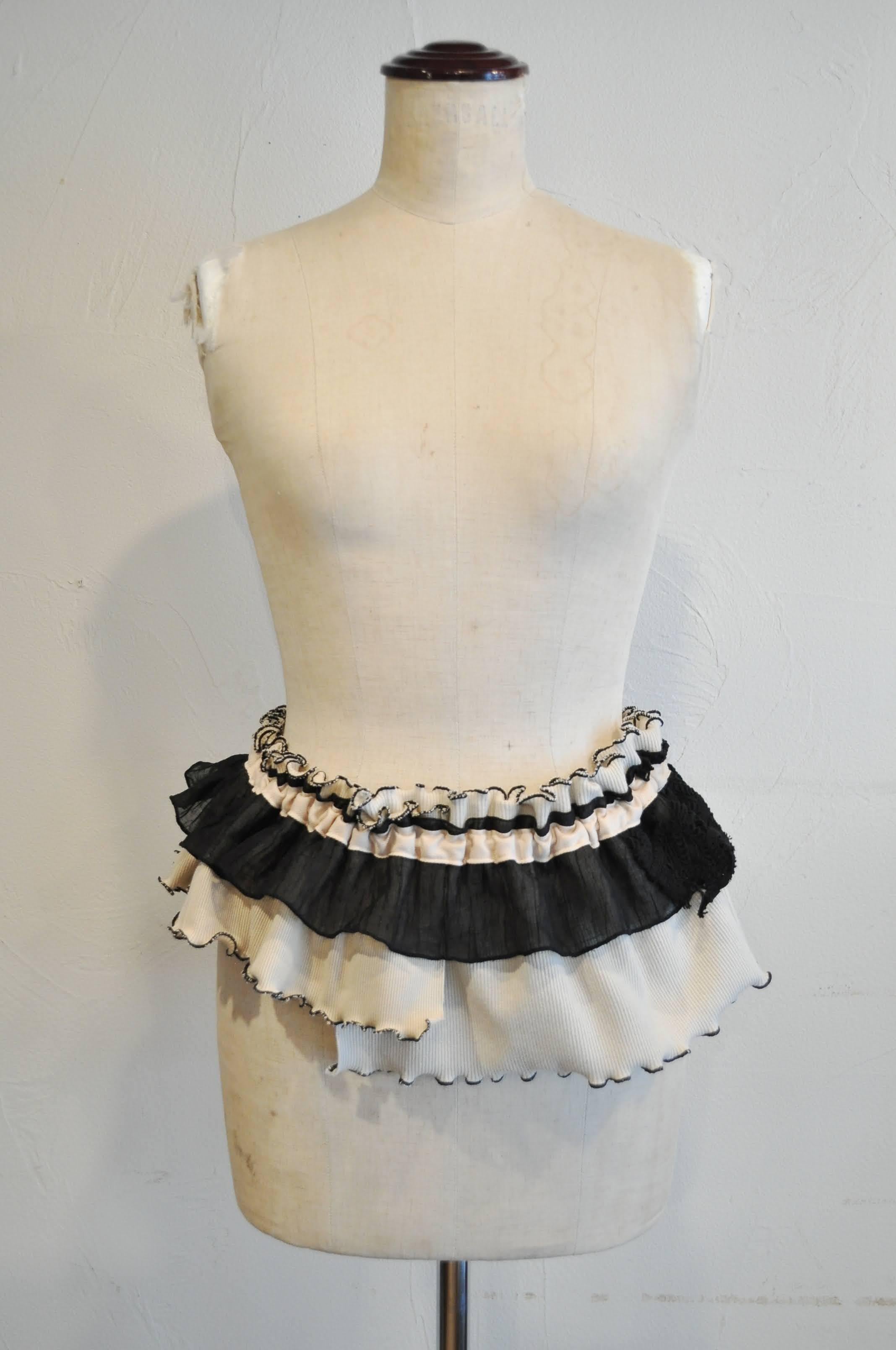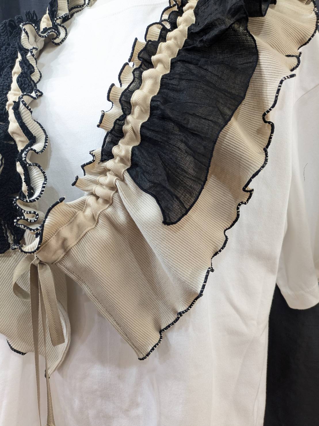 デザインーリブを中心に色々な素材を組み合わせて、フリルカラーを作りました。紐の引き具合によって長さを調節でき、襟として、たすき掛けや腰に巻いたりと沢山の着方を楽しめます。