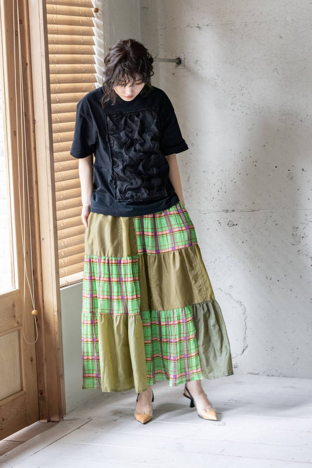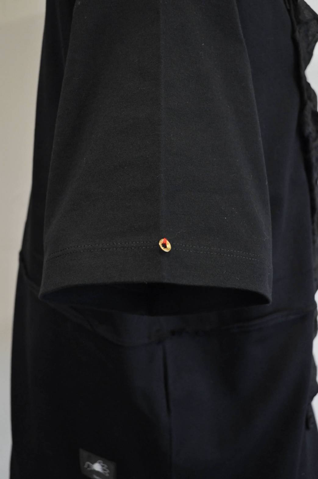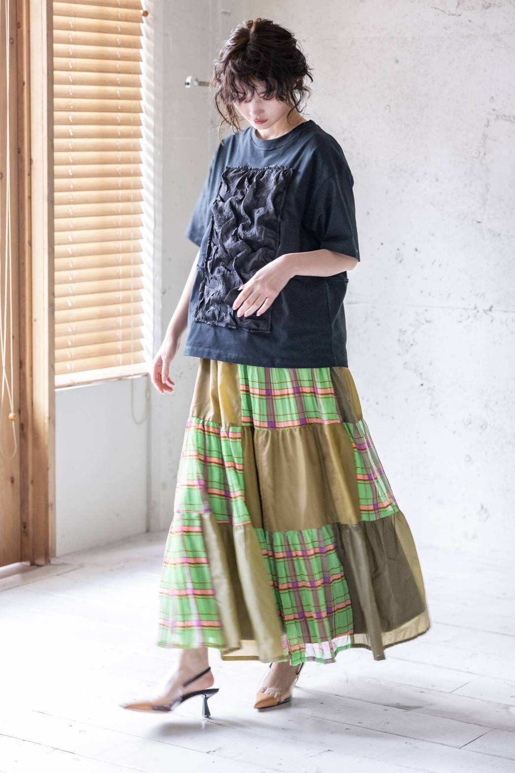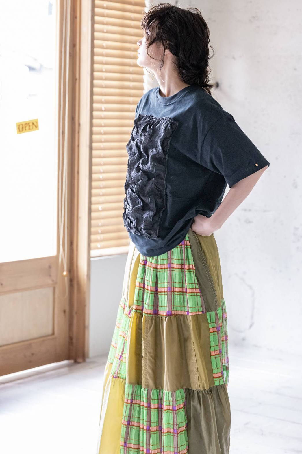 シンプルなティシャツのフロントに、立体的なモチーフのファブリックを縫い付けた印象的なデザインティシャツです。