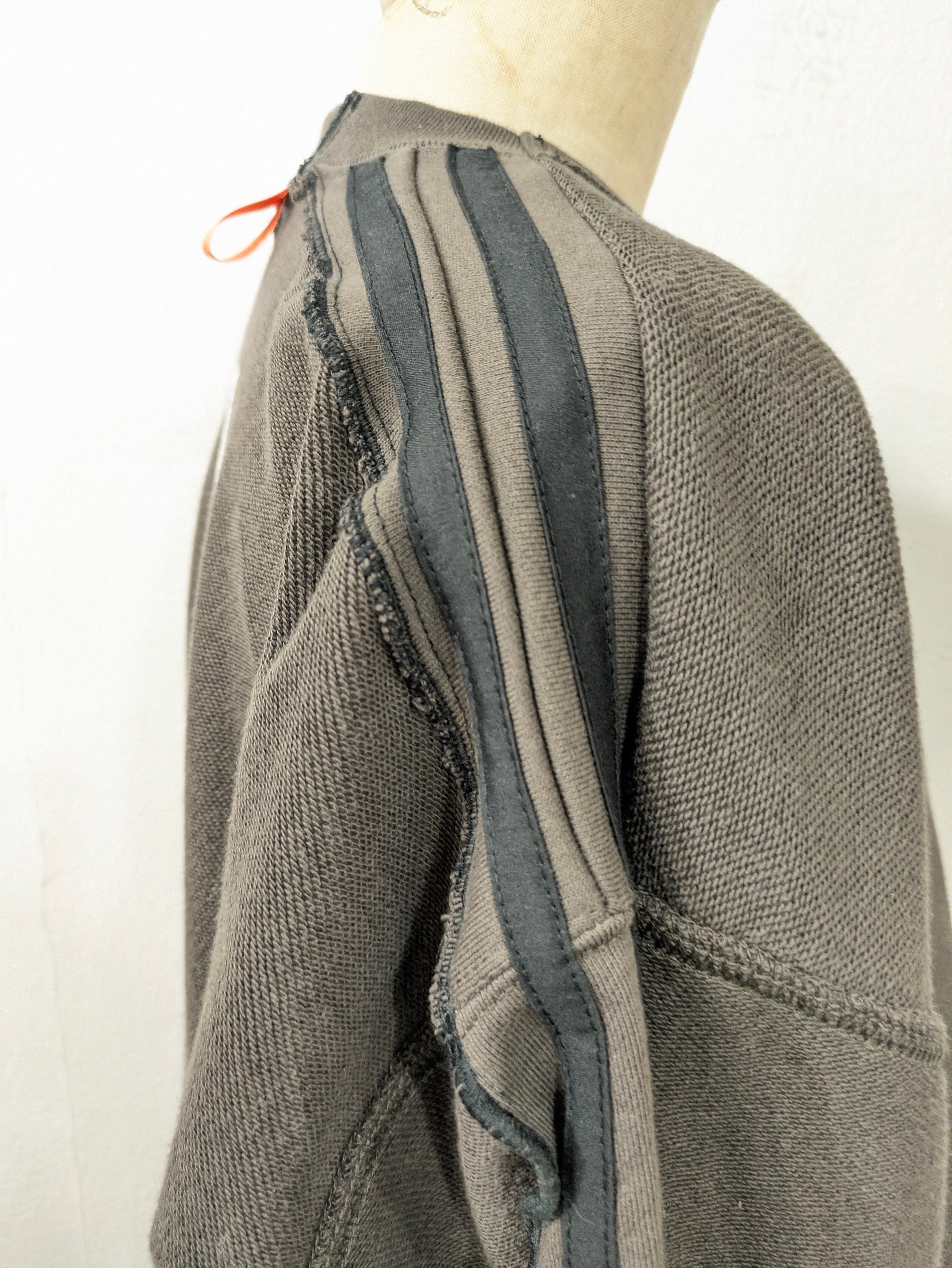 »デザインーパイル地のスウェットを裏仕様でリメイクしています。裏のパイルを表使いにし、肩に2本のラインが一直線に入っています。肩ラインの切り替えは表地を使い、生地の濃淡を出しています、又縫い代を表に出したりと、一味も二味違う1枚です。