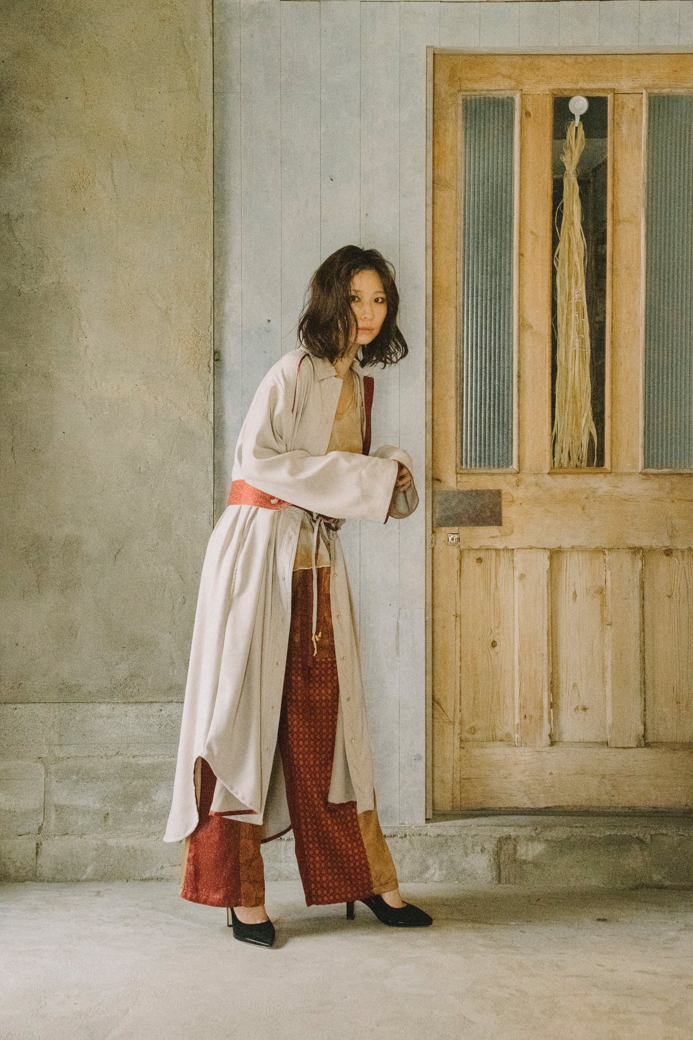 パンツと重ねて着た時、前を開けても閉めてもバランスがとりやすい様に設計しました。
