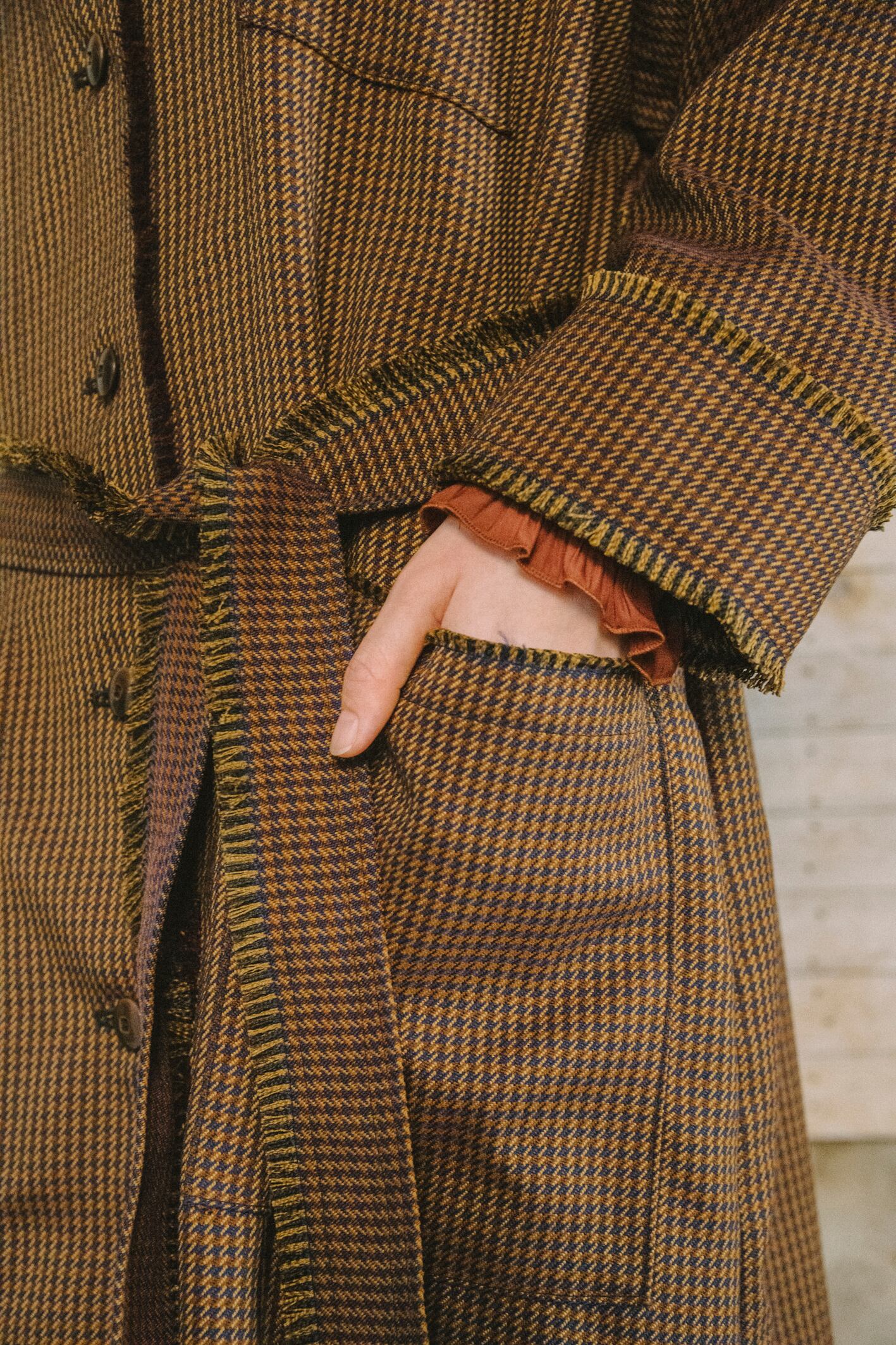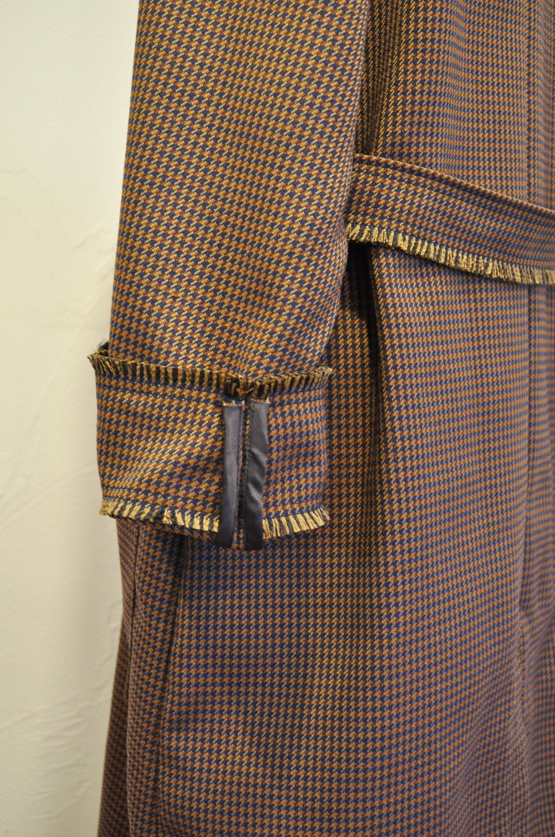 前立て、衿橋、裾、袖口、ポケット口、ベルトは手作業でフリンジを作ります。