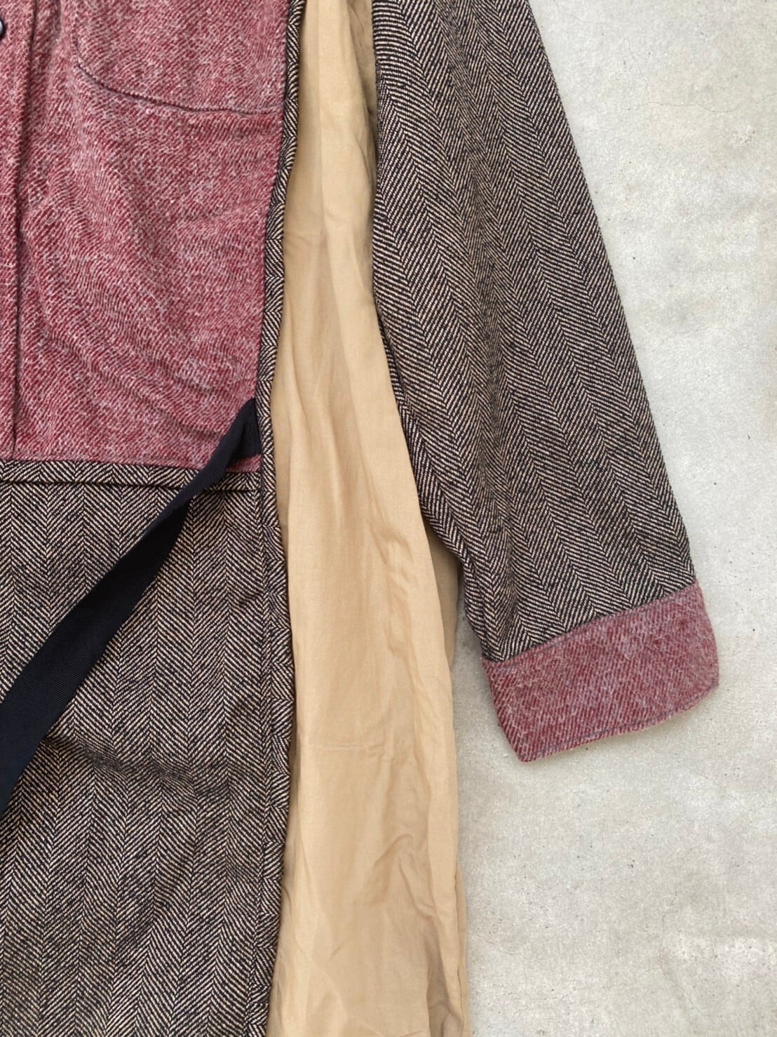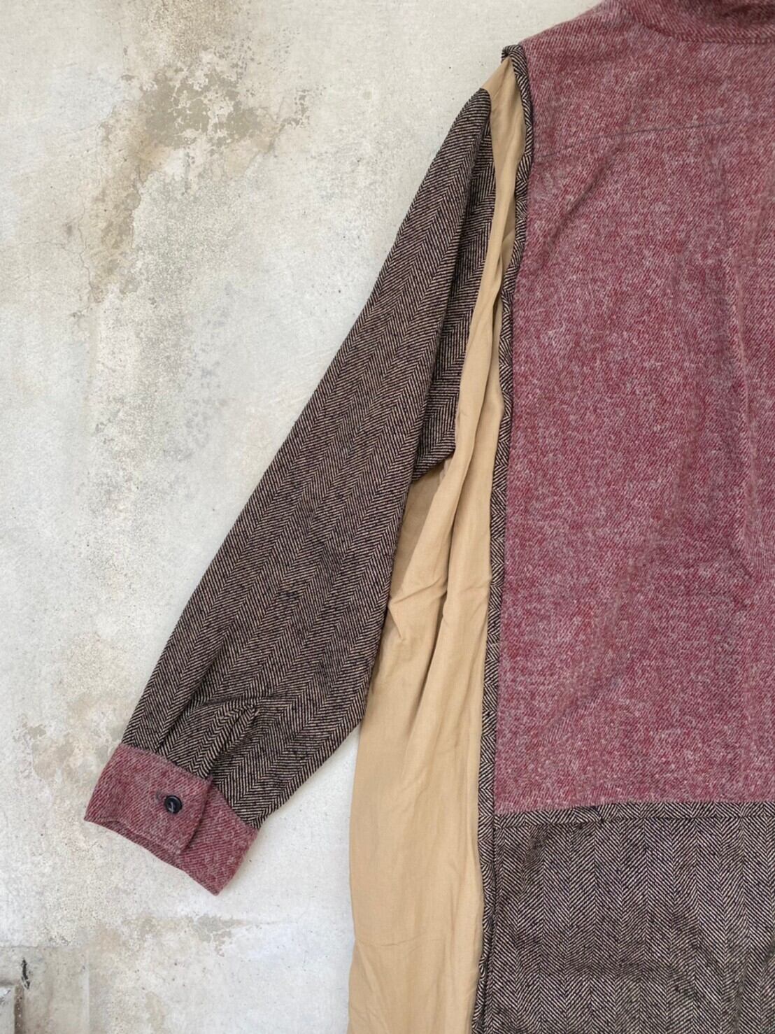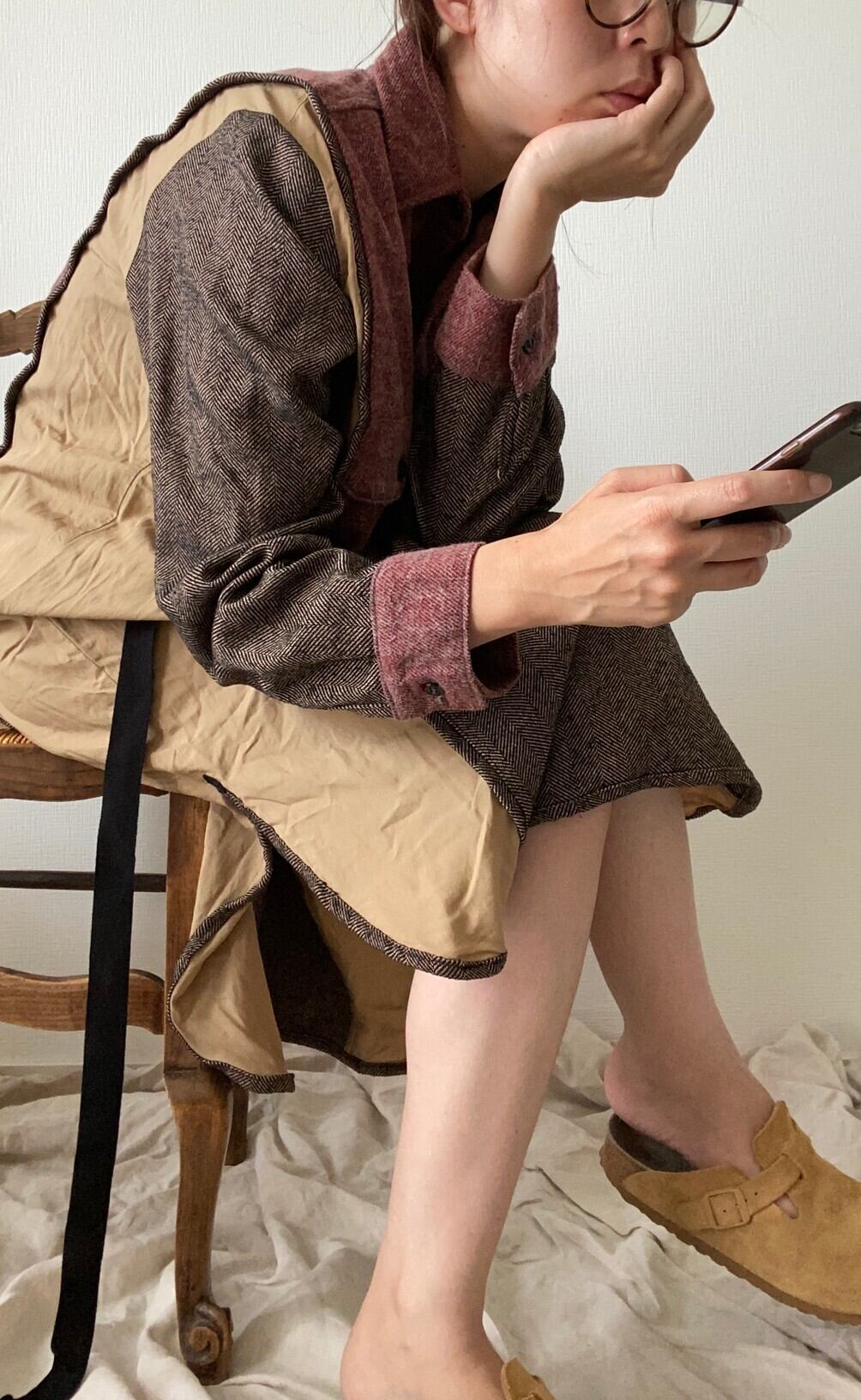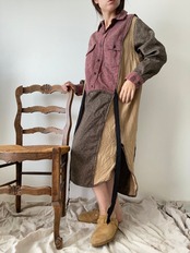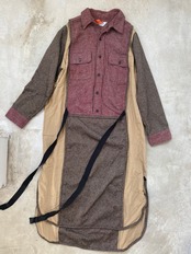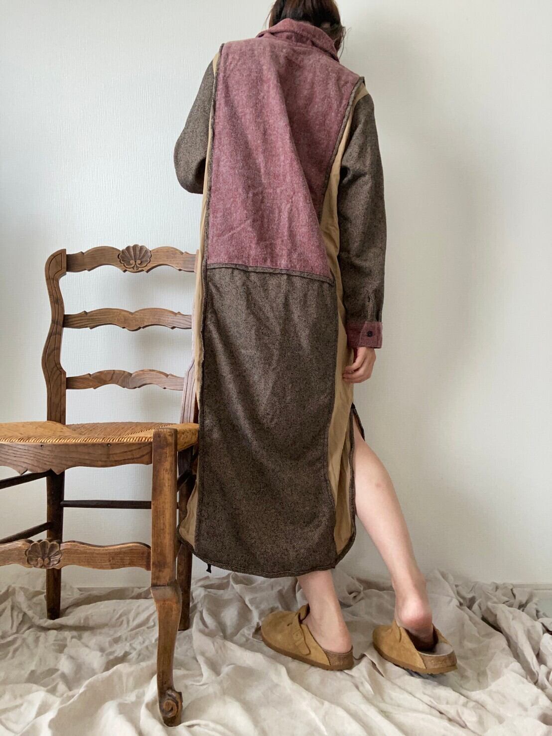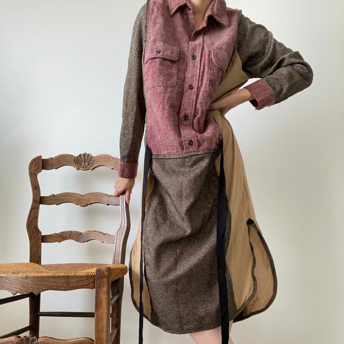 ユーズドのネルシャツをベースにパッチワークでリメイクしたワンピース。