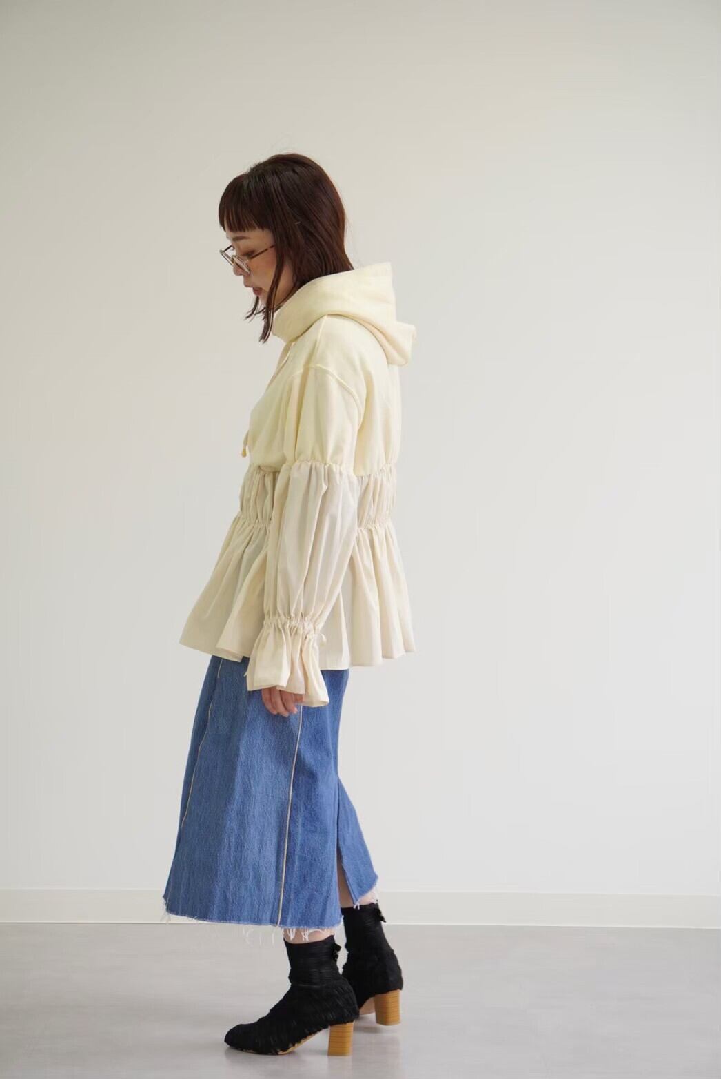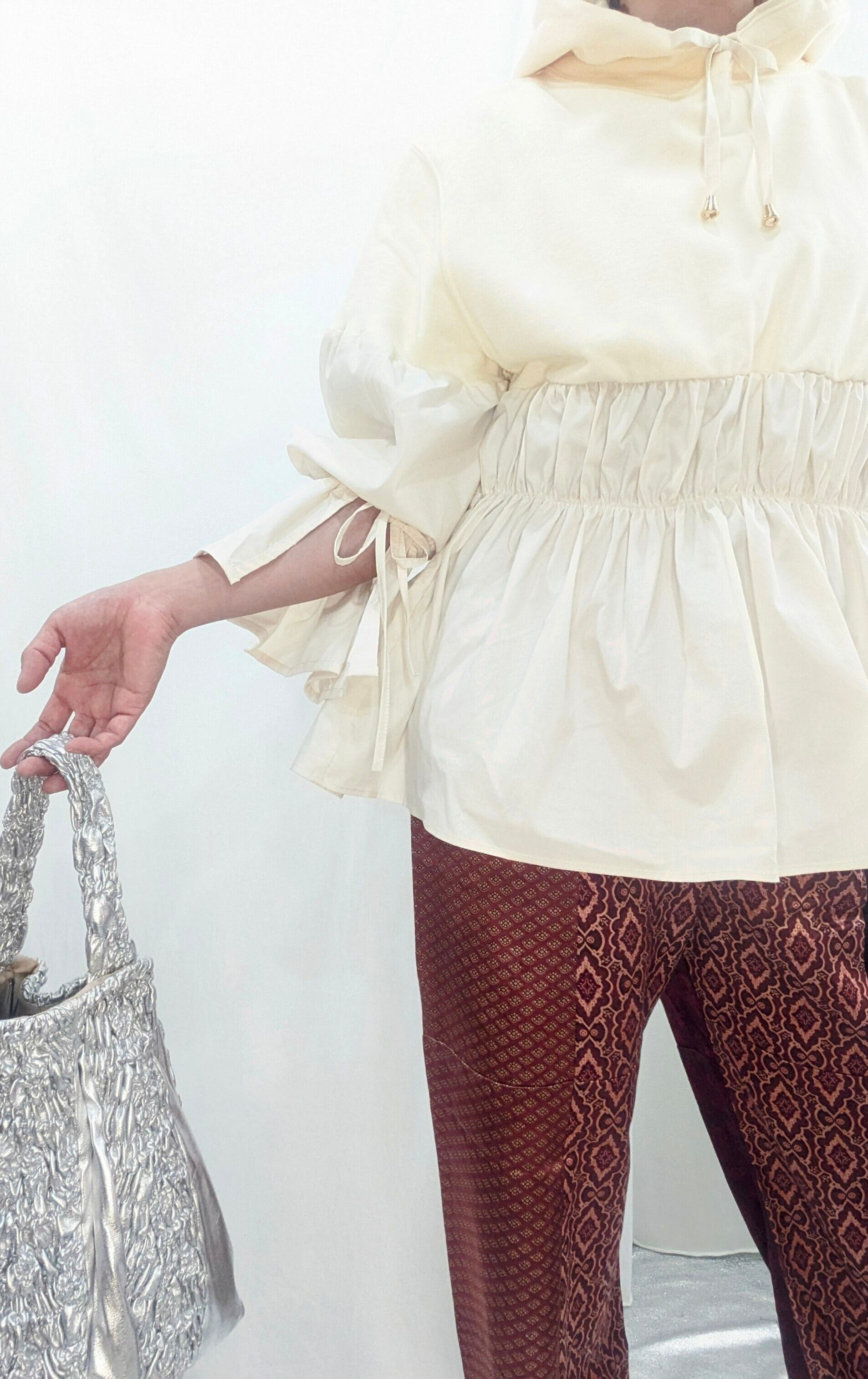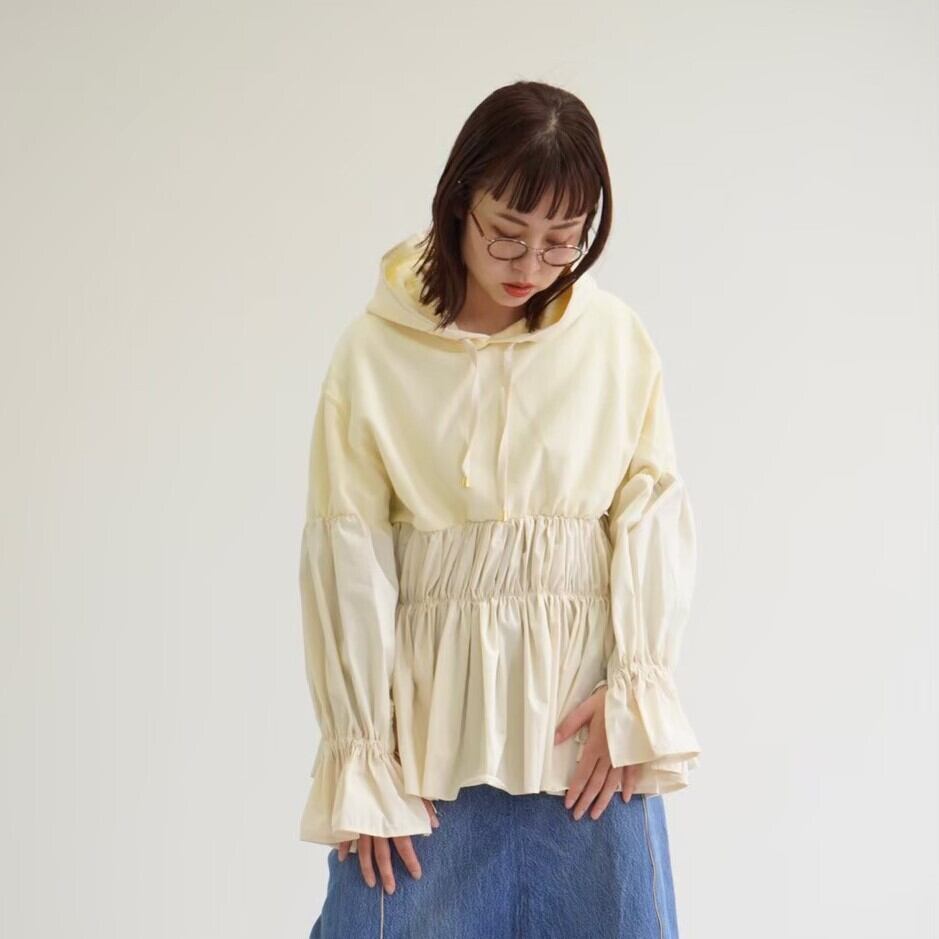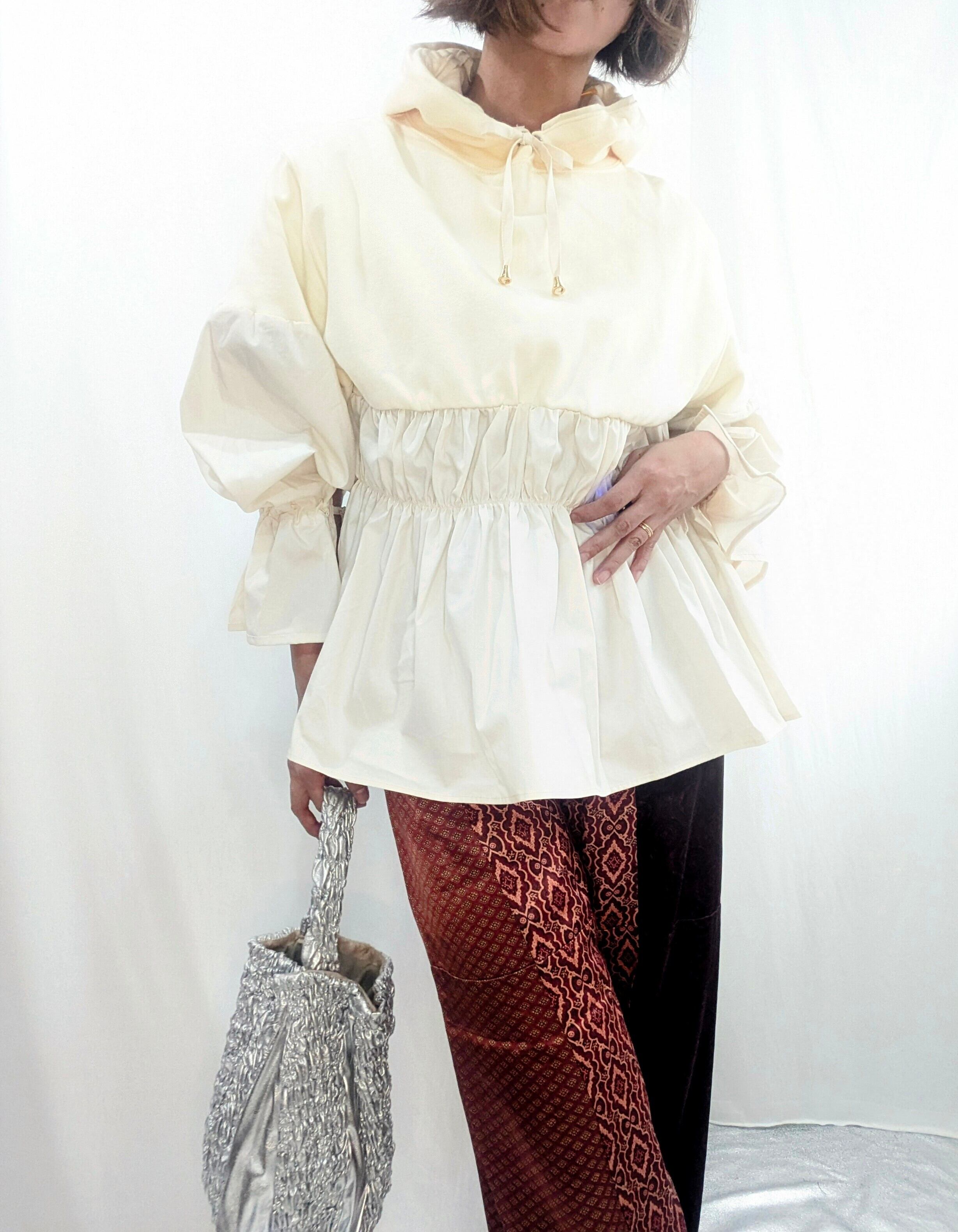 厚みのあるパーカーと高密度のタイプライターを掛け合わせたスウェットブラウスです。