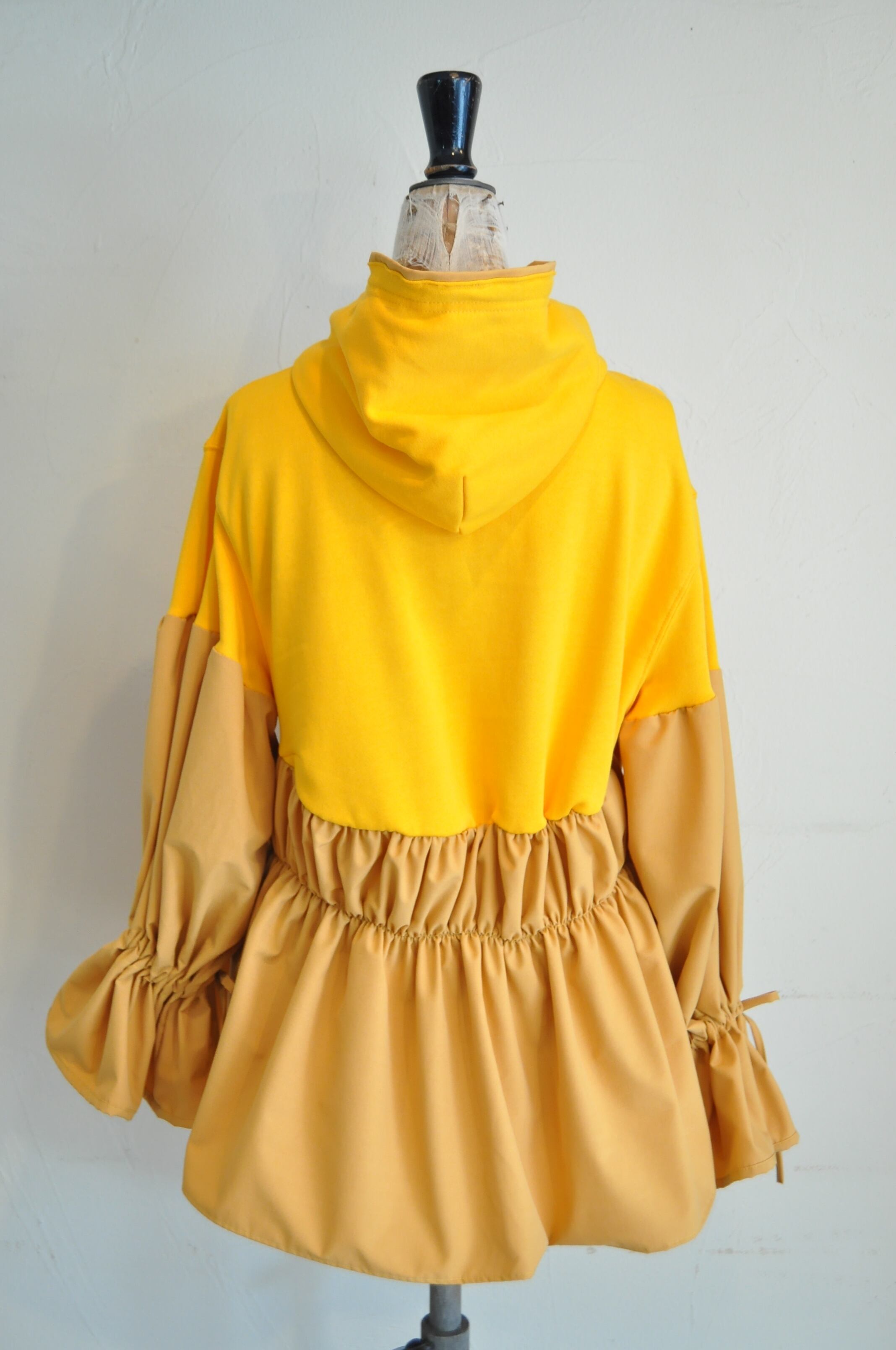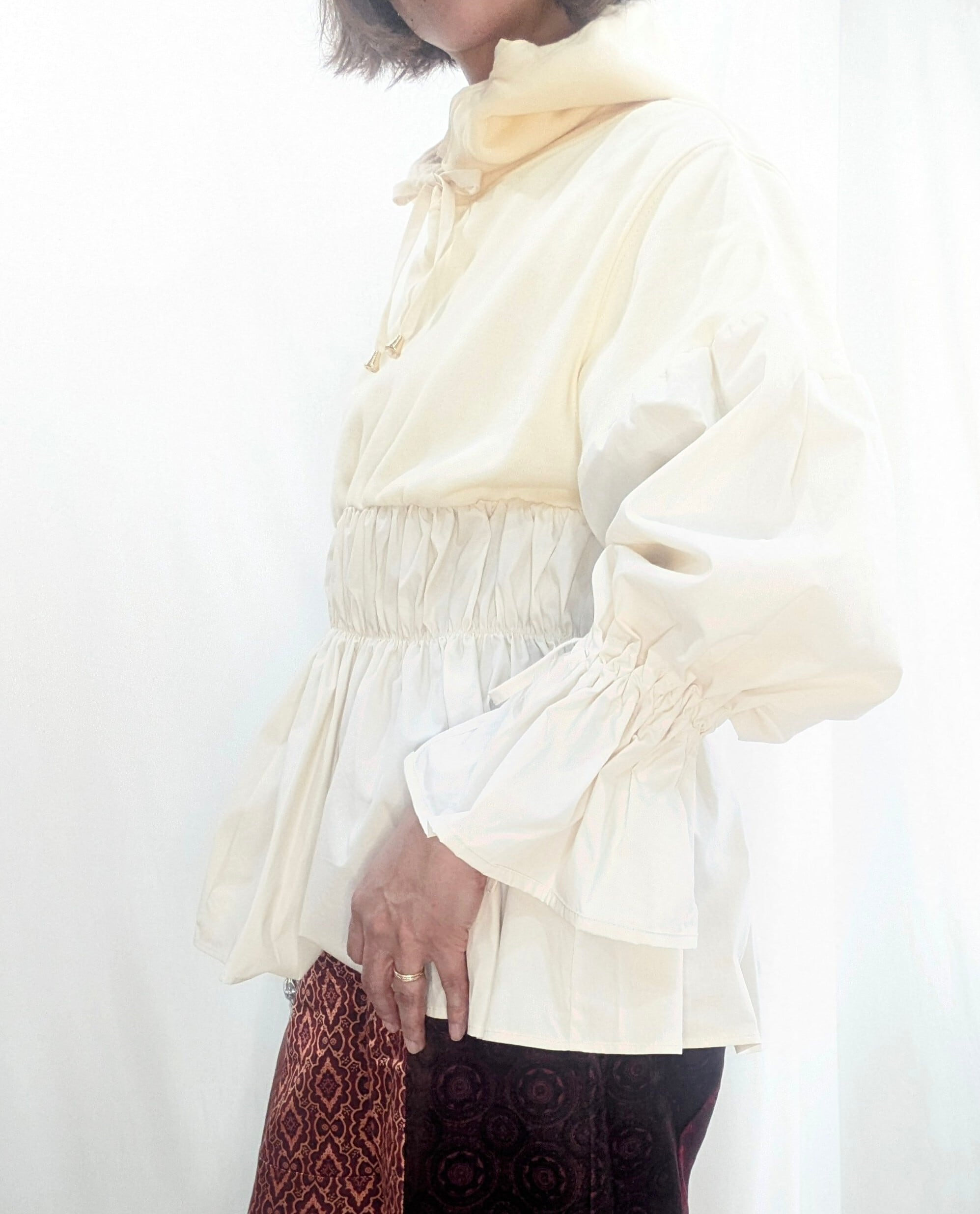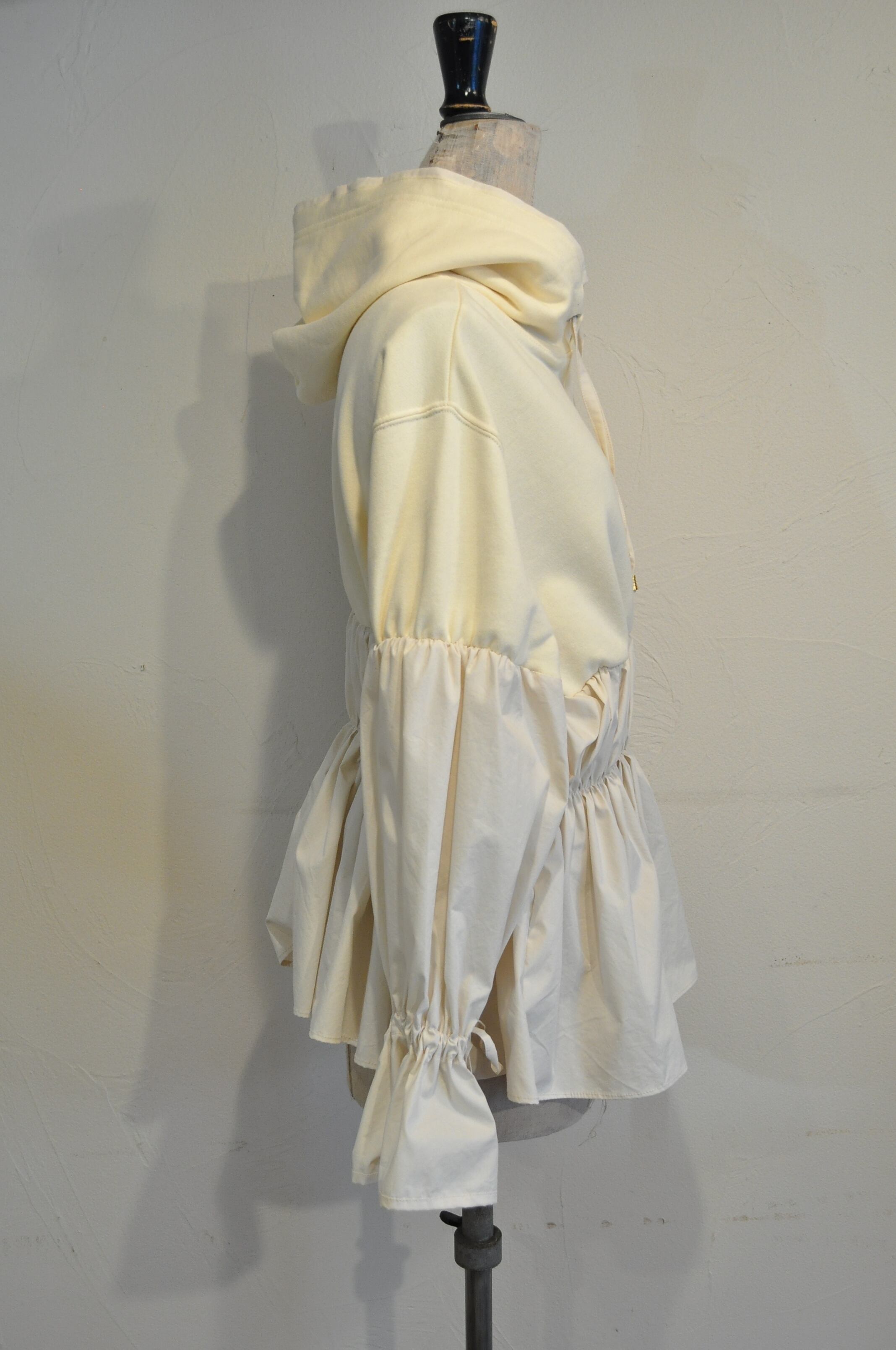 厚みのあるパーカーと高密度のタイプライターを掛け合わせたスウェットブラウスです。