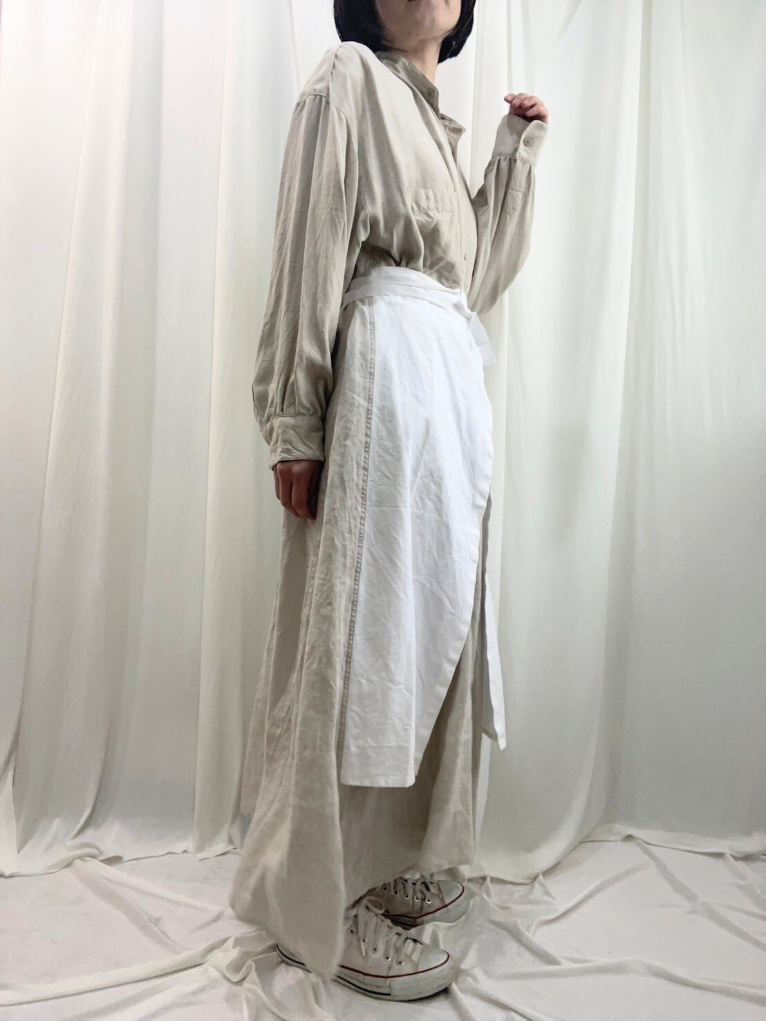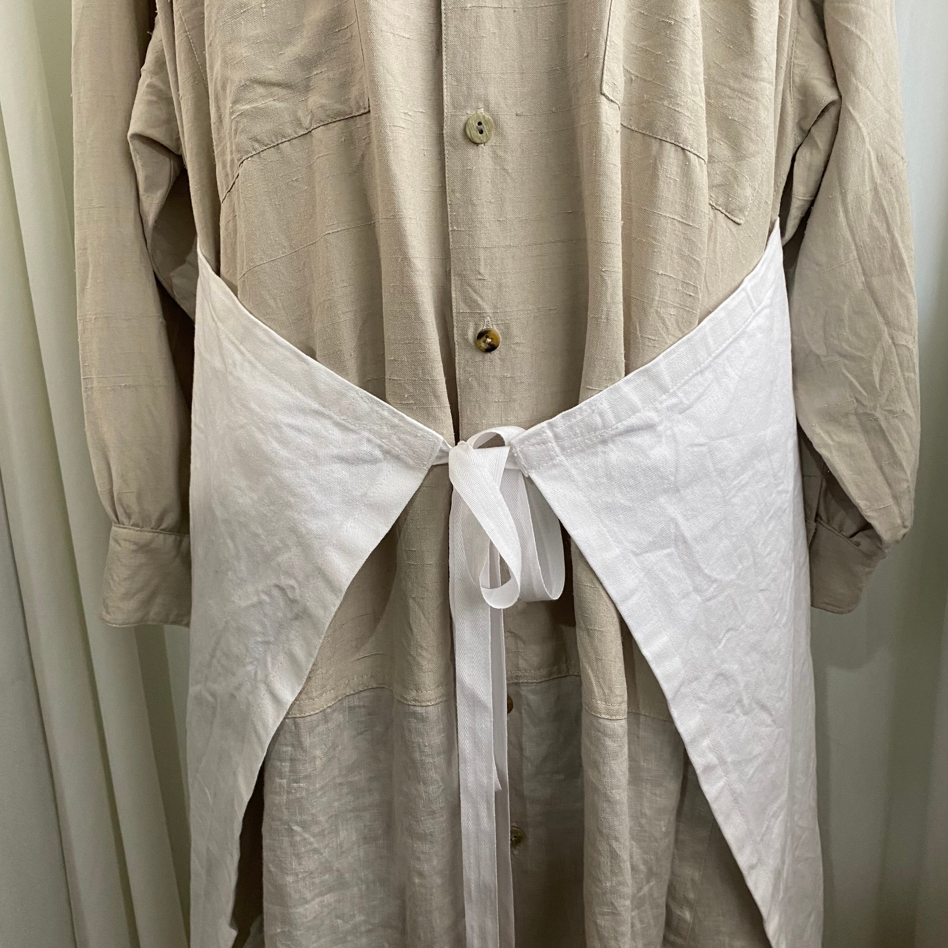 シルクらしいネップ感のあるシャツは、海外メーカーのデッドストックで、シャツ部分は同じ生地ですが、ポケットのデザインが数種類あり、アソートです。コットンのエプロンの張りとサイドのリネン、ナチュラルな風合いのある生地のグラデーションが◎
