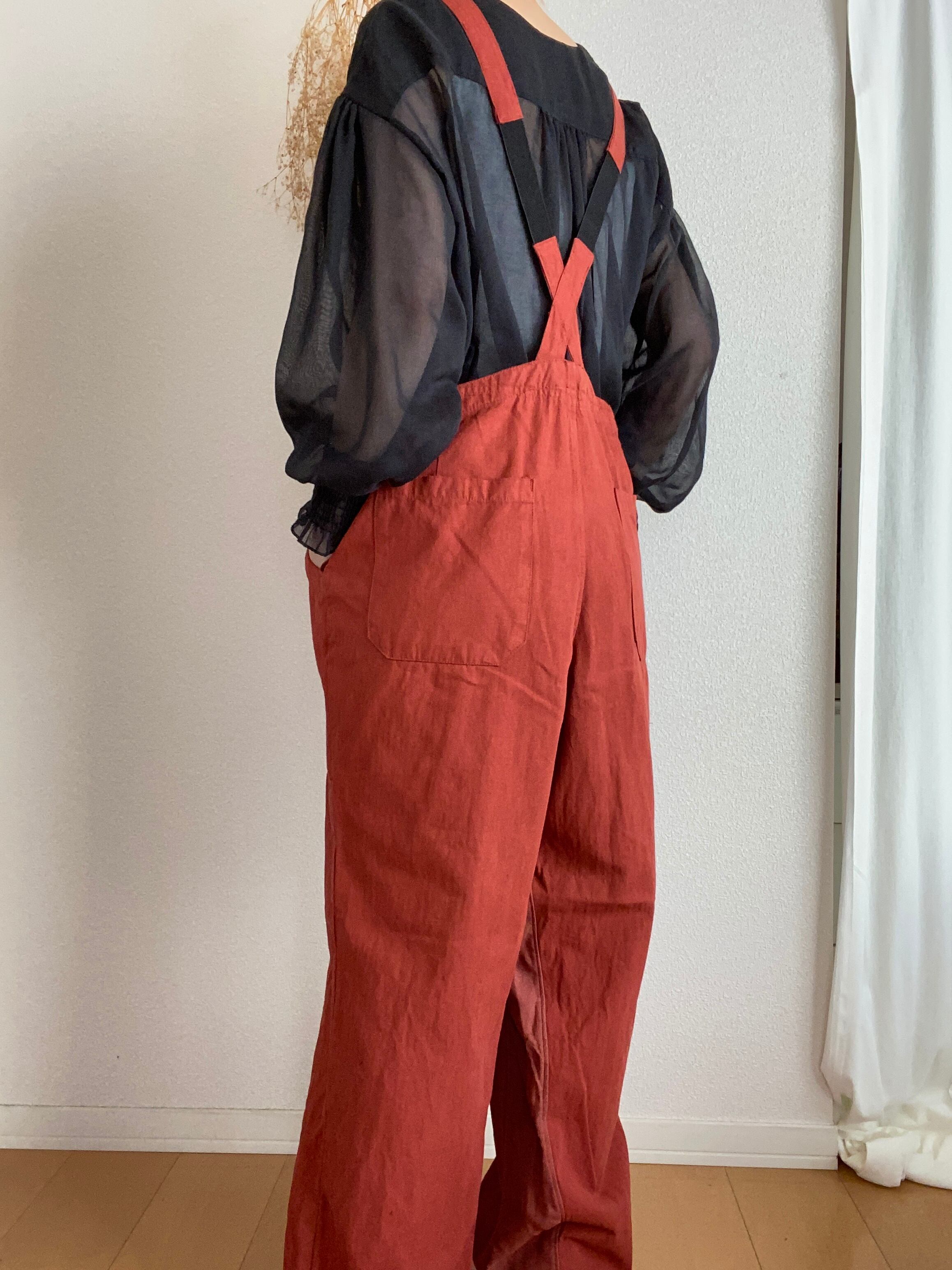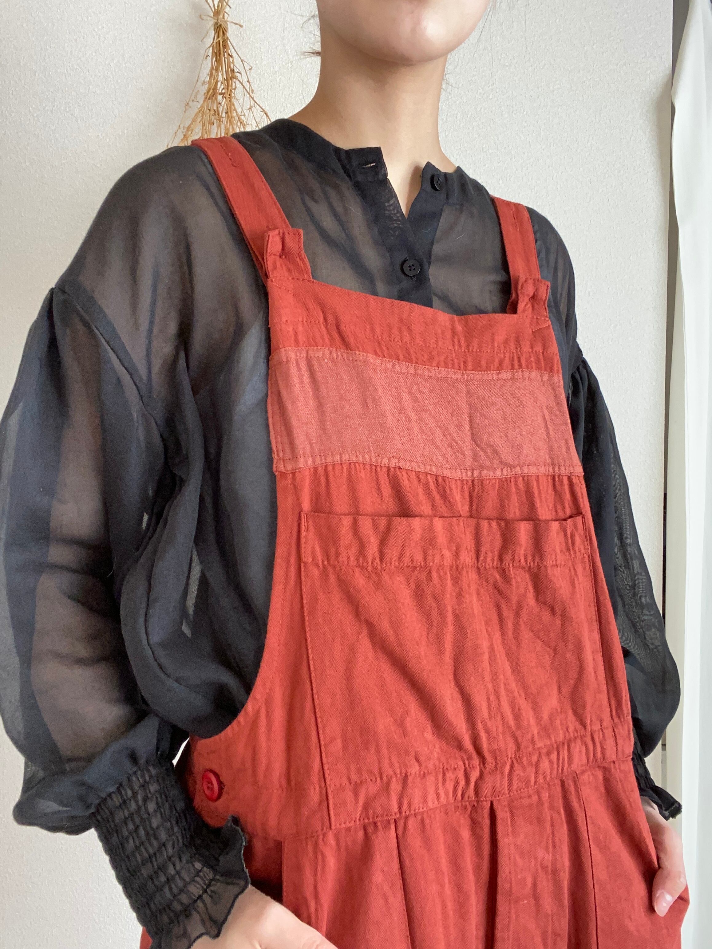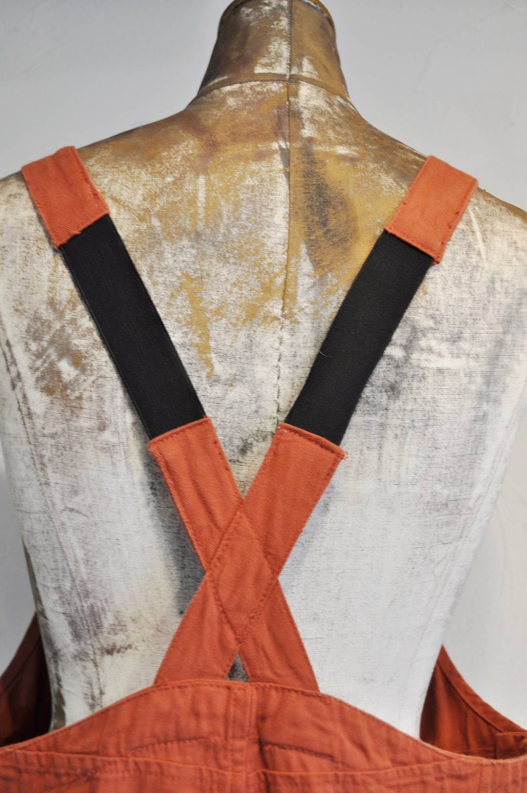 女性にも着やすいように胸当て部分や、股に柔らかいビエラ生地を当てて、着やすさとシルエットを改良しています。カラー展開のRENGA BLKはアトリエでの手染です。