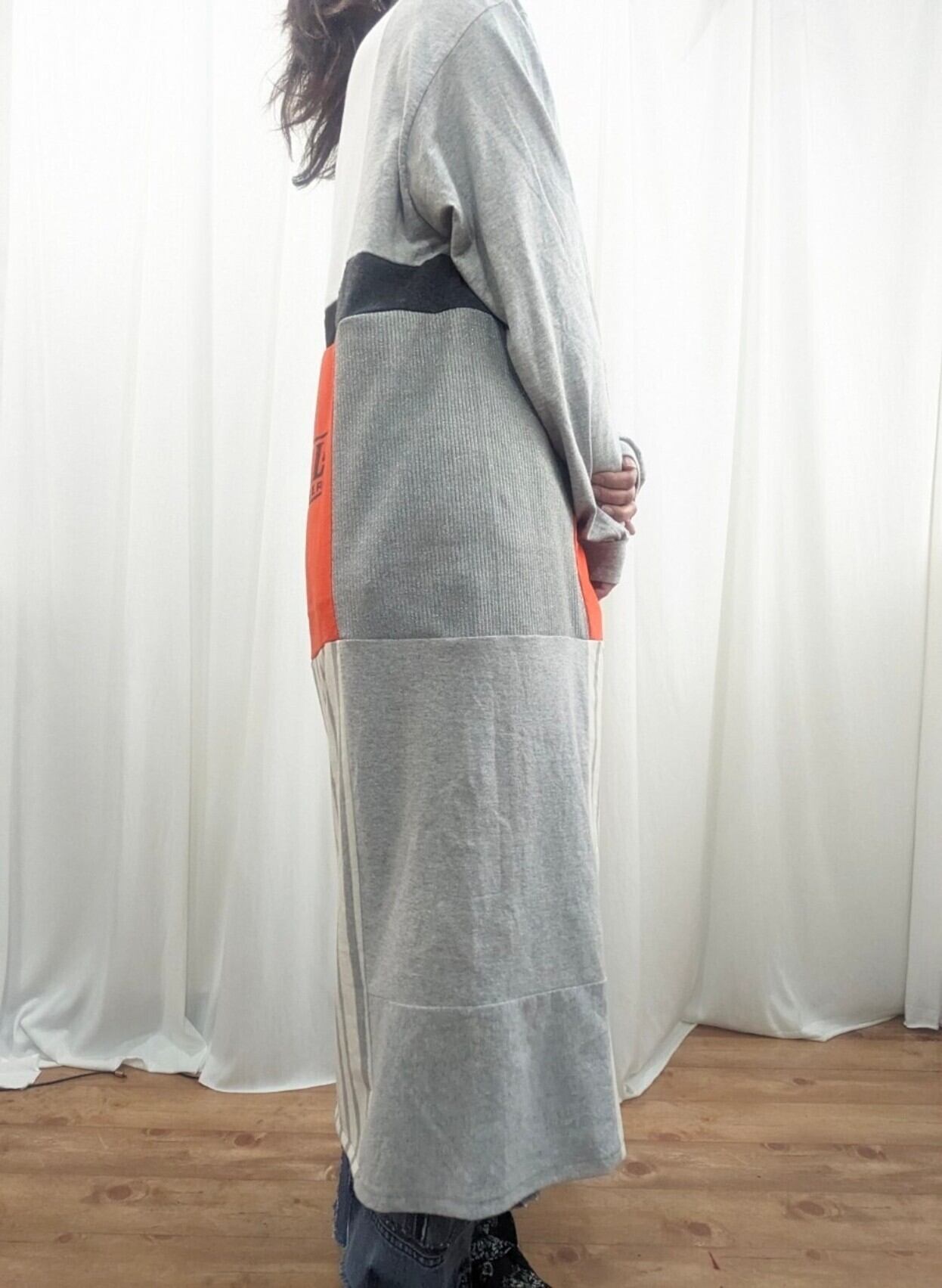 古着のロゴティシャツをメインに色々な生地を使用し、ブロック状のパッチワークで組み合わせたワンピースです。胸パーツ以外は古着のティシャツを使用していますが、胸パーツの部分には古着は使用していません。