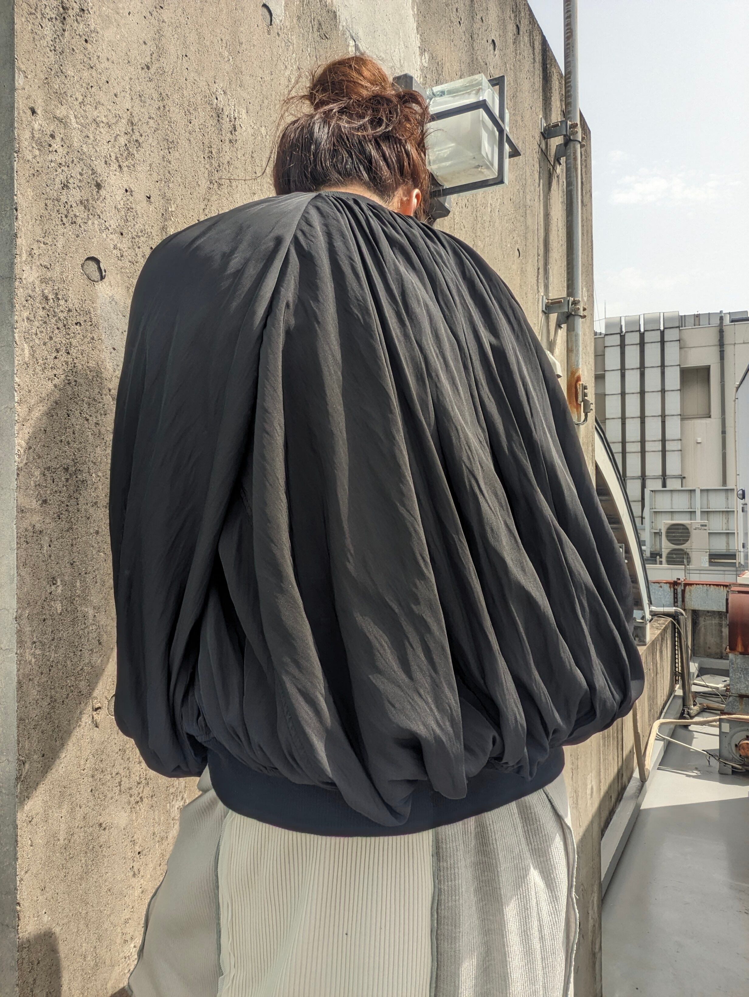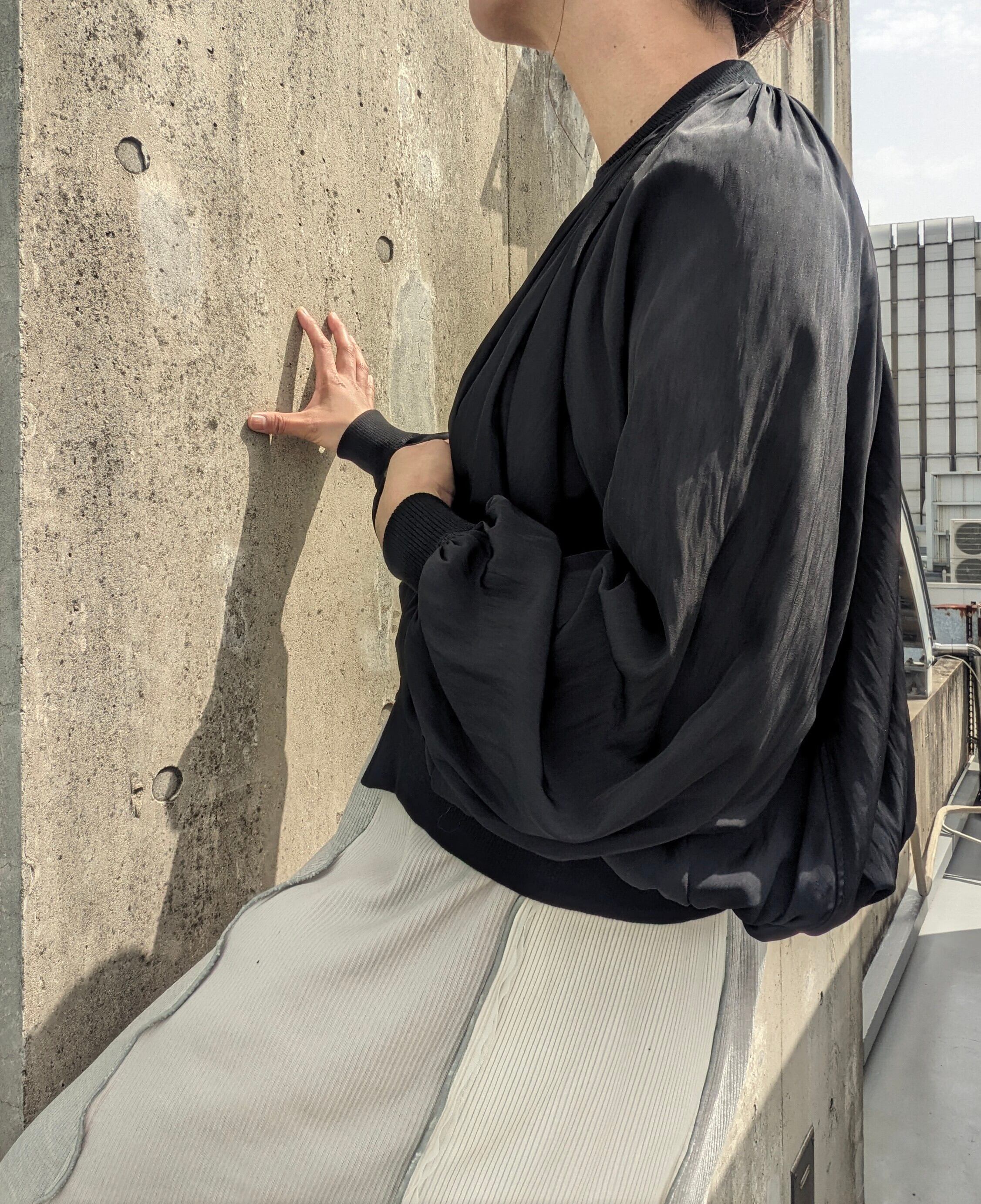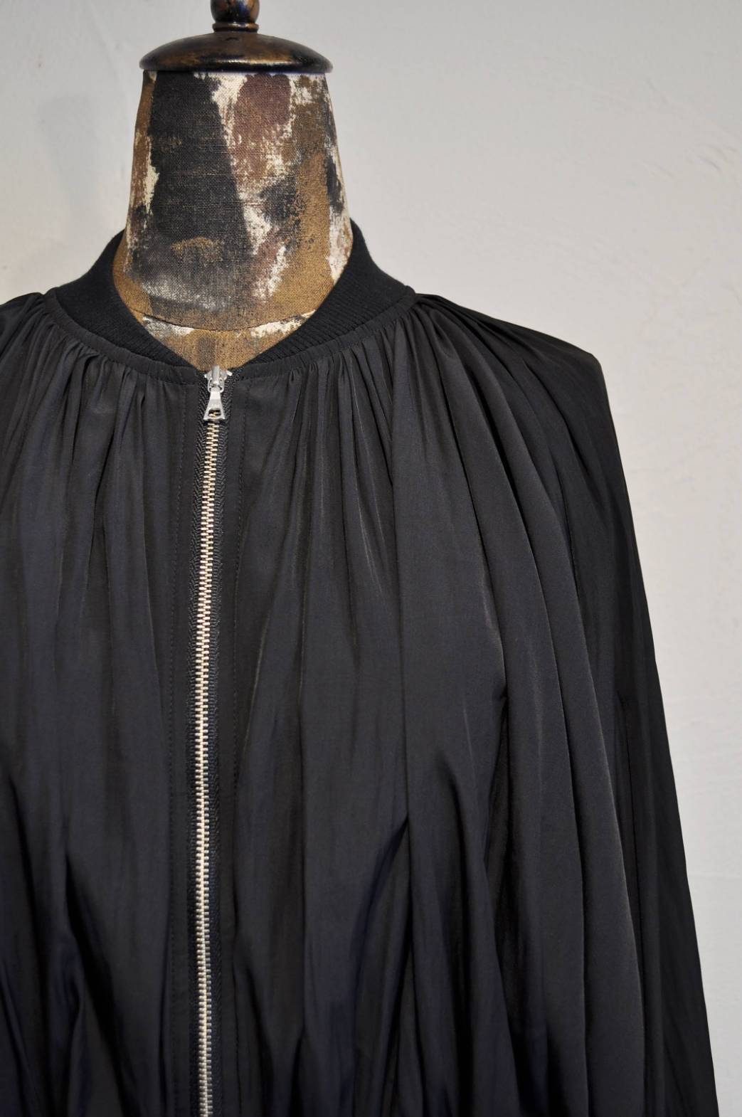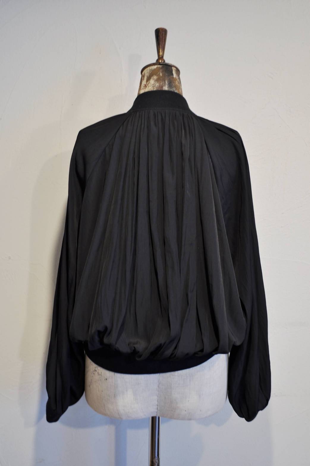 首ぐりと裾、袖口にたっぷりのギャザーが入っている為女性らしいシルエットで、動くたびにエレガントに揺れてくれます。