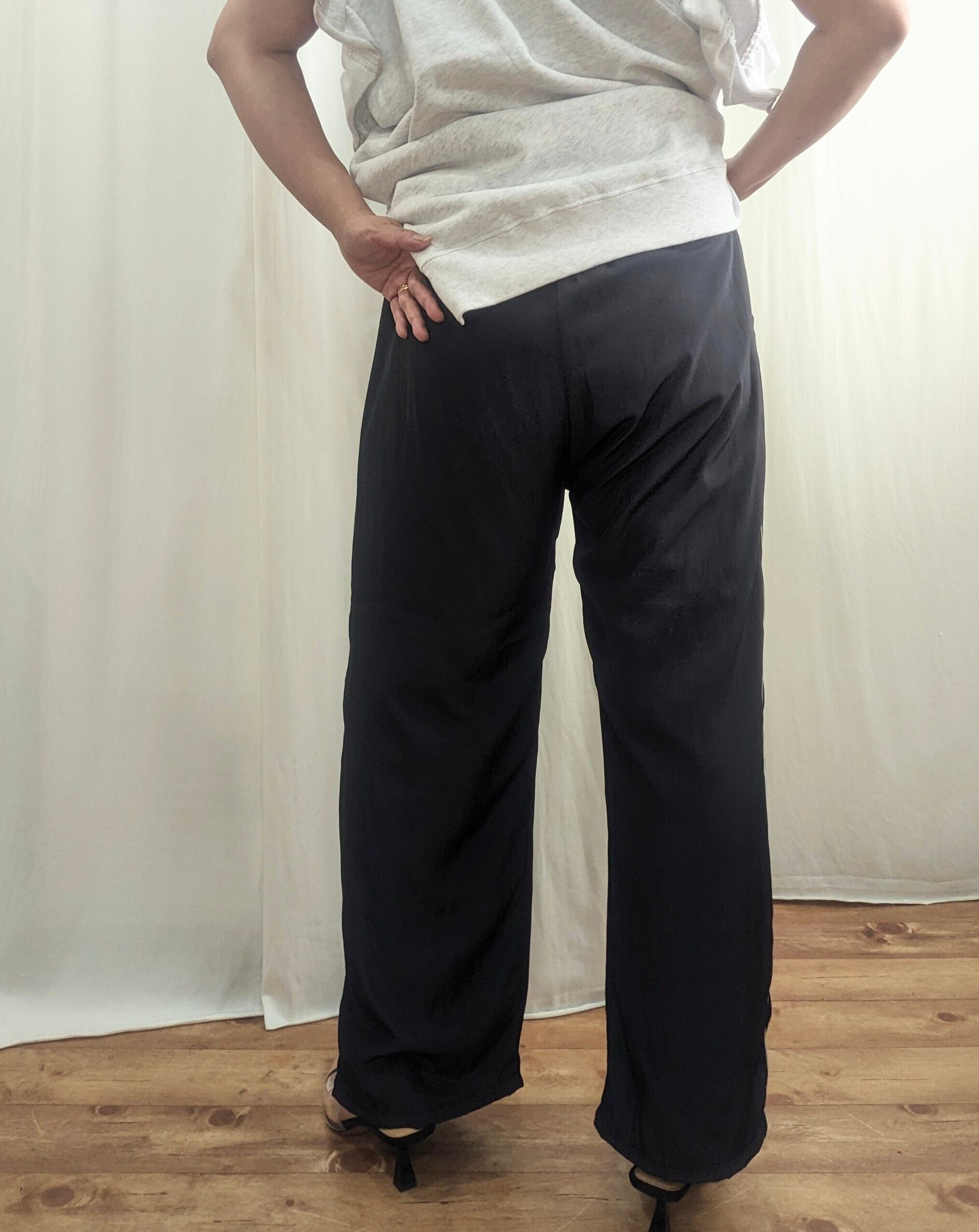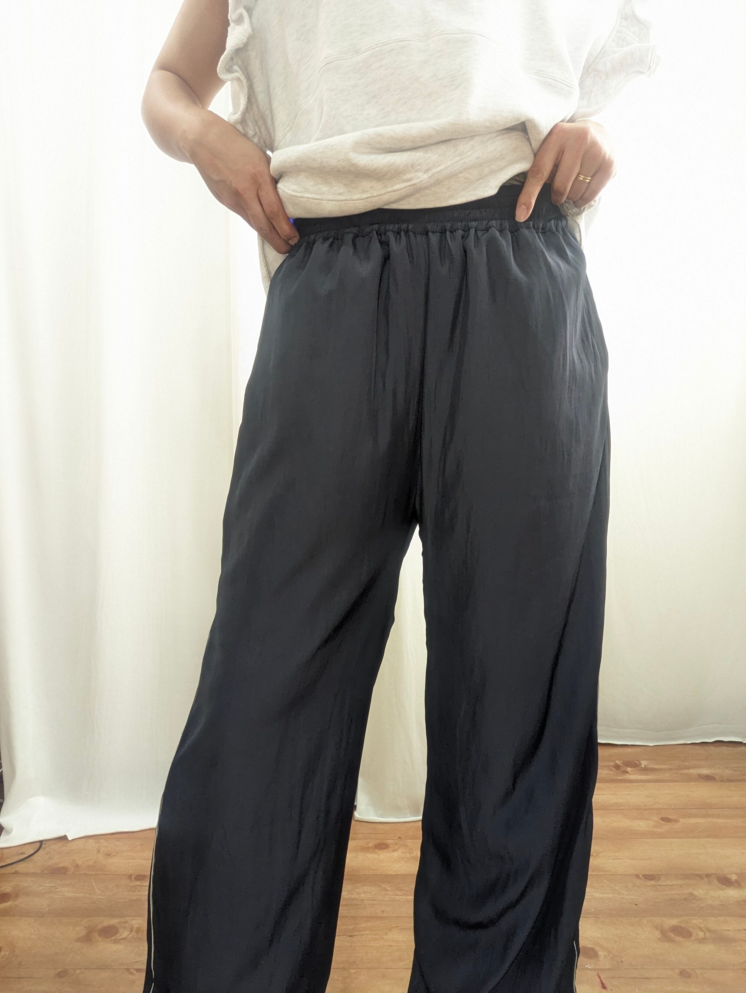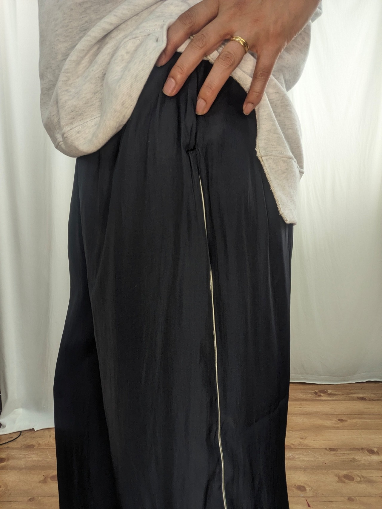 ツルツルさらさらな素材のビジュー生地のパンツです。サイドにラインが入っておりワンポイント有り。