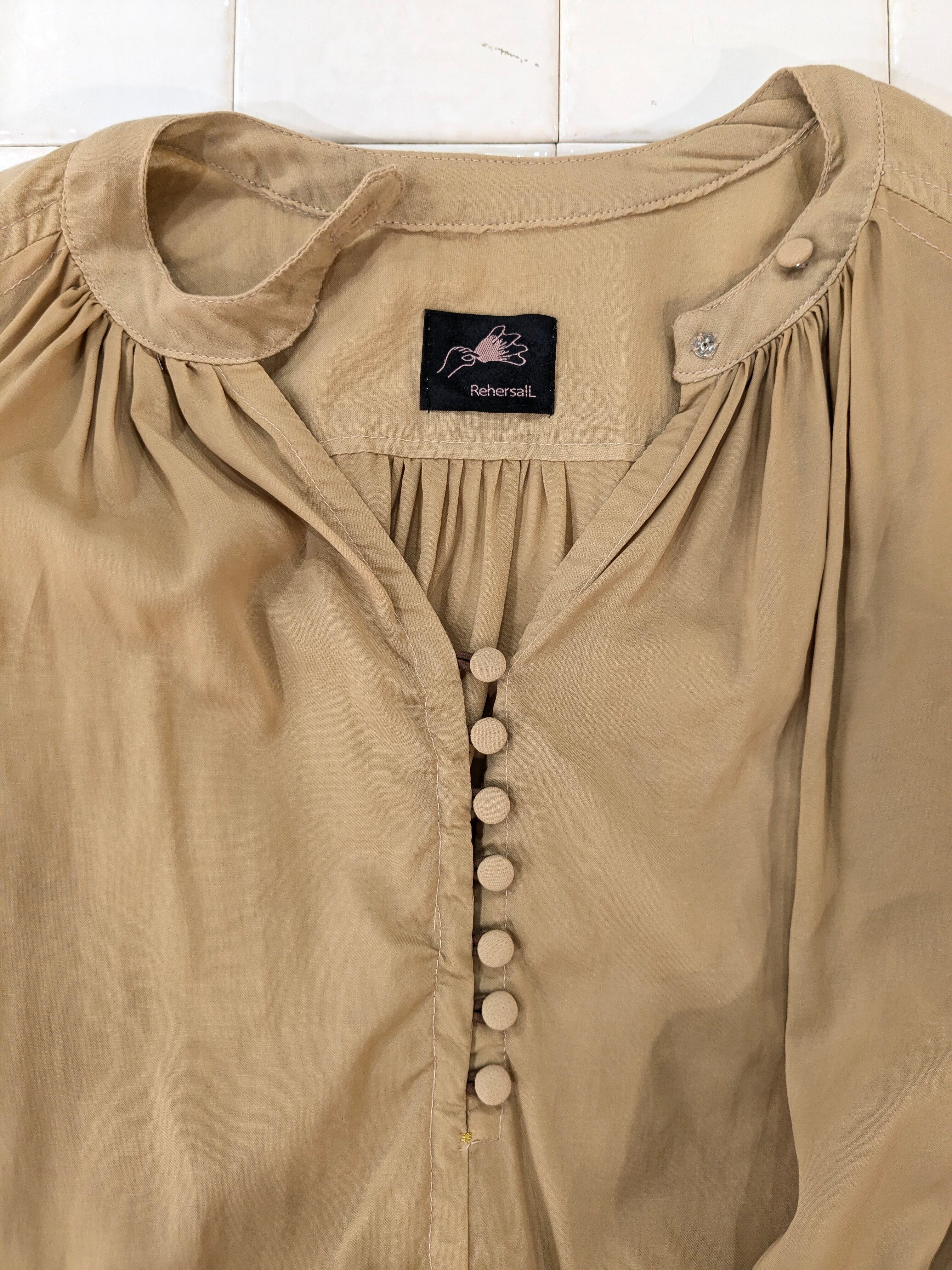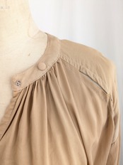 リハーズオールでは定番のくるみボタンやギャザー仕様のヴィンテージデザインを取り入れています。肩にスリットが施されており、金糸でポイントがあり、密かなキラット感が大人女性を演出してくれます。