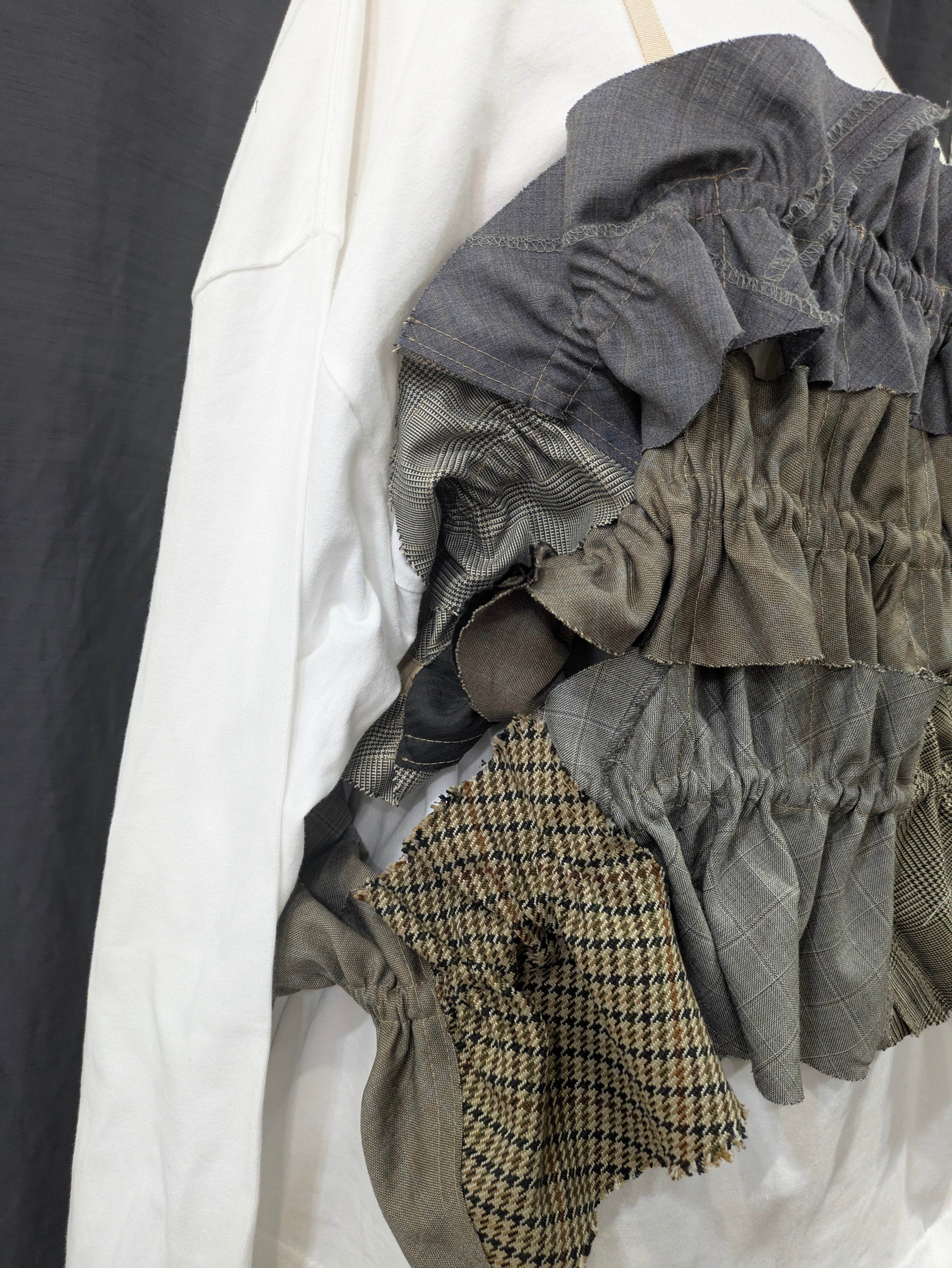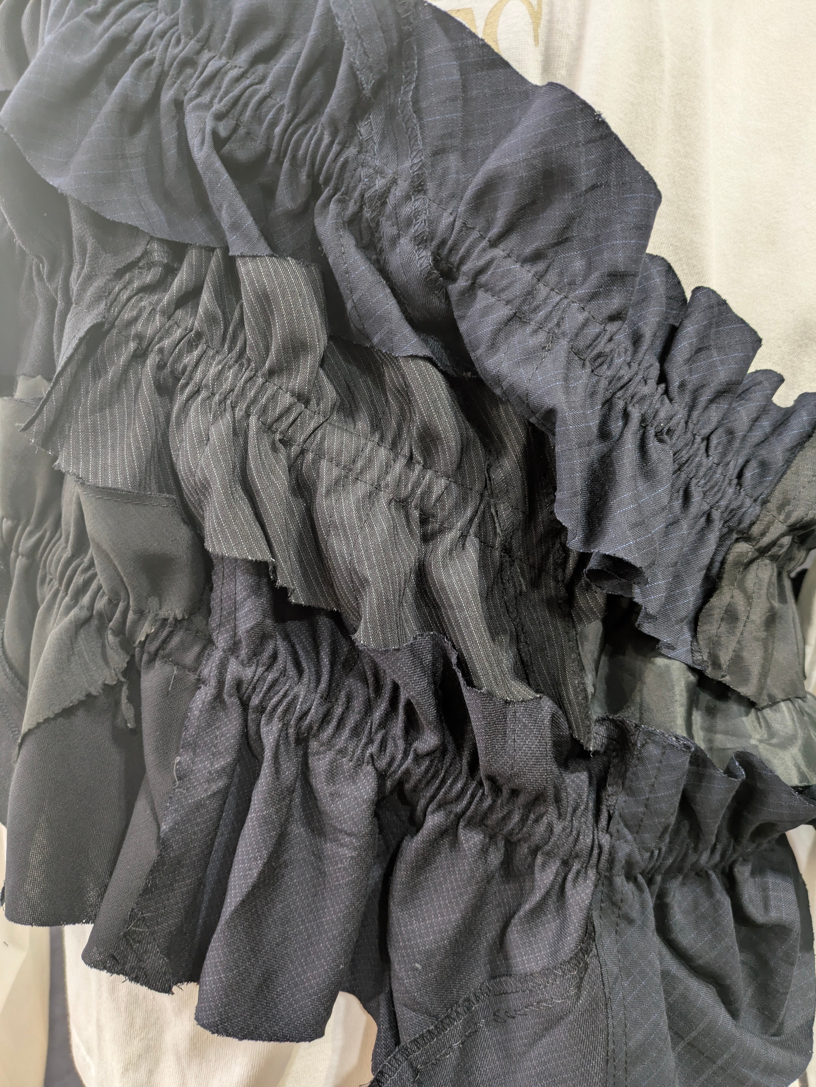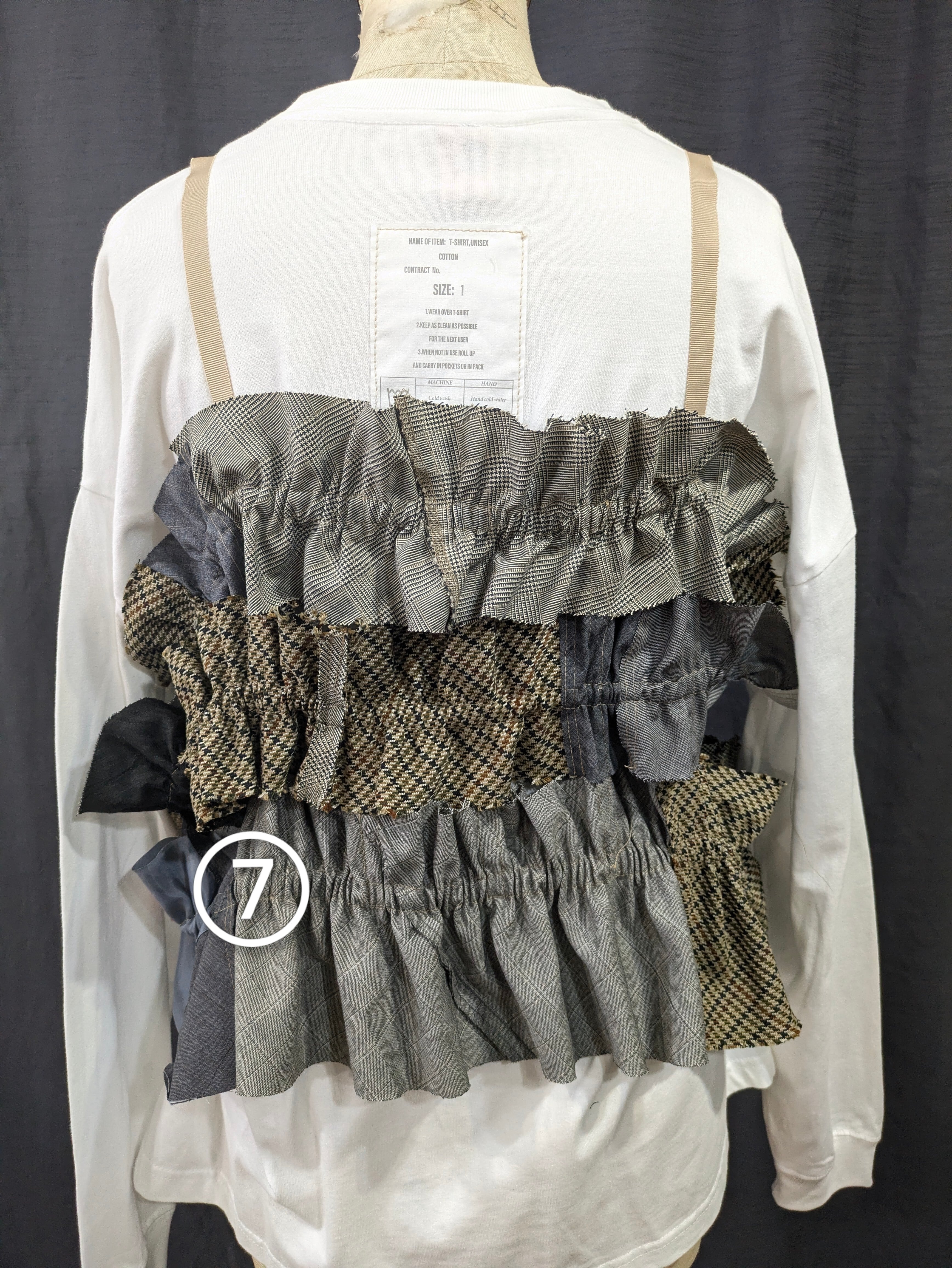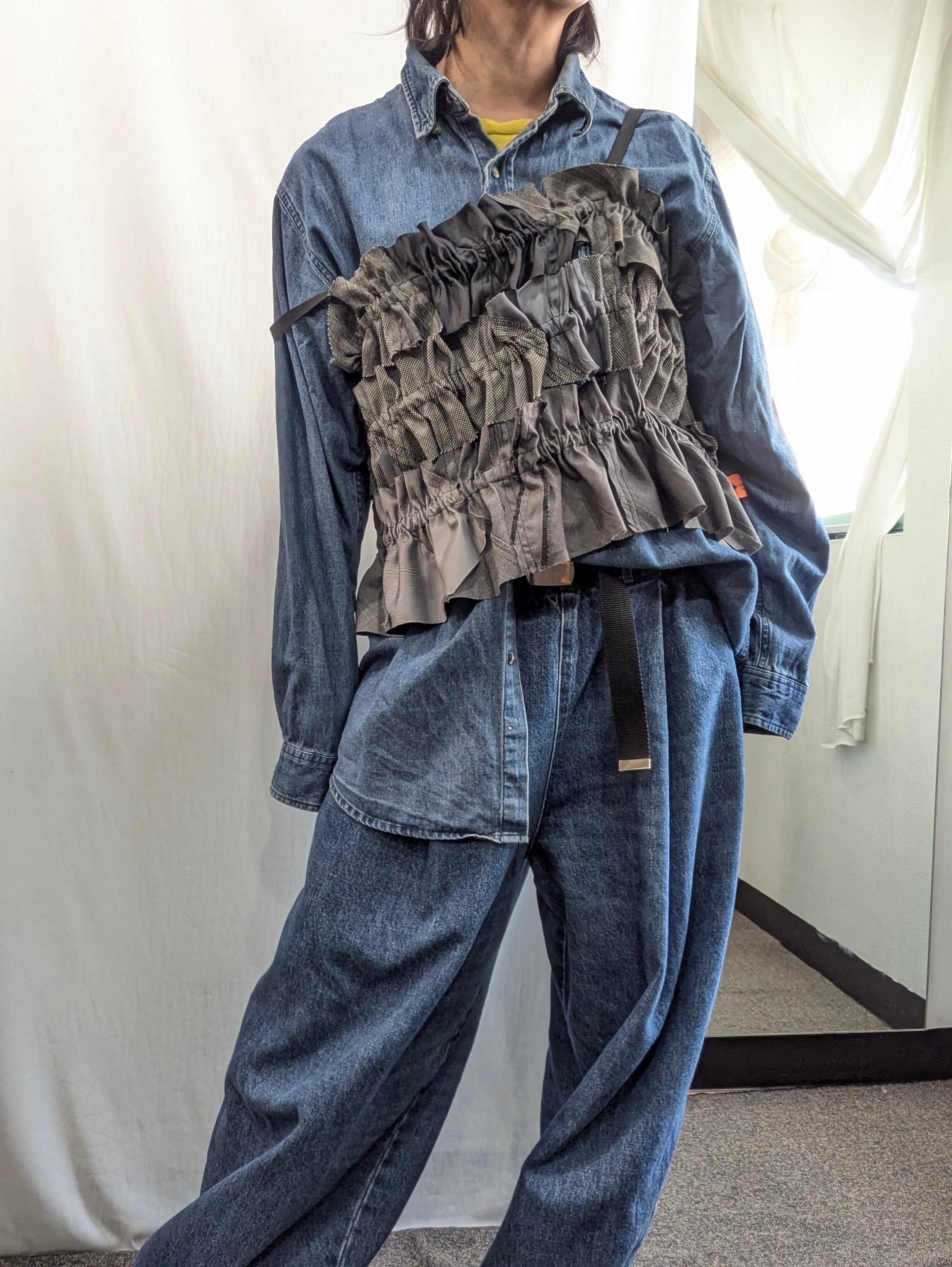 »デザインースーツパンツの生地を繋ぎ合わせて組み立てられたギャザーキャミソールです。