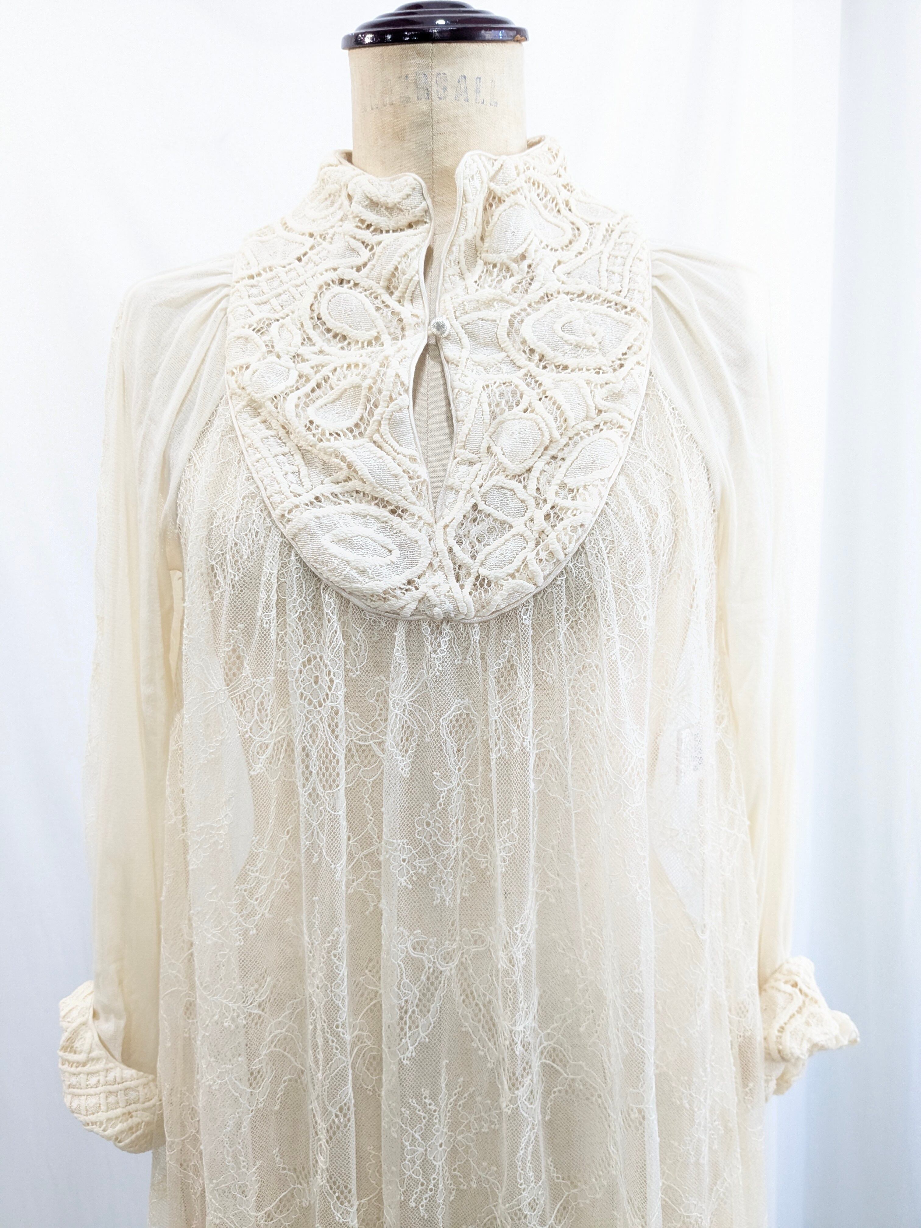 首元から胸にかけての襟はしっかりスタンドしてくれ、肩からの柔らかいレースでの落ち感がとてもエレガントなシルエットです。