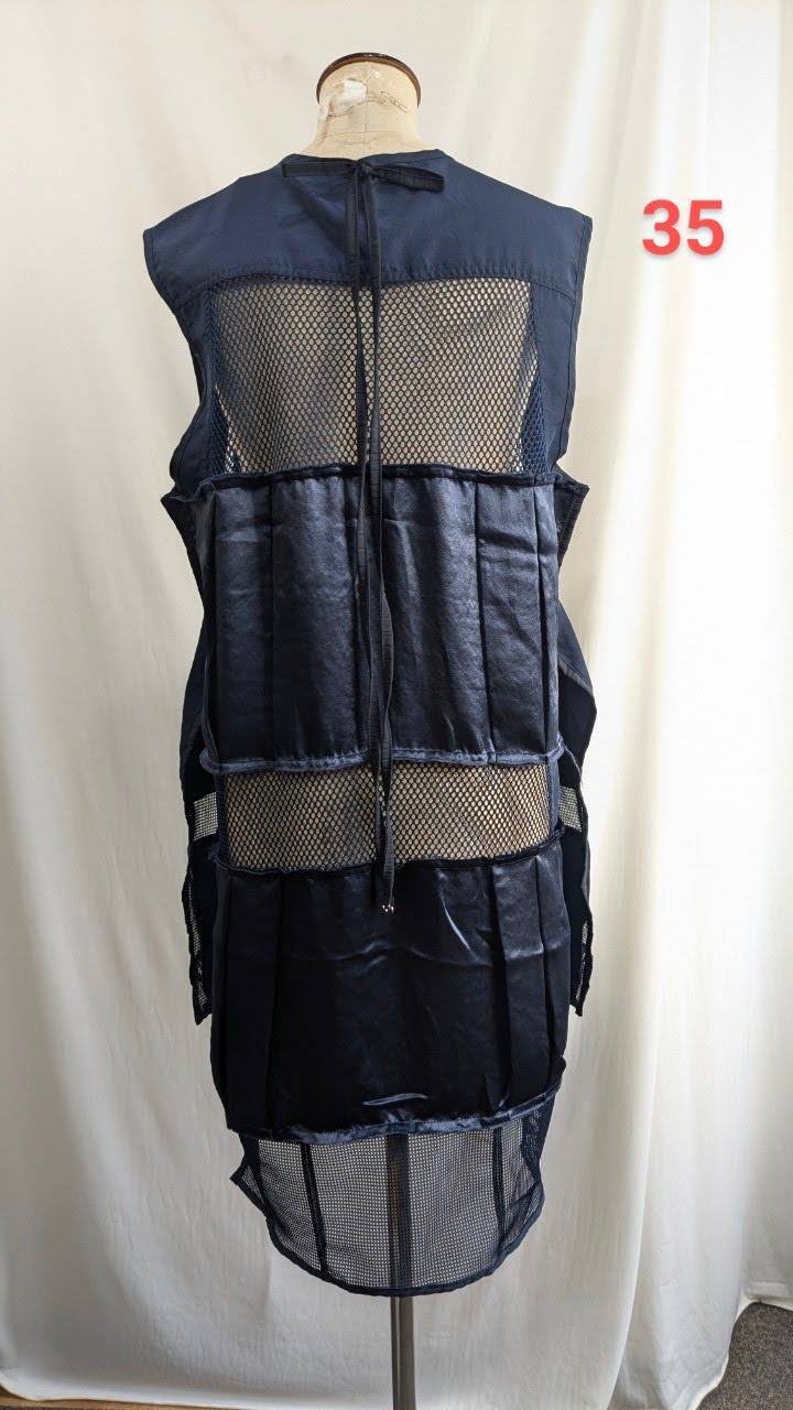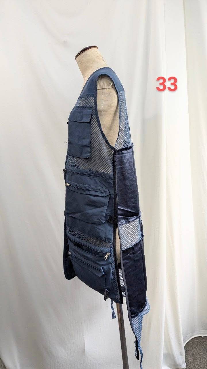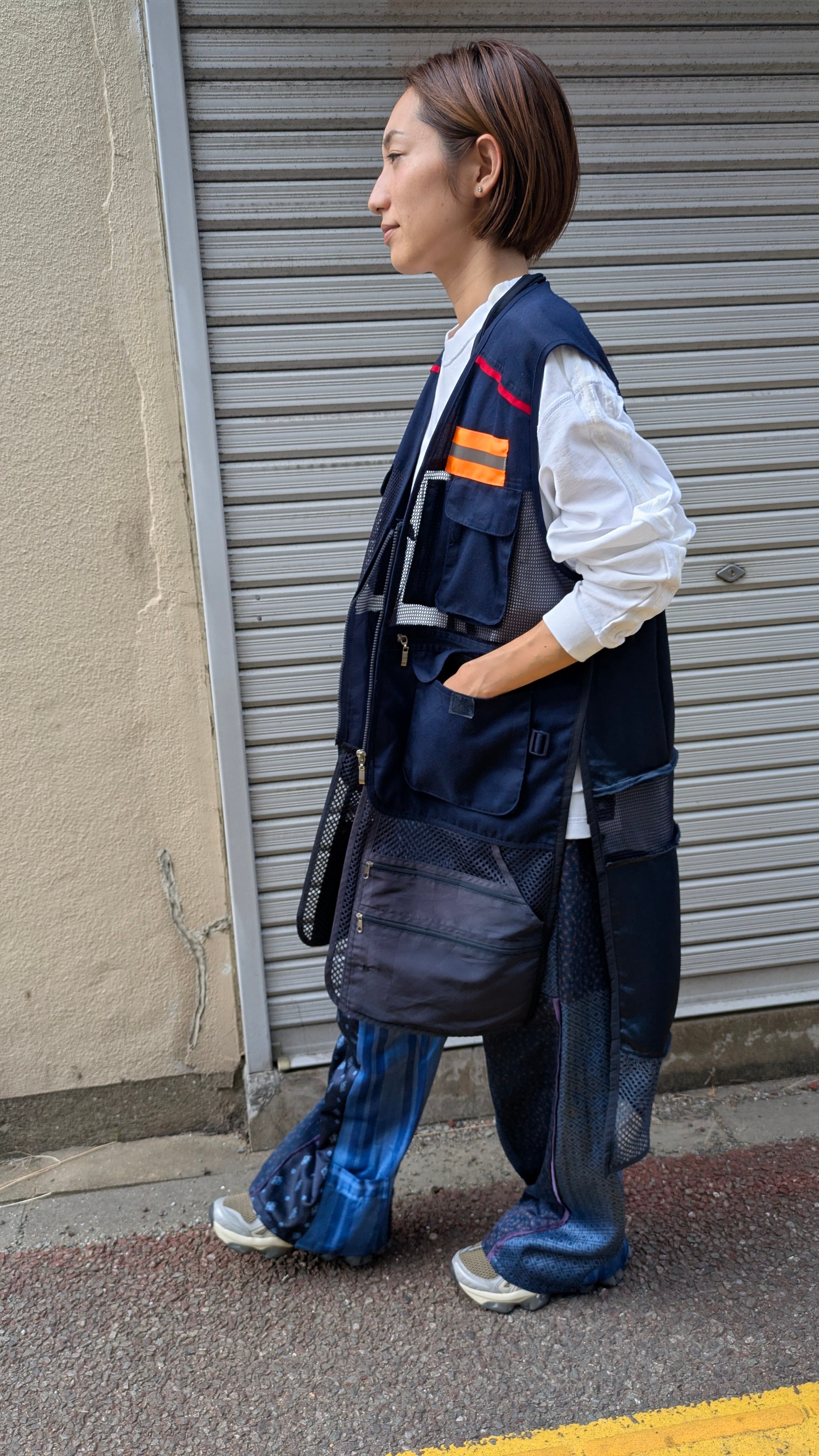 »デザインー古着のメッシュベストを2着使用し、縦に繋ぎ合わせたロングベスト。