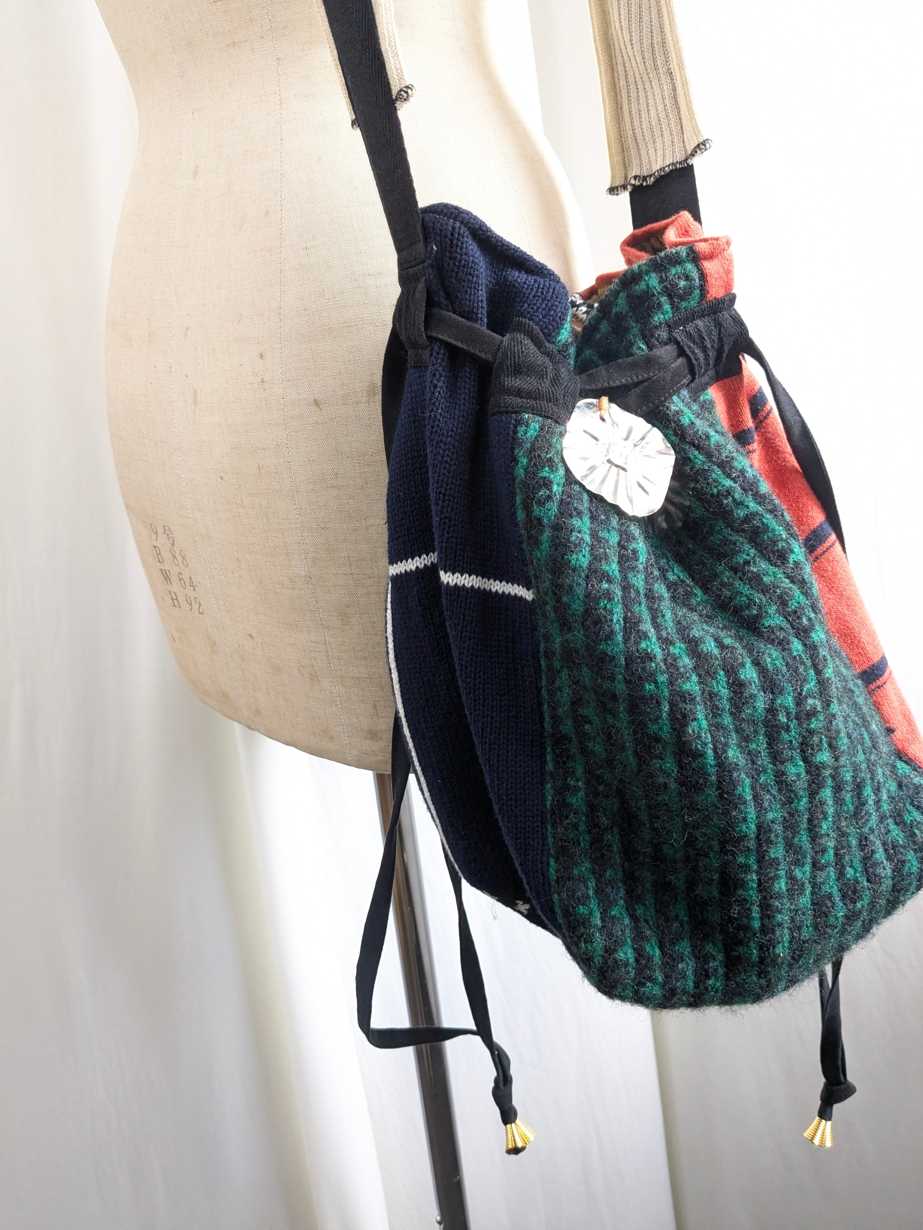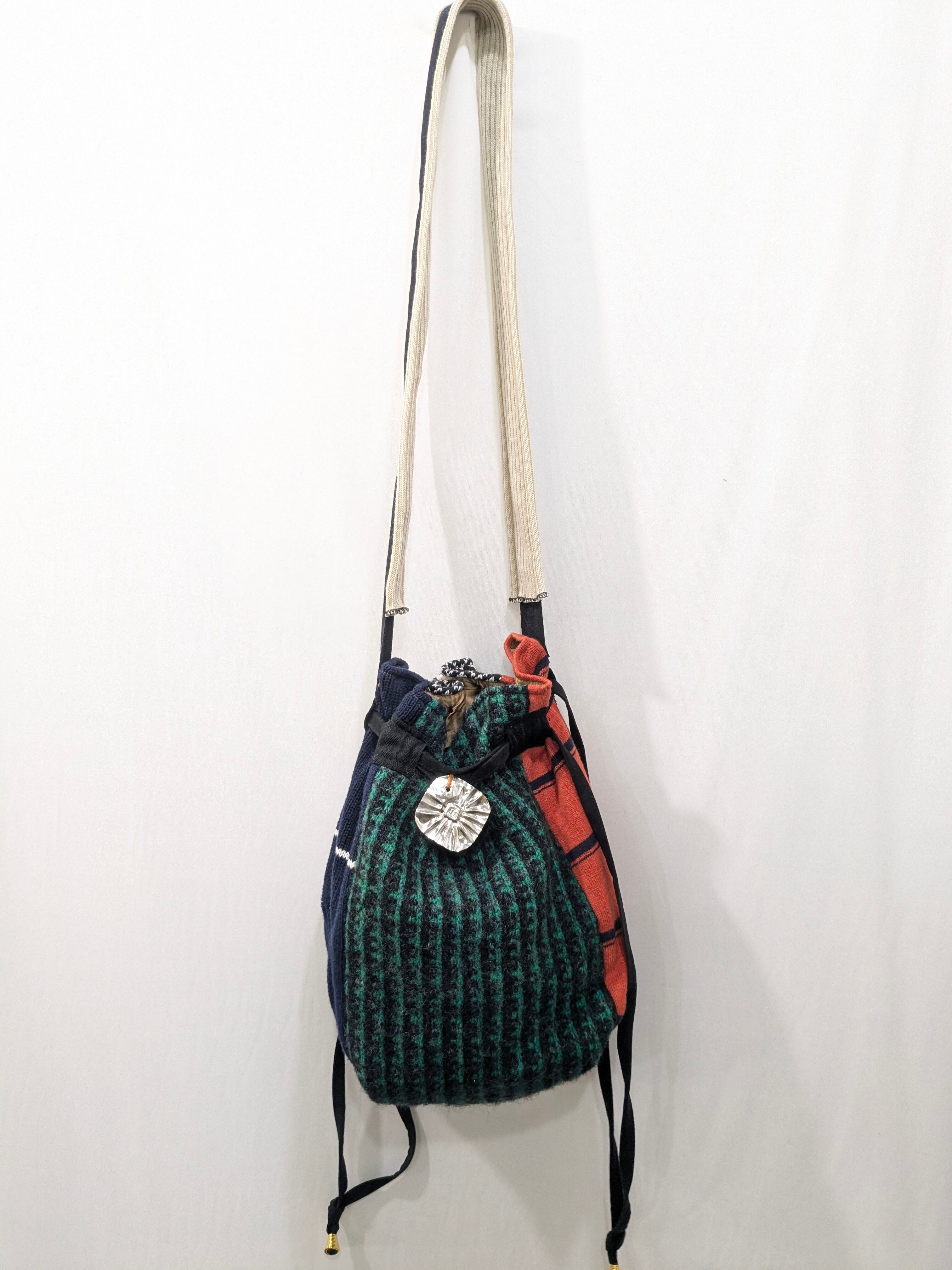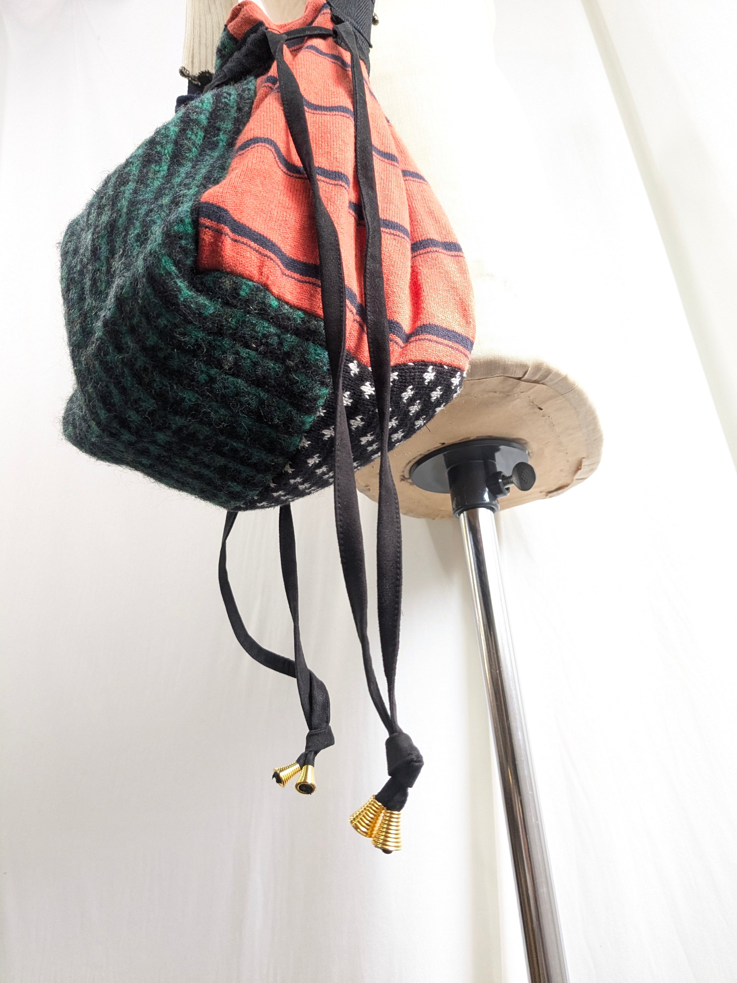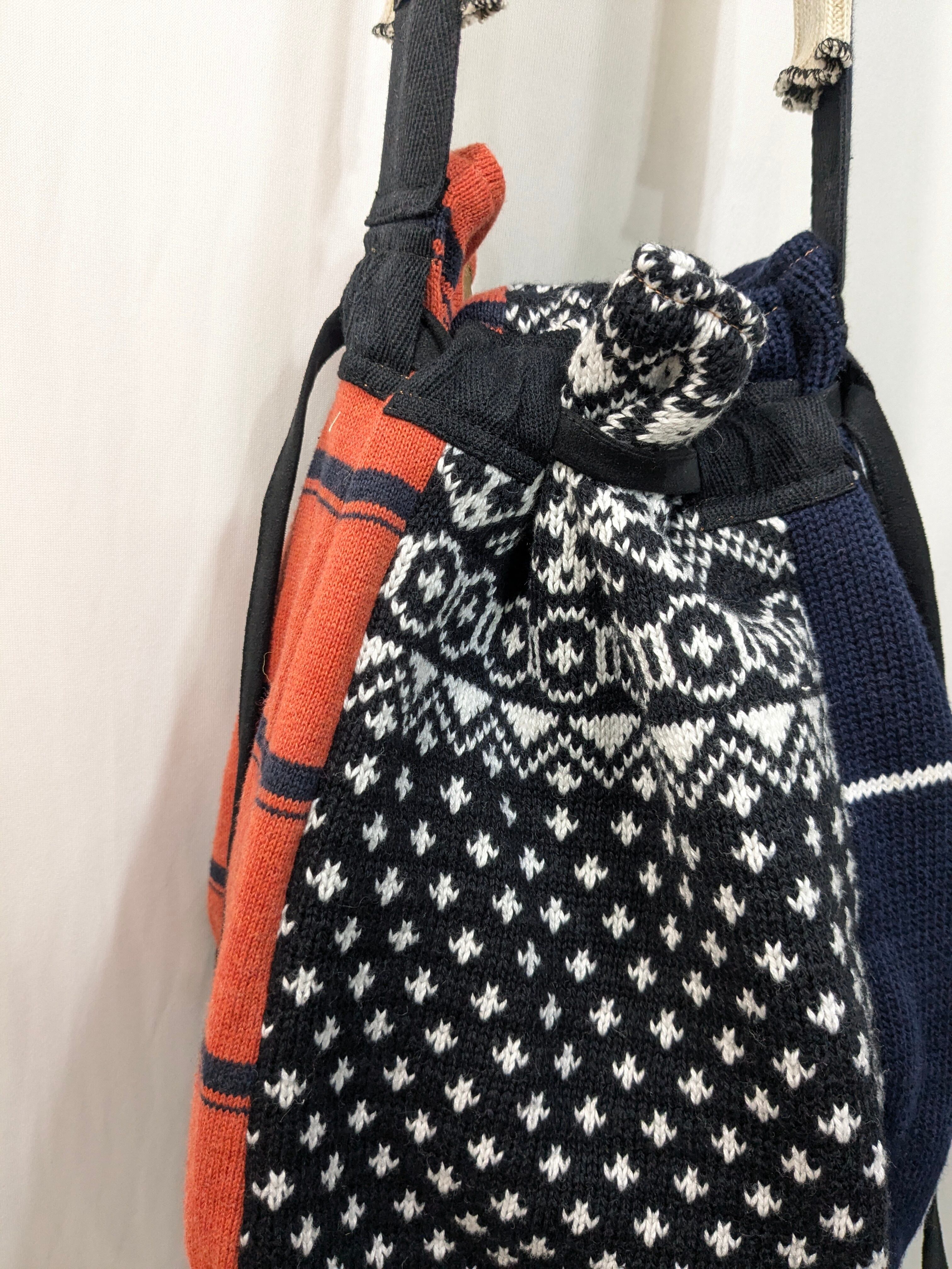 »デザインー古着のニットを使用し再構築した四柱型巾着バックです。