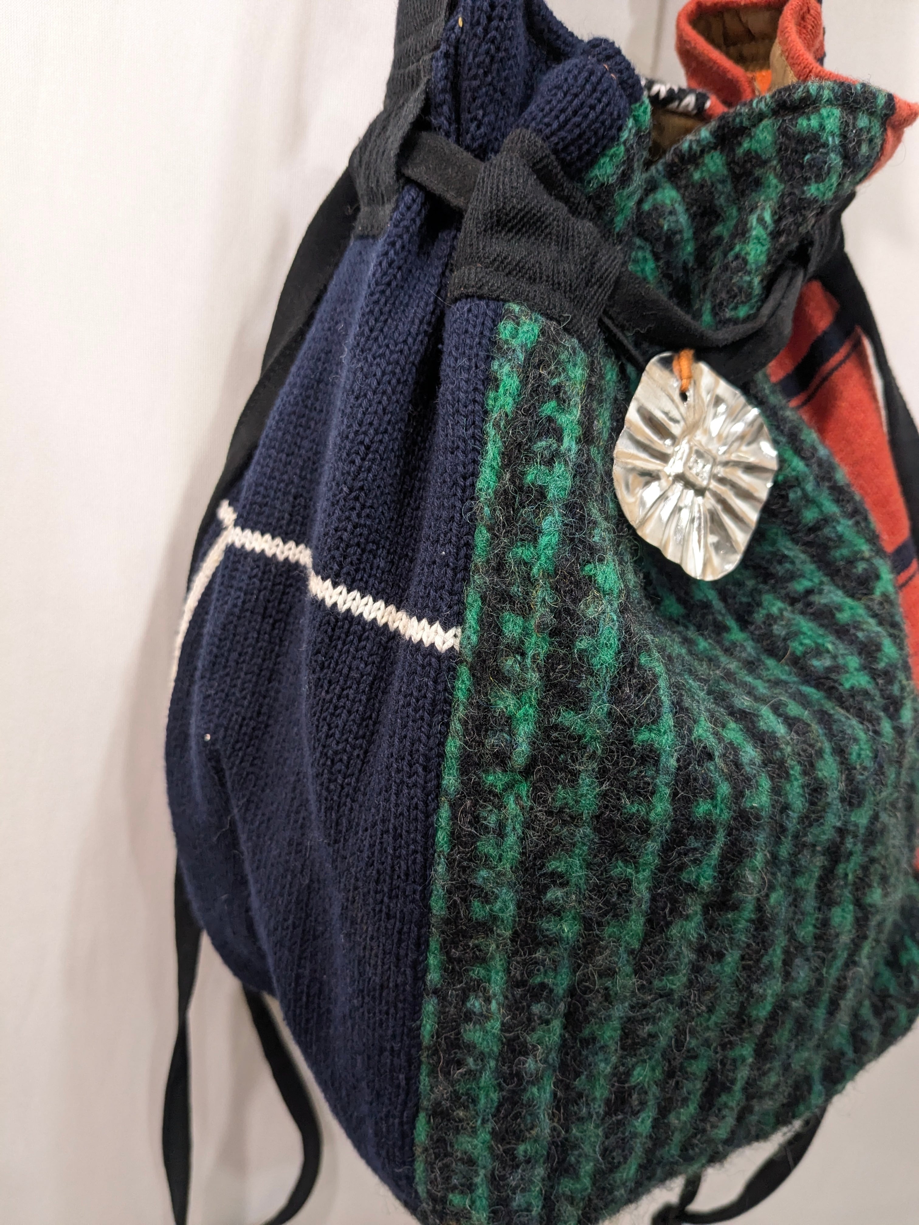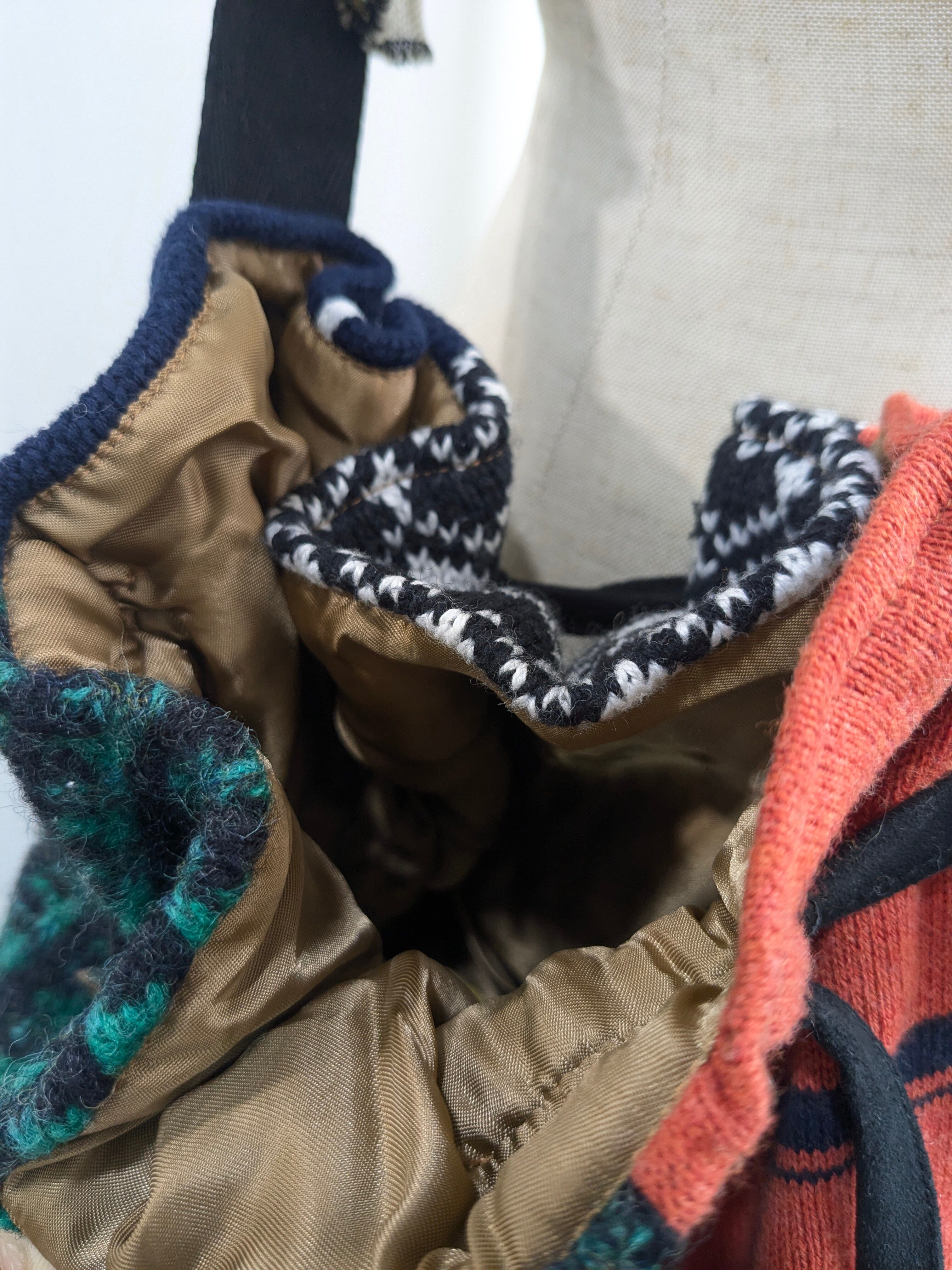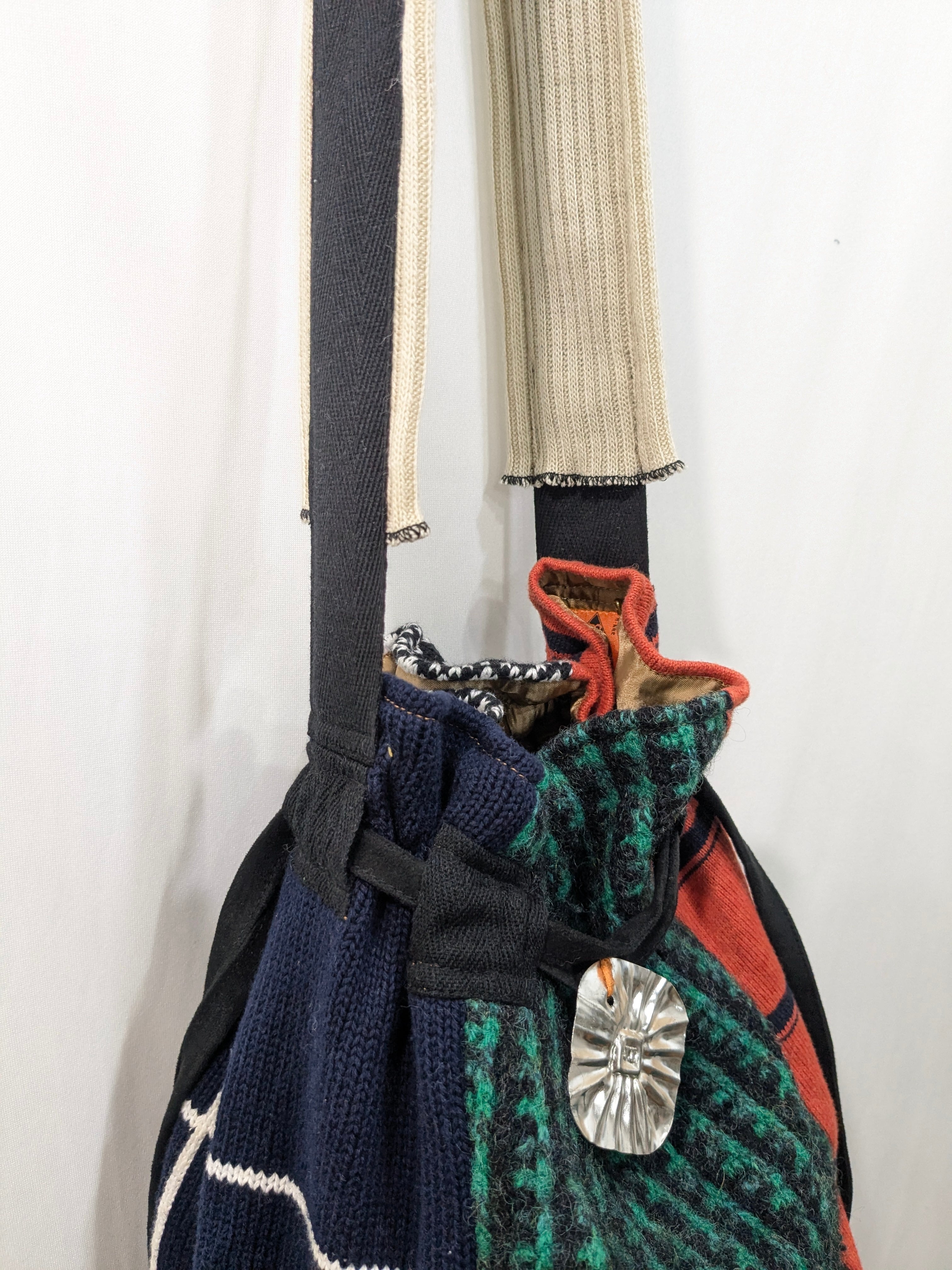»デザインー古着のニットを使用し再構築した四柱型巾着バックです。