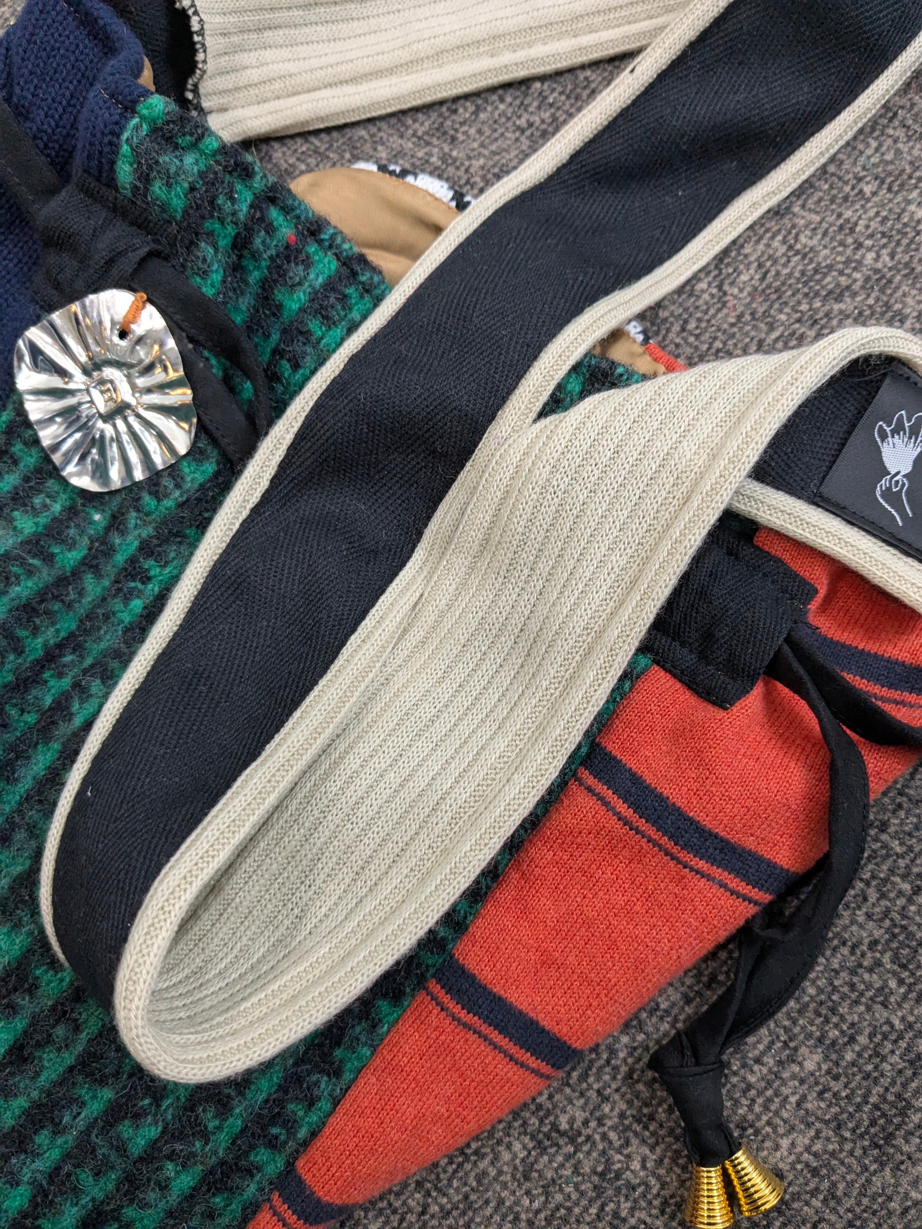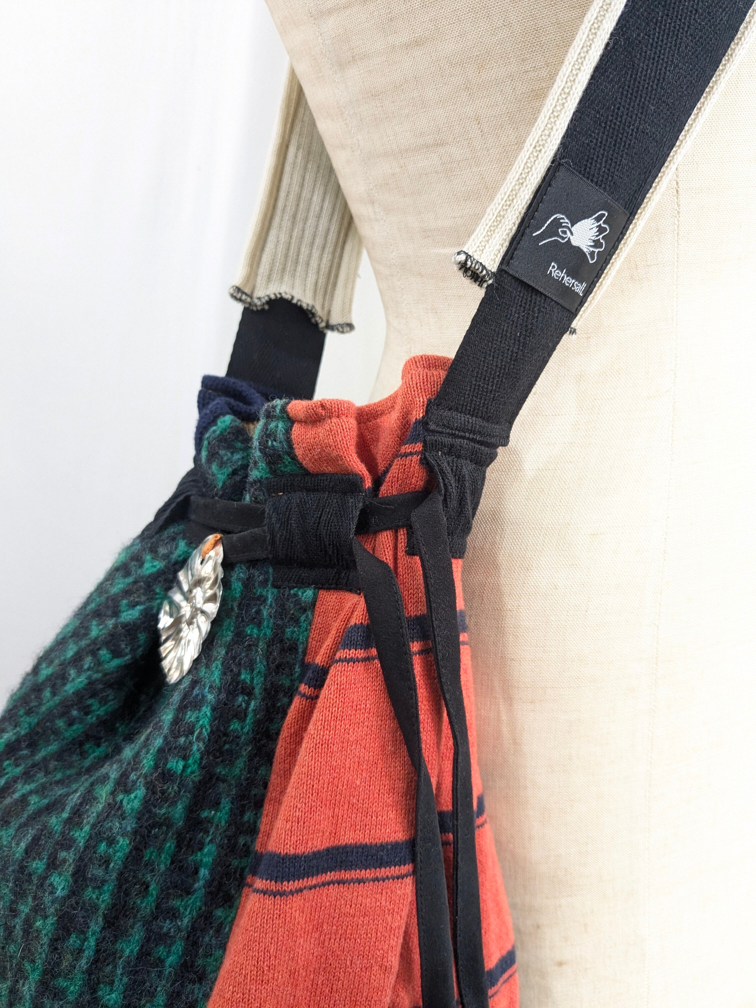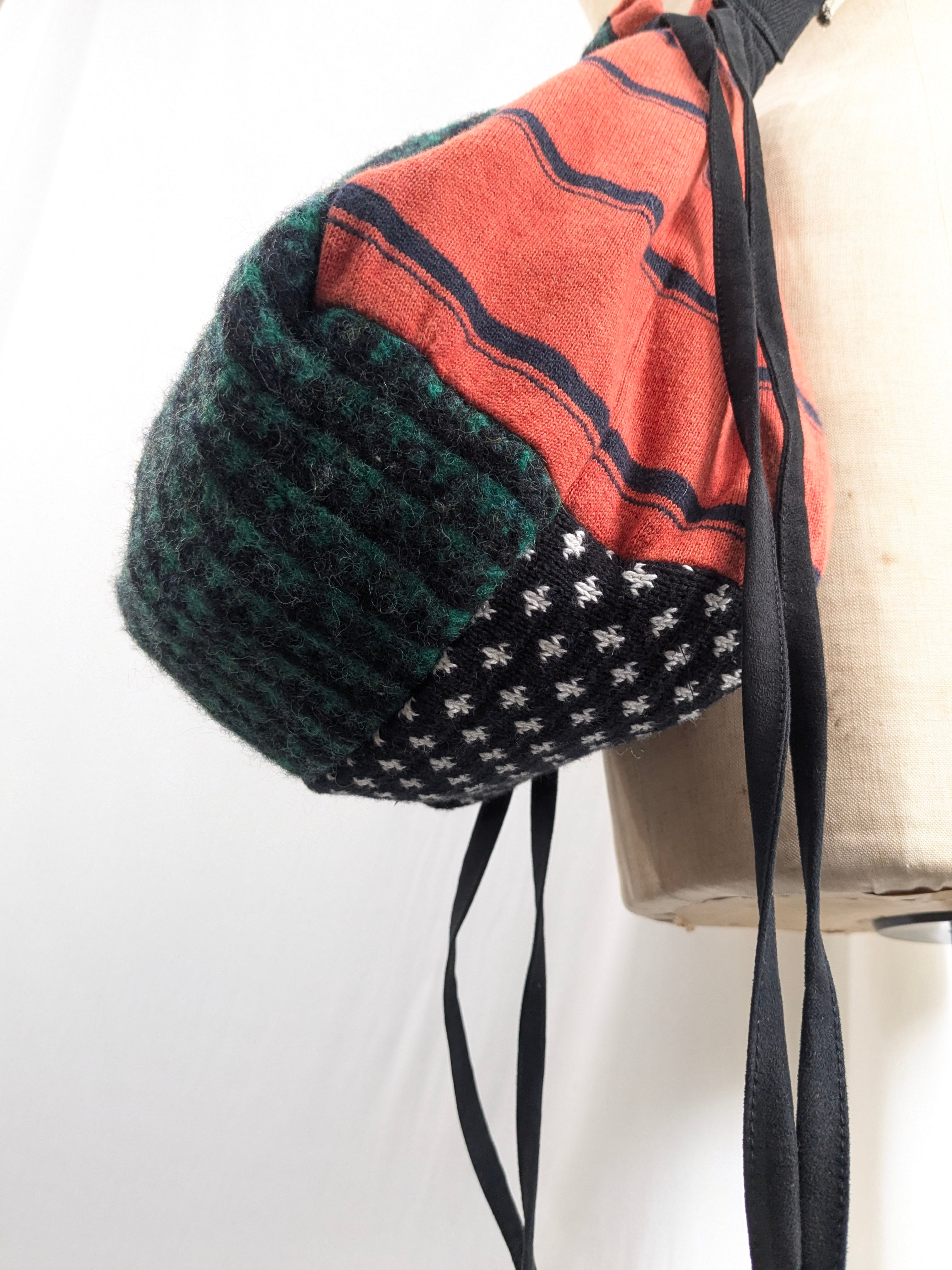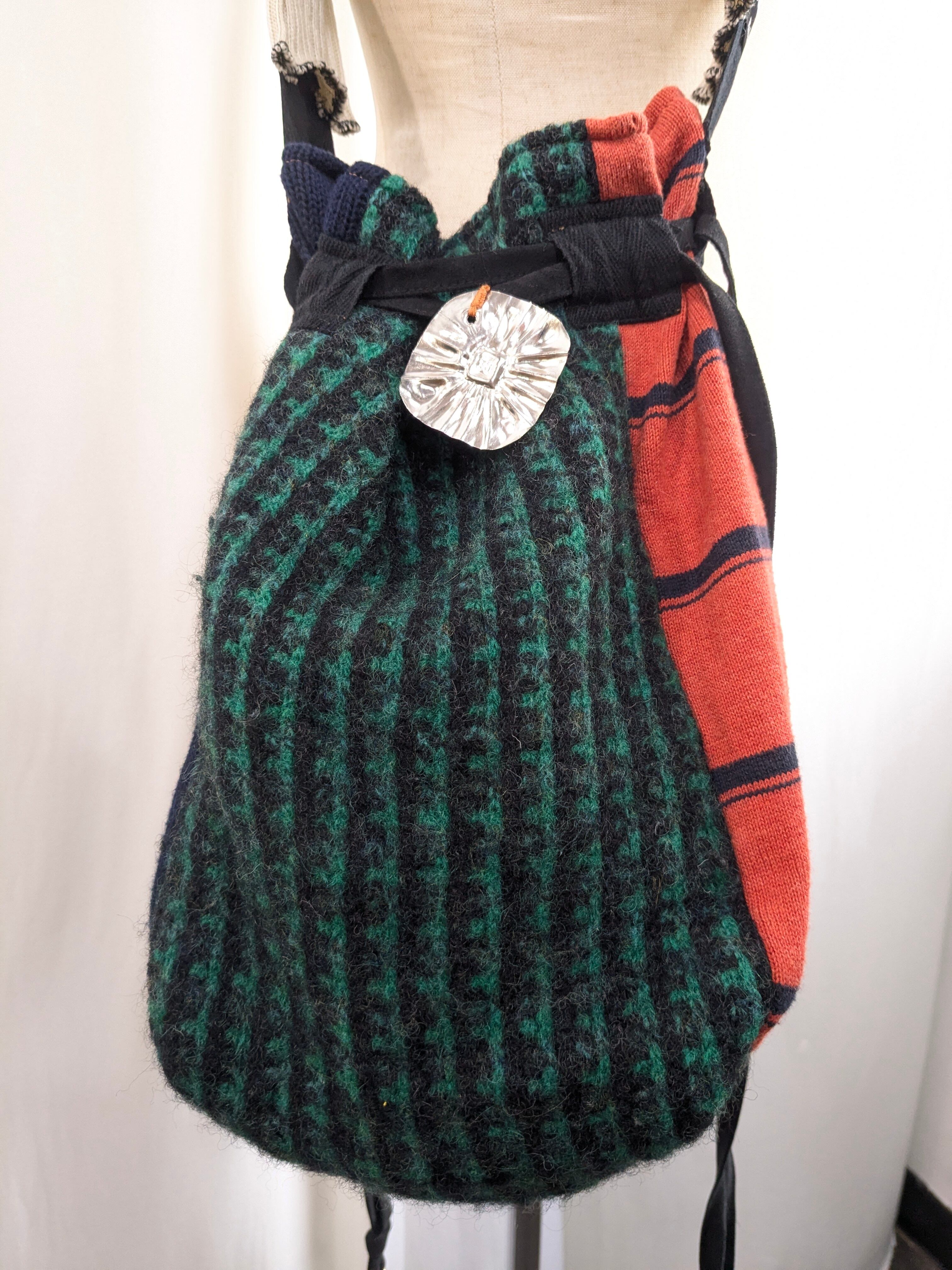 »デザインー古着のニットを使用し再構築した四柱型巾着バックです。