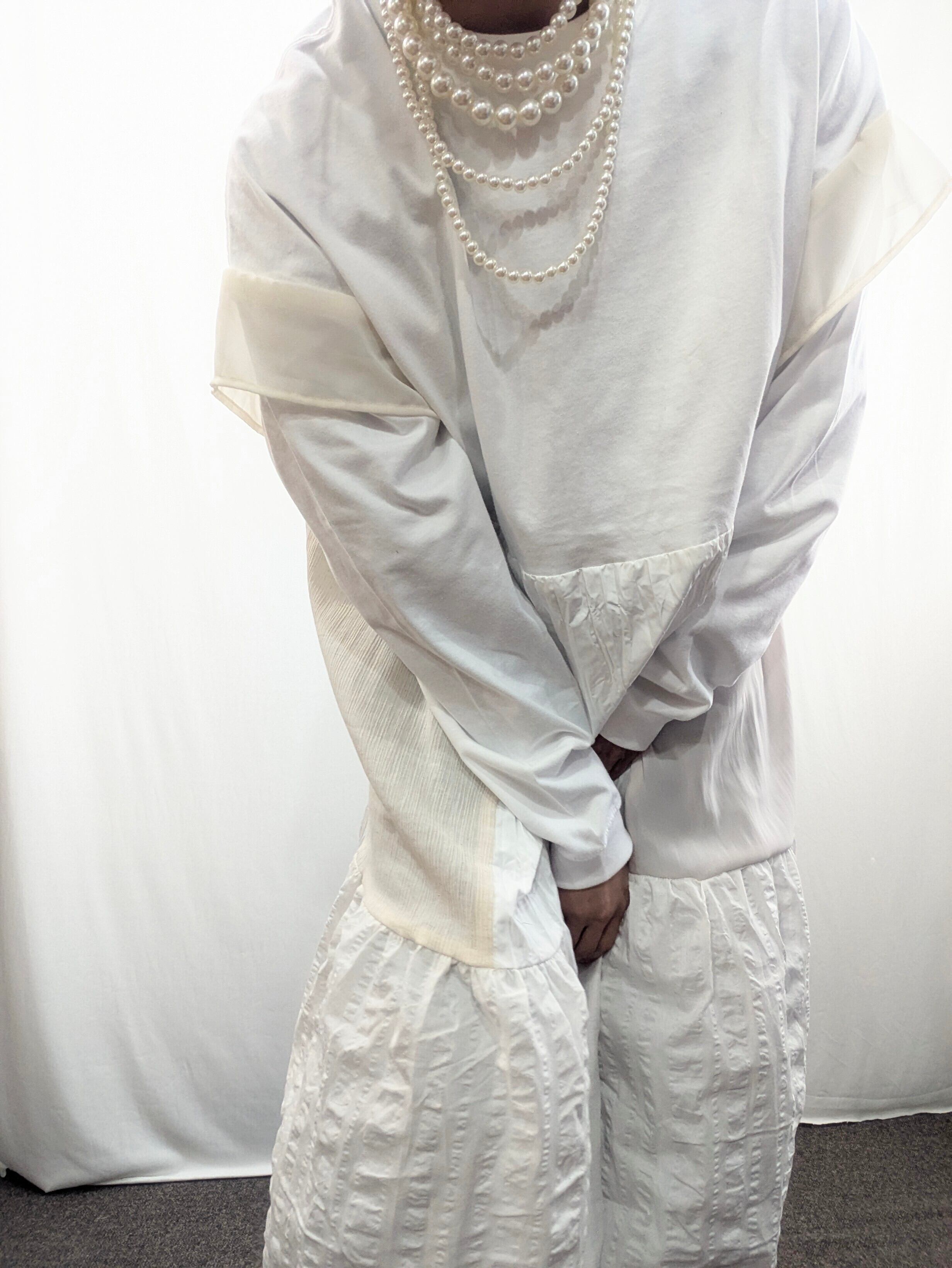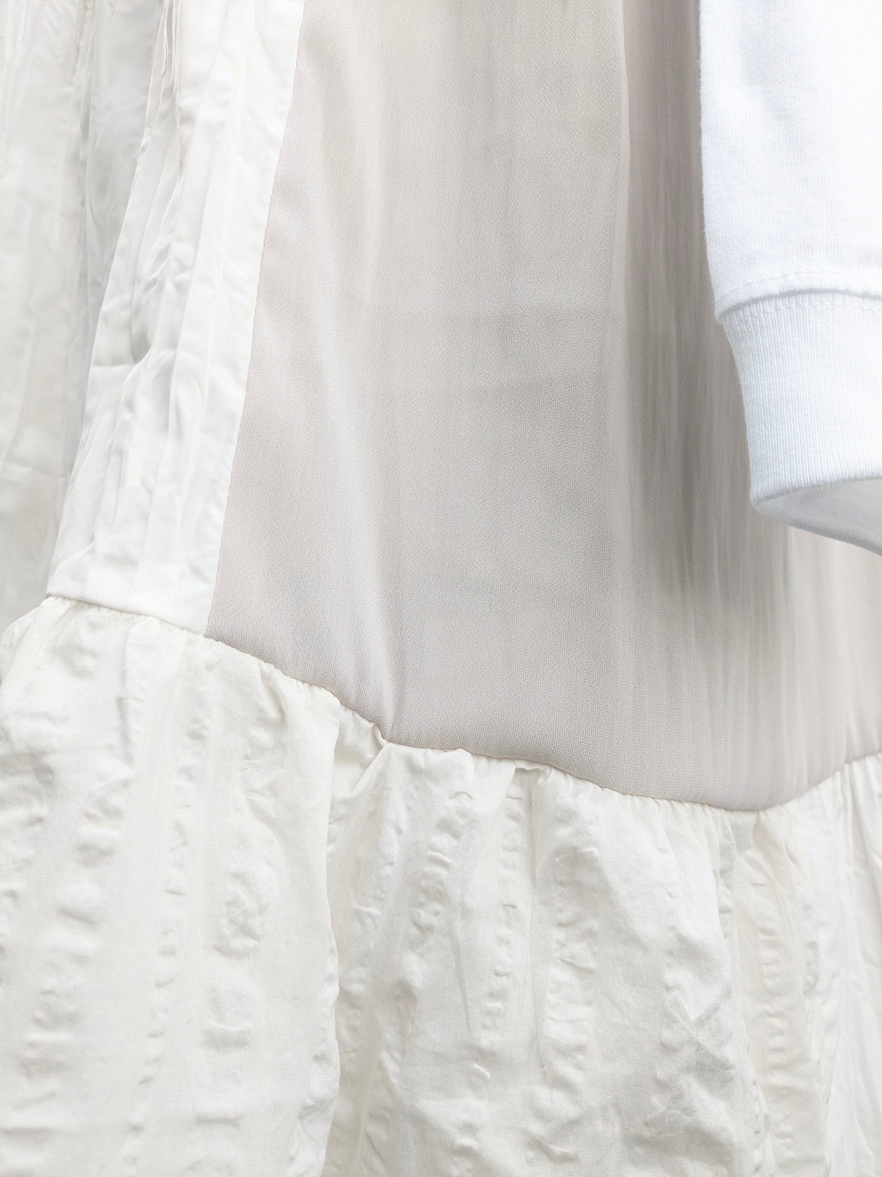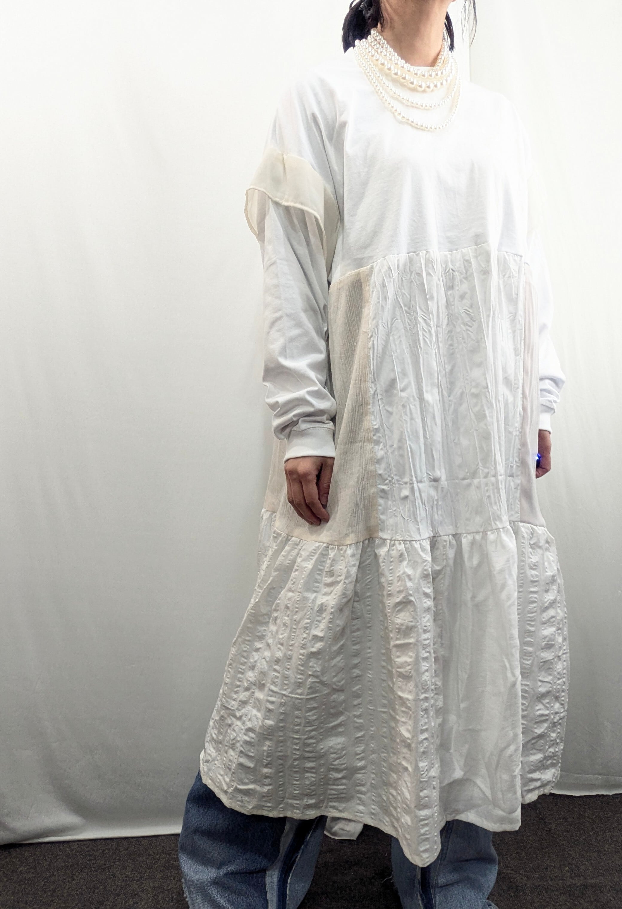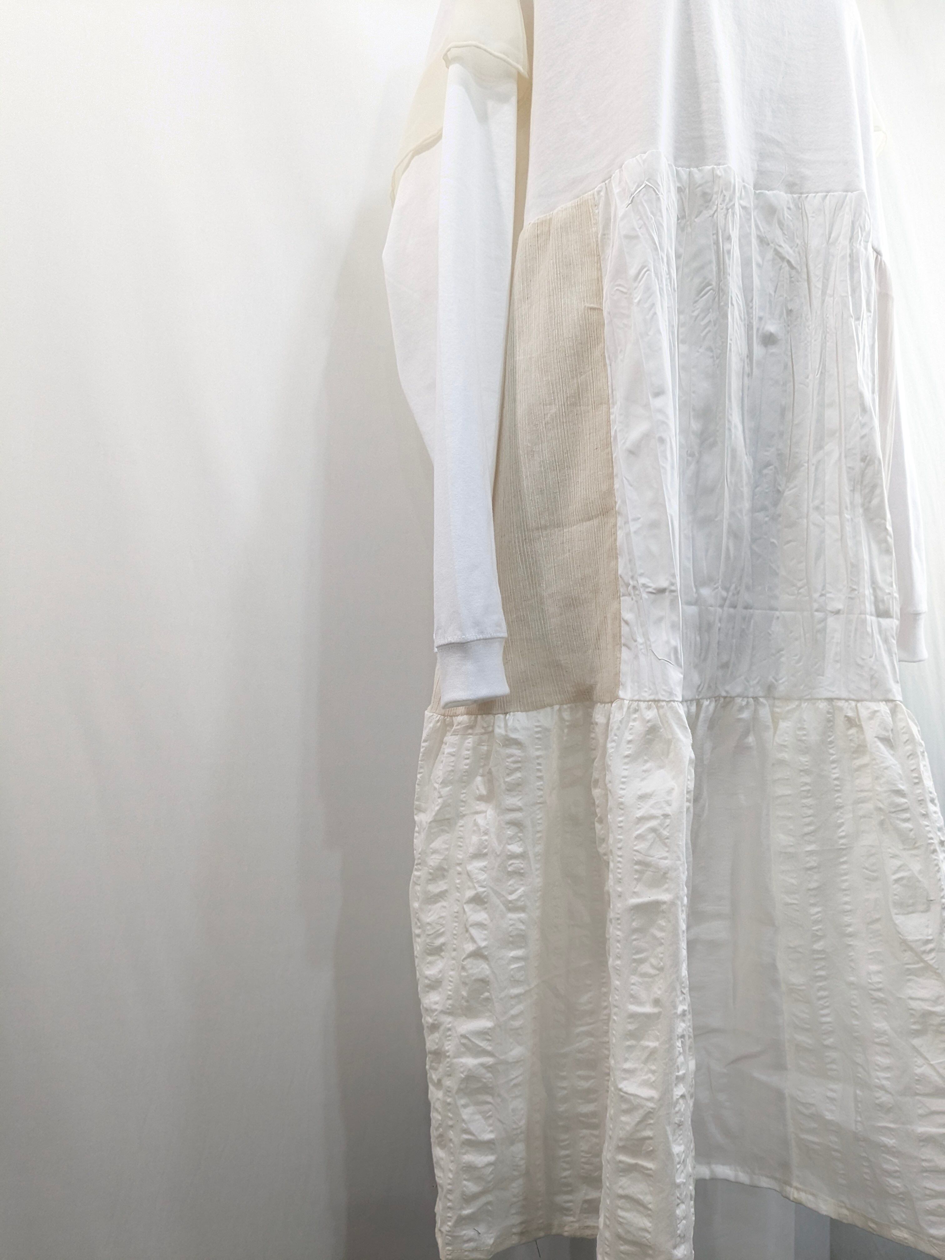 »デザインーロンティをベースに数種類の生地でパッチワークされたフレア素材をドッキングしたワンピースです。