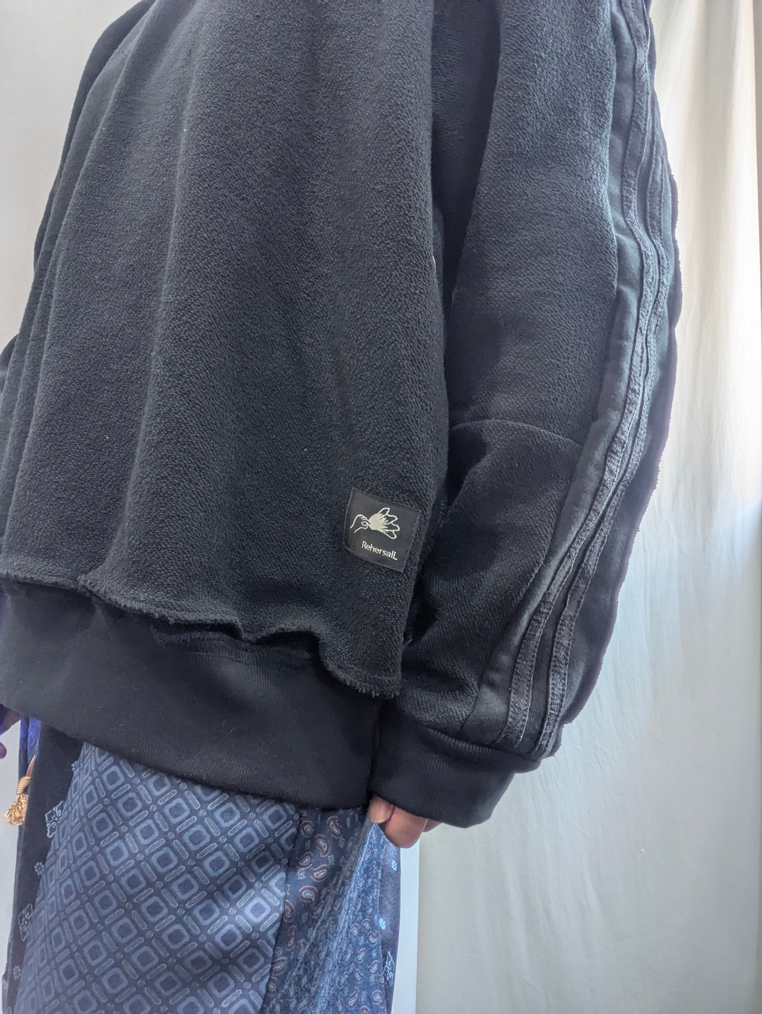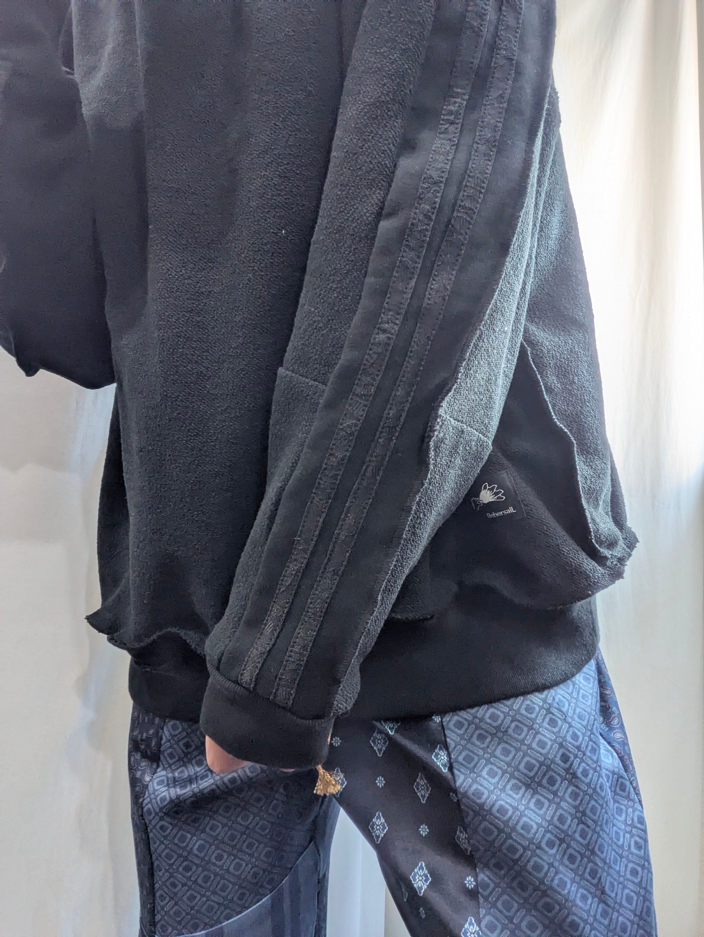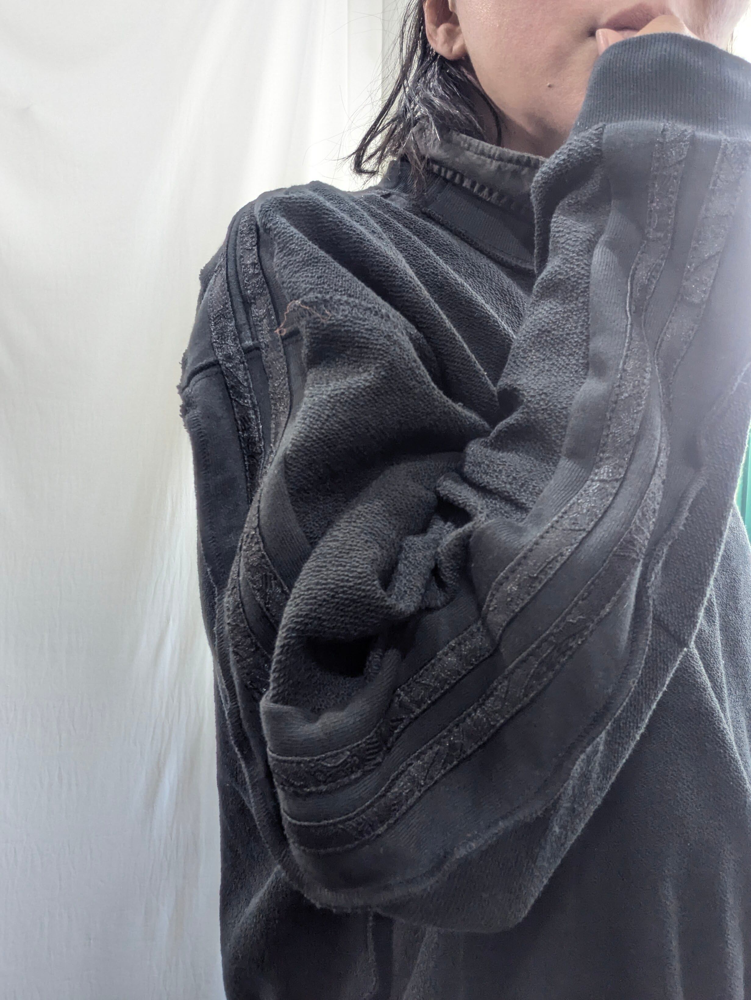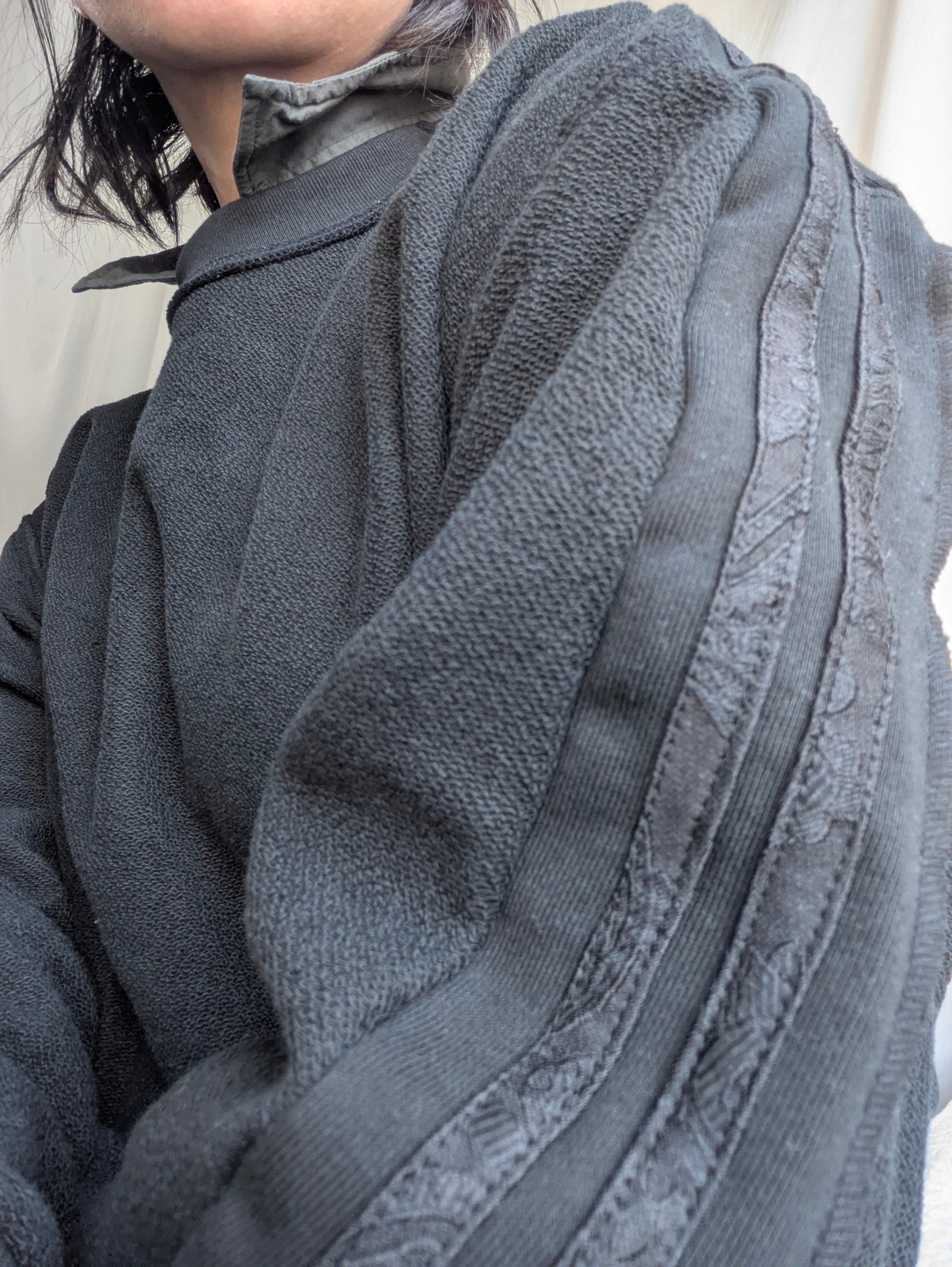 »デザインーパイル地のスウェットを裏仕様でリメイクしています。裏のパイルを表使いにし、肩にジャガード生地の2本のラインが一直線に入っています。凸凹の立体的なジャガードの異素材が高級に見えます。