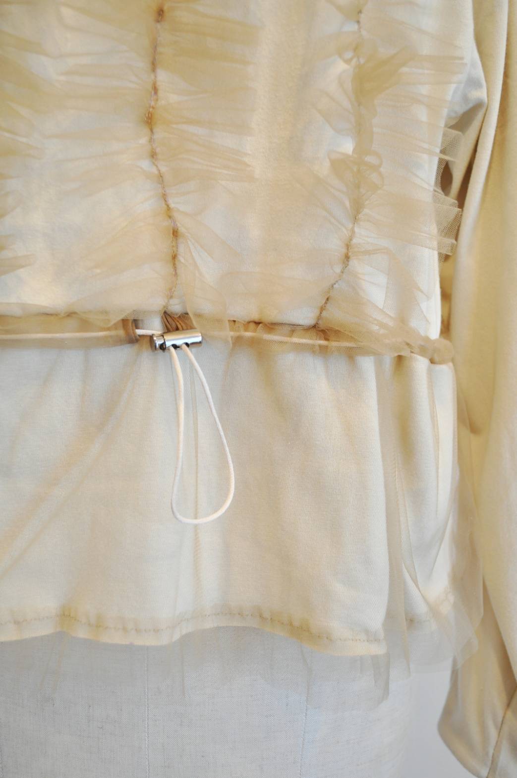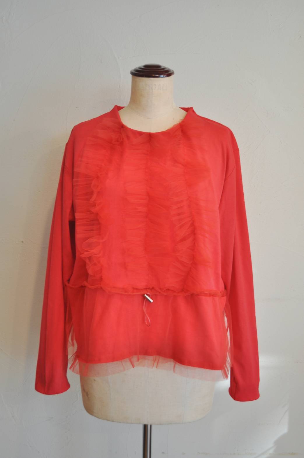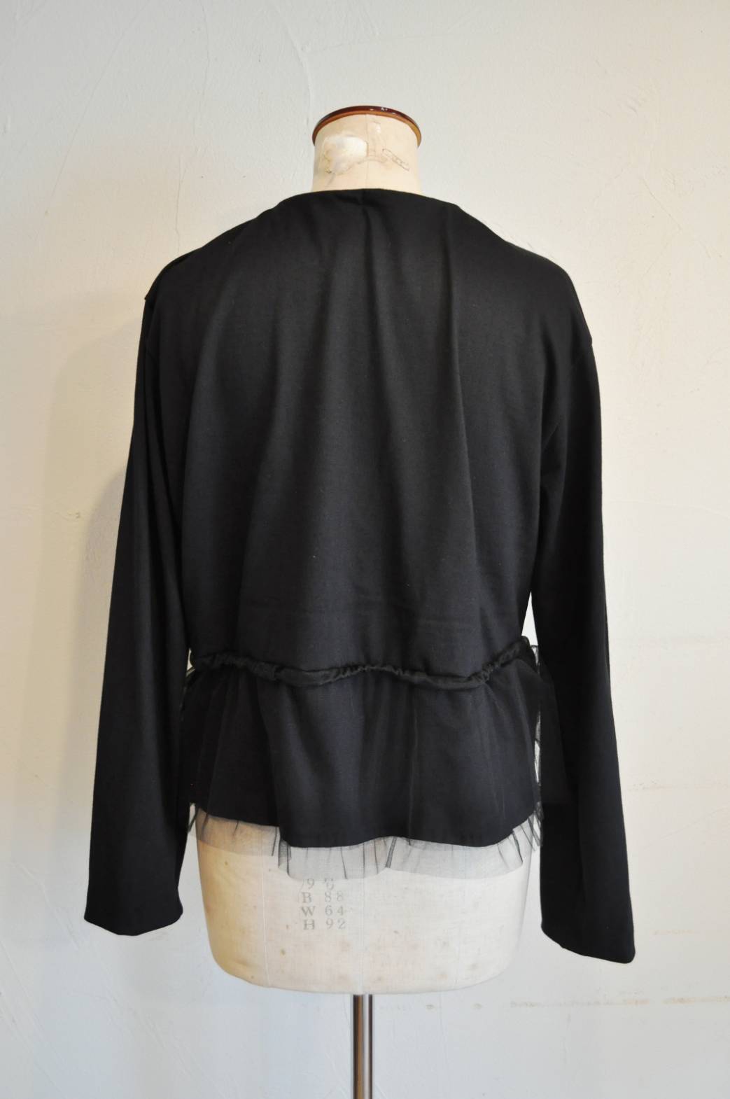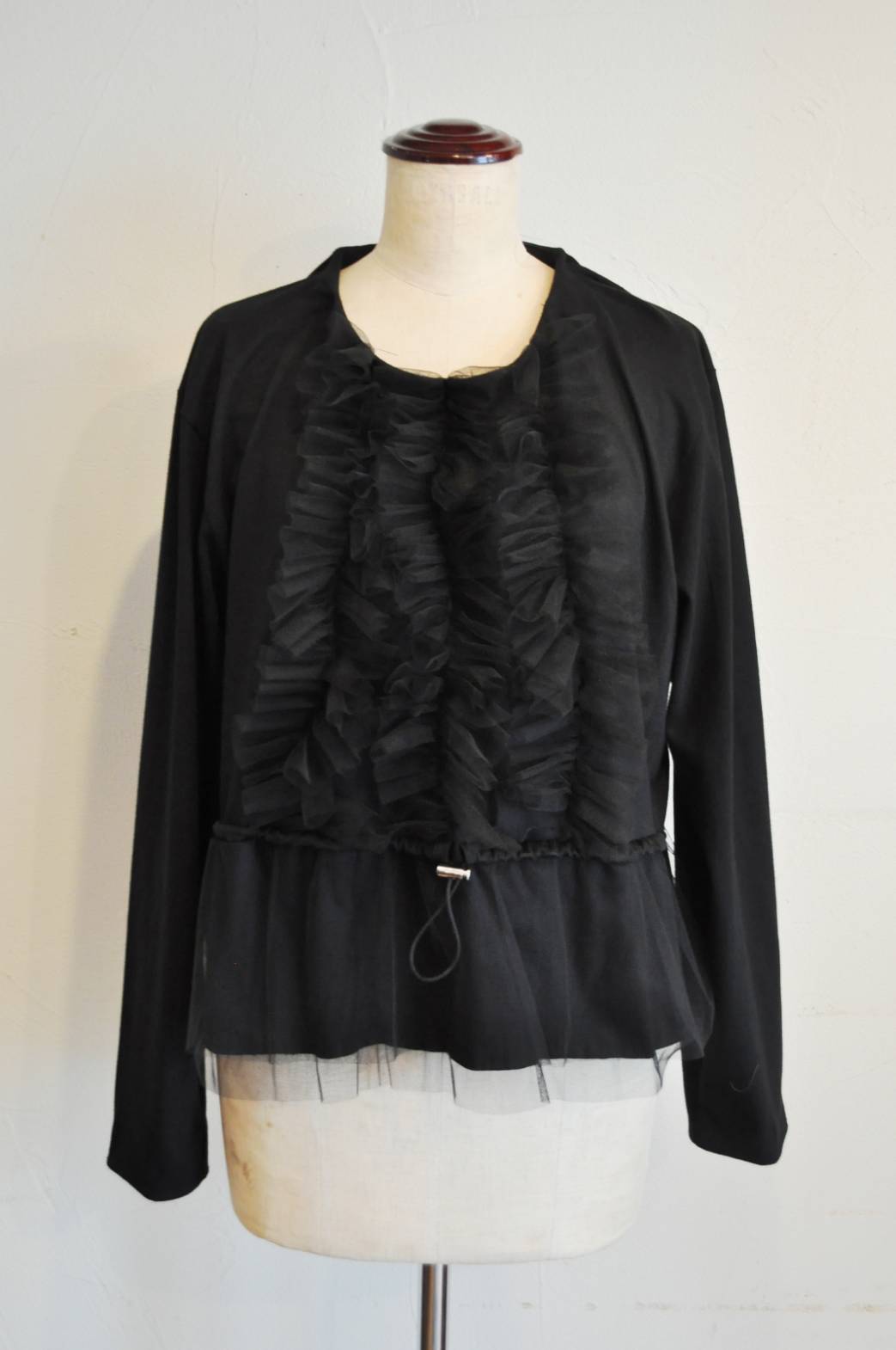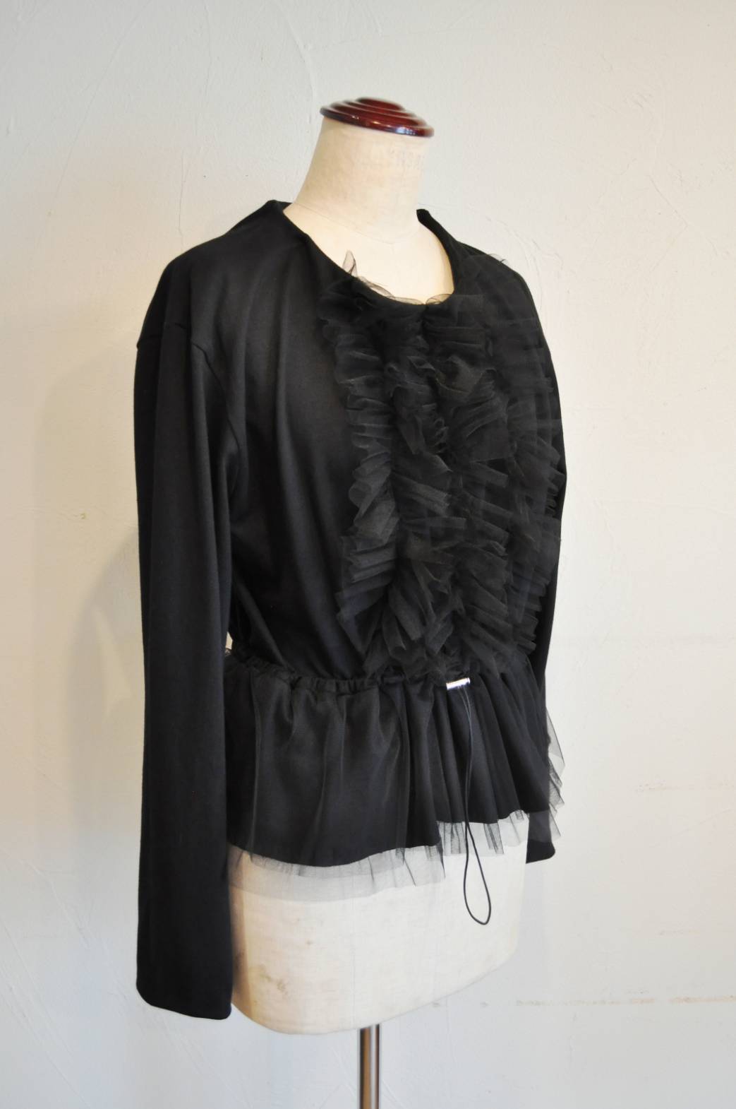 »デザインー縦向きにフリルが緩やかなカーブであしらわれたゴージャスな1枚。襟ぐり、袖口はリブを中に折り込んであり、着やすいながらもカジュアル過ぎないデザインです。