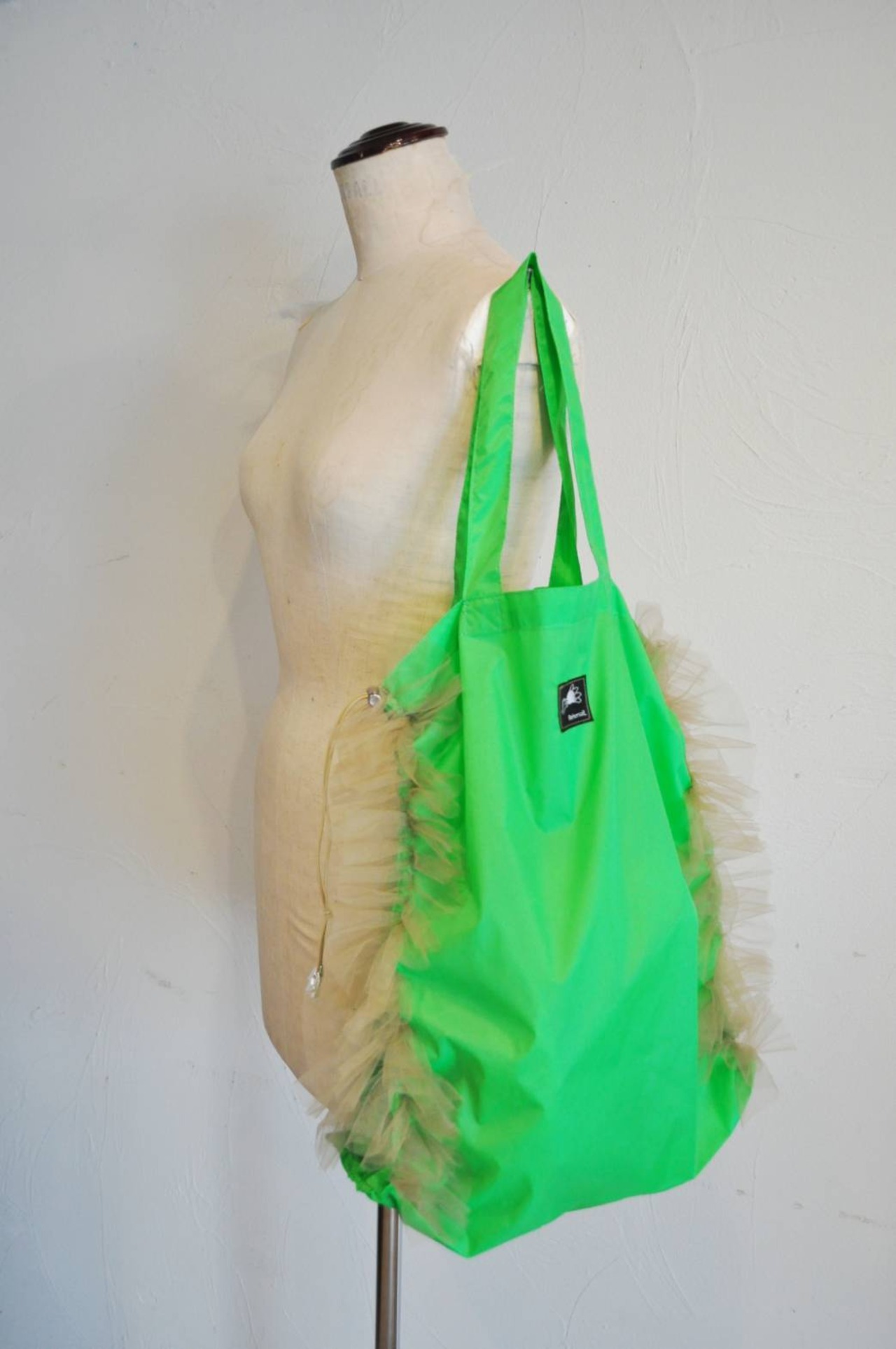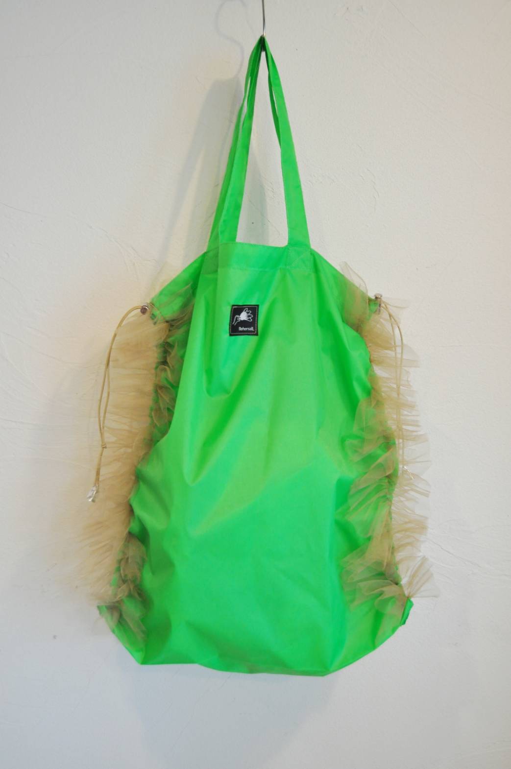 »デザインー縦ラインのフリルにドロストコードが付いたポップなトートバックです。大容量のマチ付きで、お好みに合わせてサイドをブラウジング出来ます。ナイロン素材で使い勝手が抜群です!